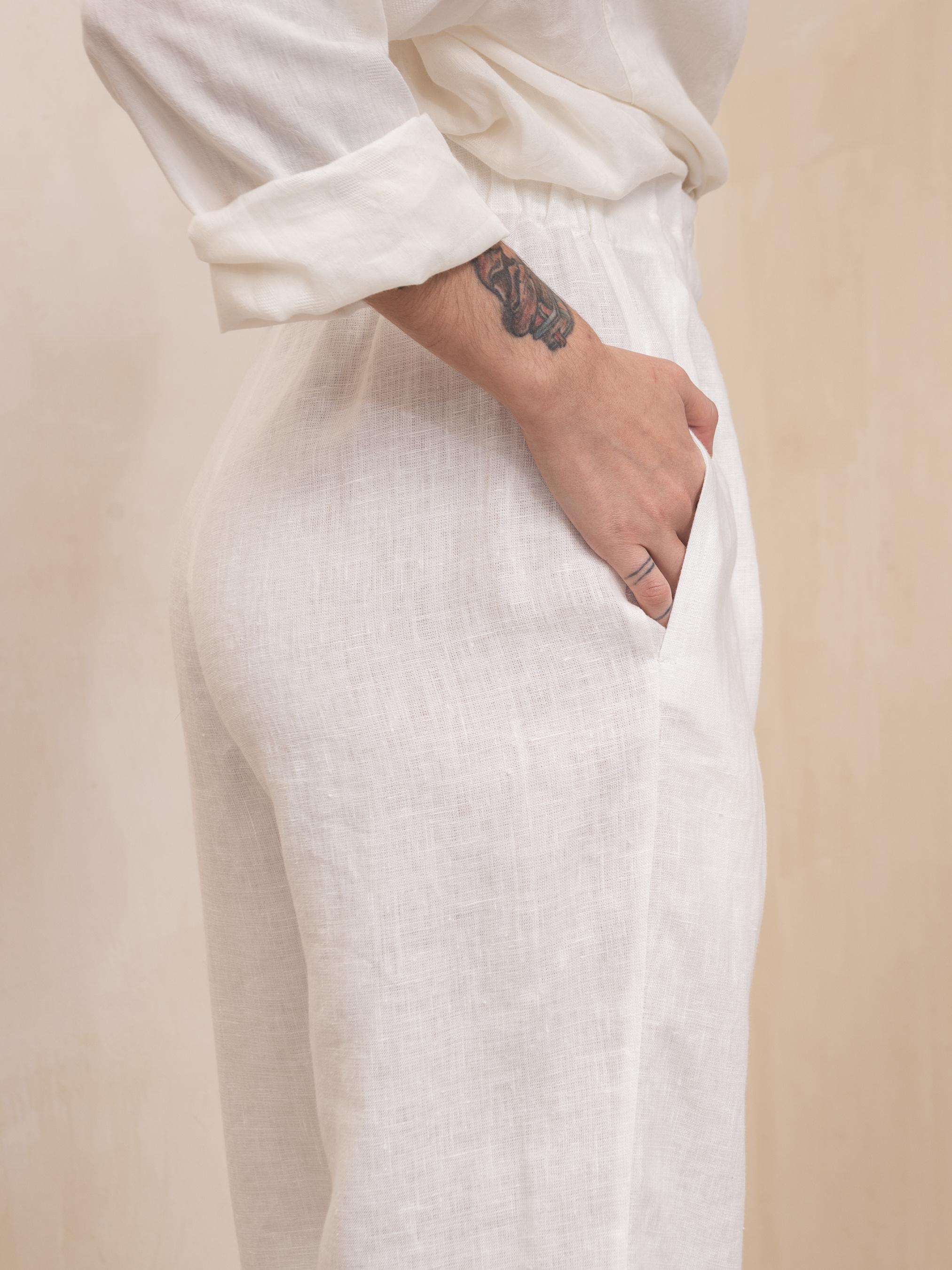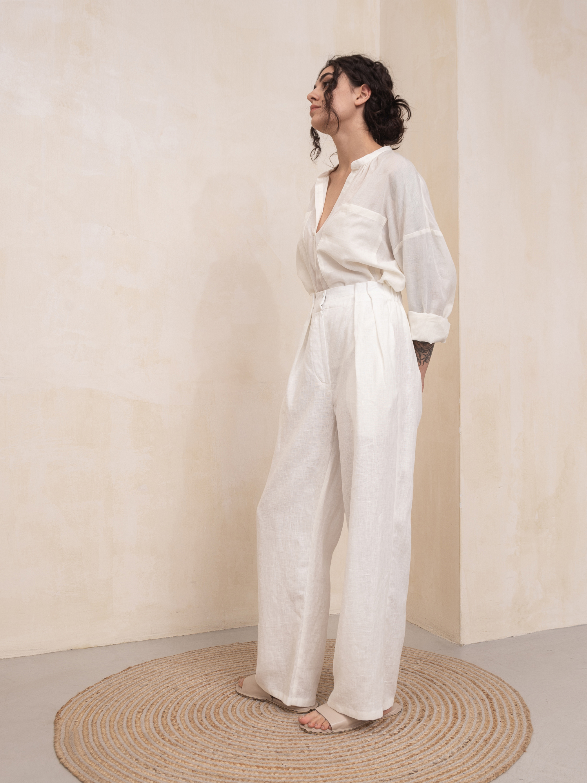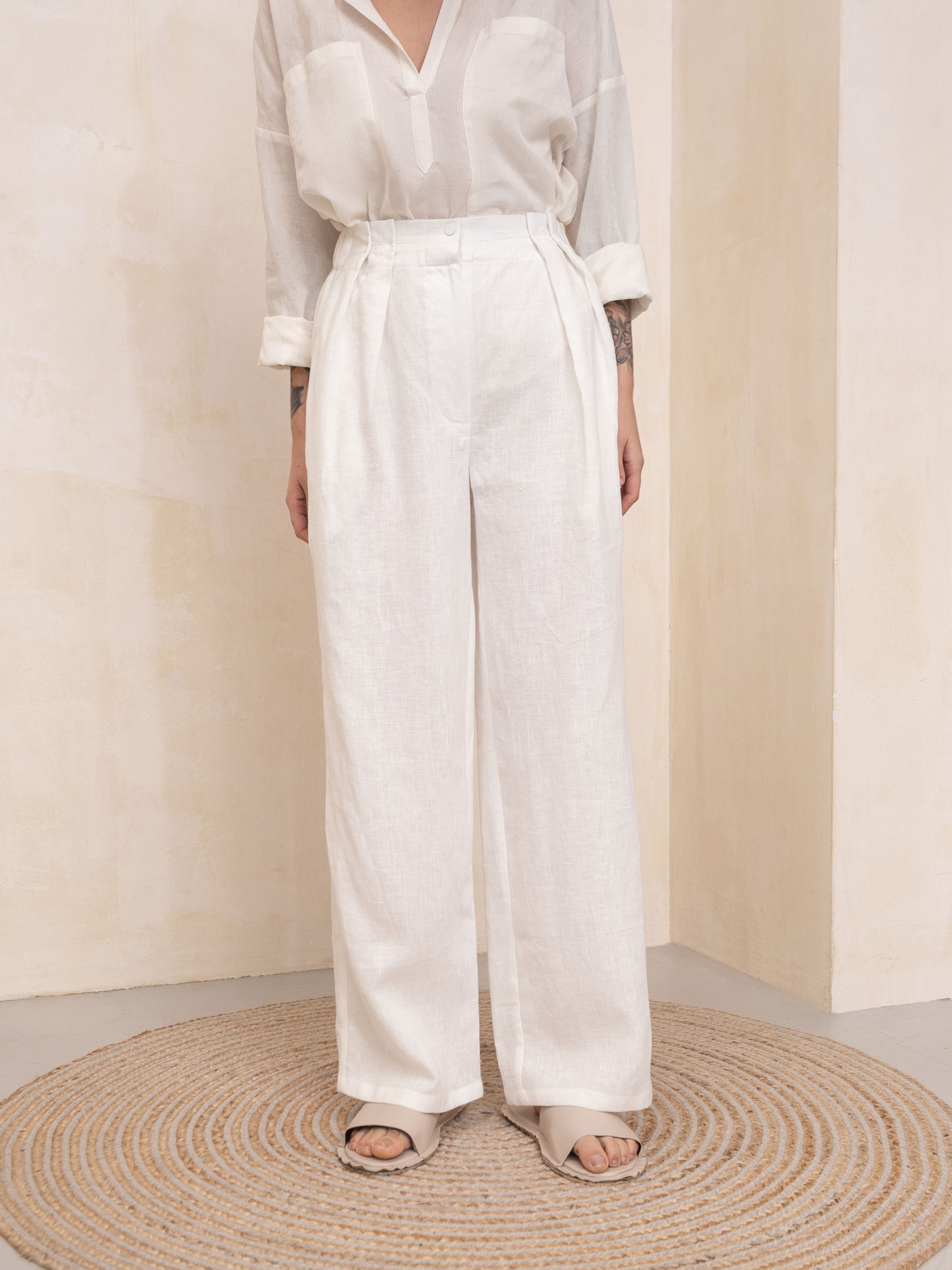 Роскошные брюки Emerie, изготовленные из 100% льна, являются обязательной вещью современного гардероба. Эти брюки создают вневременной силуэт, который можно надевать с любым случаем. Высокая талия, расслабленные штанины, застежка на молнию и пуговицы, складки на талии, которые регулируются по глубине, функциональные боковые карманы, без подкладки, эластичная задняя часть на резинке. Размер НК 1 (S-M): Талия 66см, Талия растянутая 78см, Бедра 109см, Длина 107см, Длина внутренняя 75см, Длина сидения 75см, Ширина низа 51cm Размер НК 2 (L-XL): Талия 79cm, Талия растянутая 105cm, Бедра 120cm, Длина 107cm, Длина 107cm, Длина внутренняя 75cm, Длина сиденья 77cm, Ширина низа 56cm