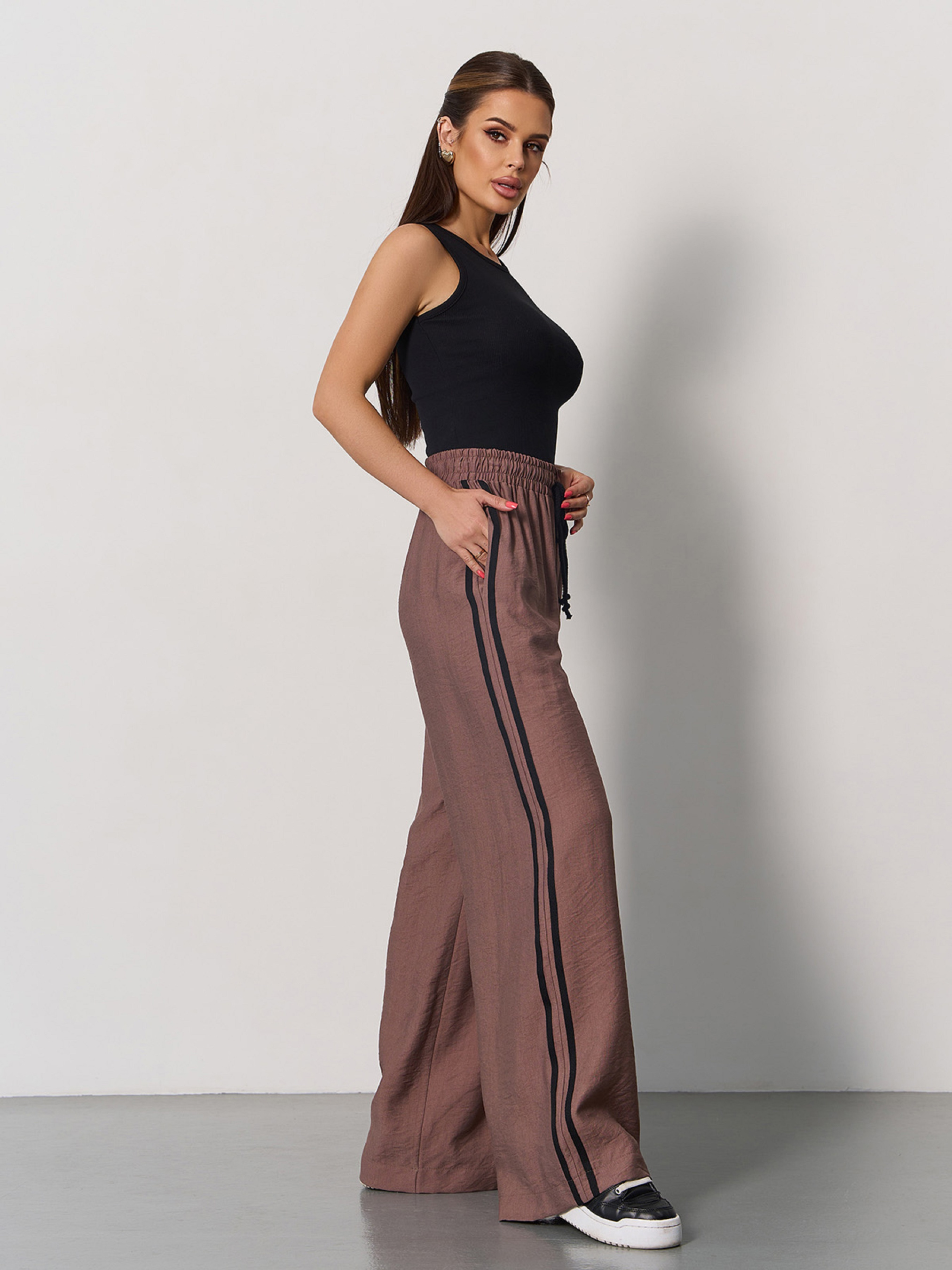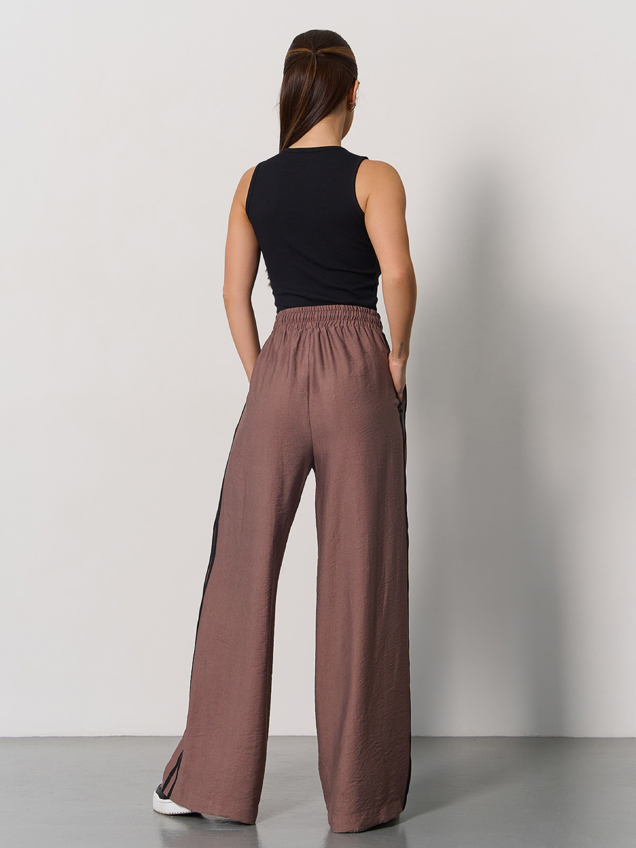 Широкие коричневые брюки прямого кроя с боковыми двойными лампасами. Брюки из жатого льна с высокой посадкой и шнурком на поясной резинке. Модель с карманами. Полуобхват: Талия: S (31-39), M (33-41), L (35-43), XL (37-45), Бедра: S (58), M (60), L (62), XL (64), Длина изделия - 101, Длина внутреннего шва - 72, Ткань: Низкой эластичности. Состав: 65% лен, 20% хлопок, 15% полиэстер