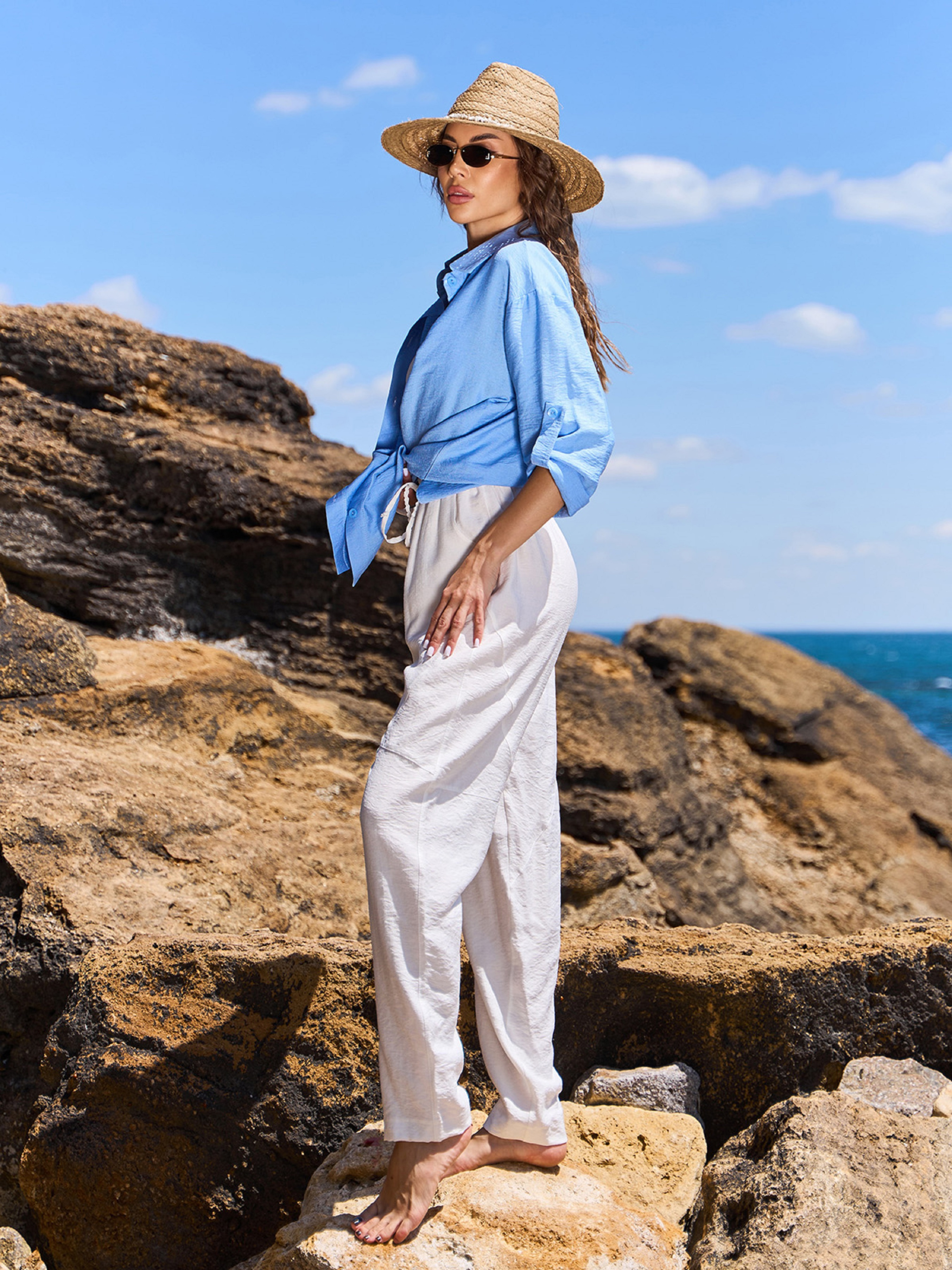 Молочные брюки бананы высокой посадки на талии и зауженным к низу кроем, выполненные из текстурированного льняного материала. Брюки на резинке с боковыми карманами и геометрическими швами. Полуобхват: Талия: S (30-40), M (32-42), L (34-44), XL (36-46), Бедра: S (52), M (54), L (56), XL (58), Длина изделия - 101, Длина по внутреннему шву - 73, Ткань: Низкой эластичности.