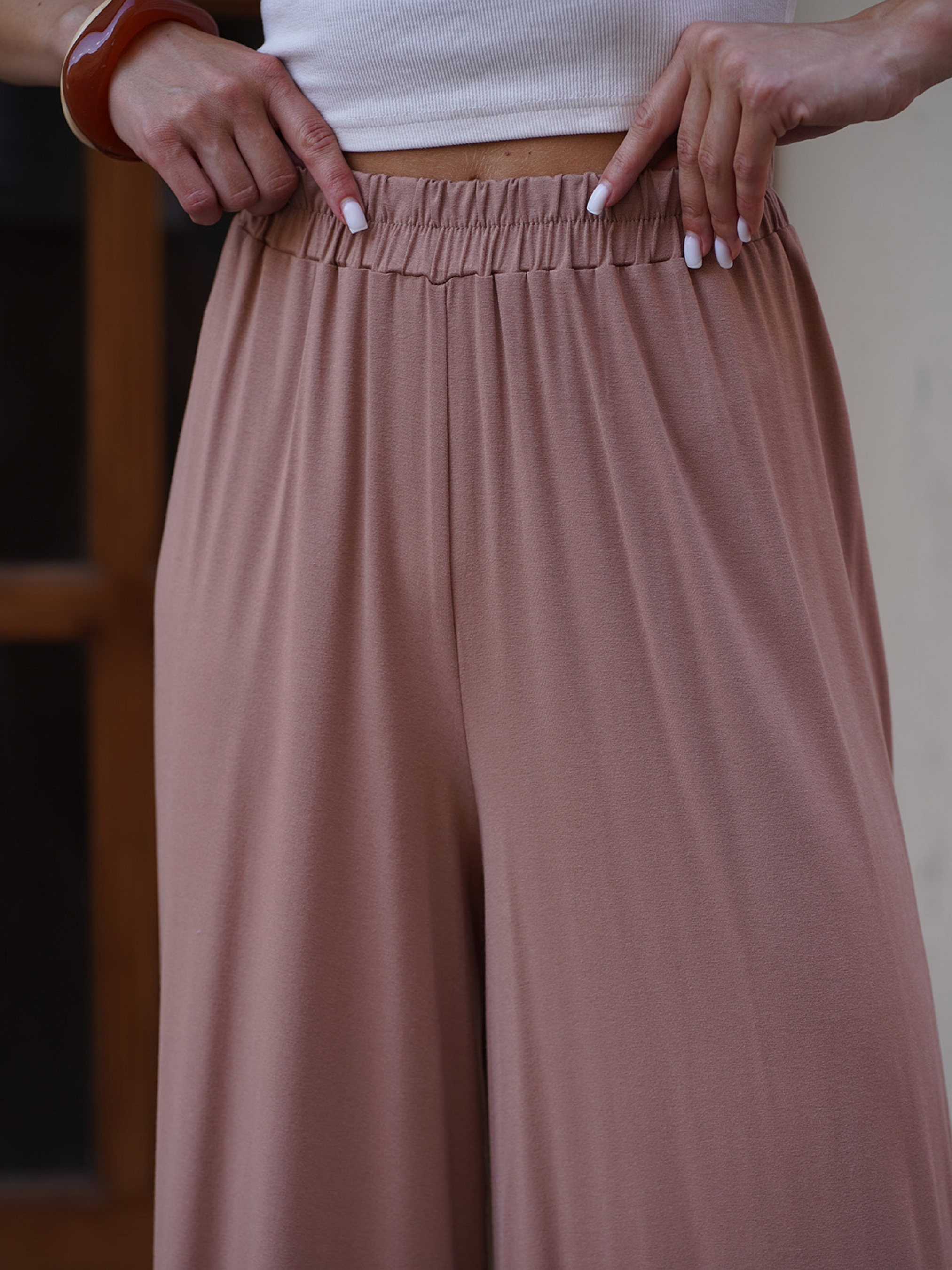 Широкие прямые штаны высокой посадки, выполненный из светло-бежевого вискозного тонкого трикотажа. Брюки свободного оверсайз кроя с поясной резинкой. Полуобхват: Талия: S (30-38), M (32-40), L (34-42), XL (36-44), Бедра: S (52), M (54), L (56), XL (58), Длина изделия - 98-104*, Длина внутреннего шва - 70-72*, Ткань: Высокой эластичности.