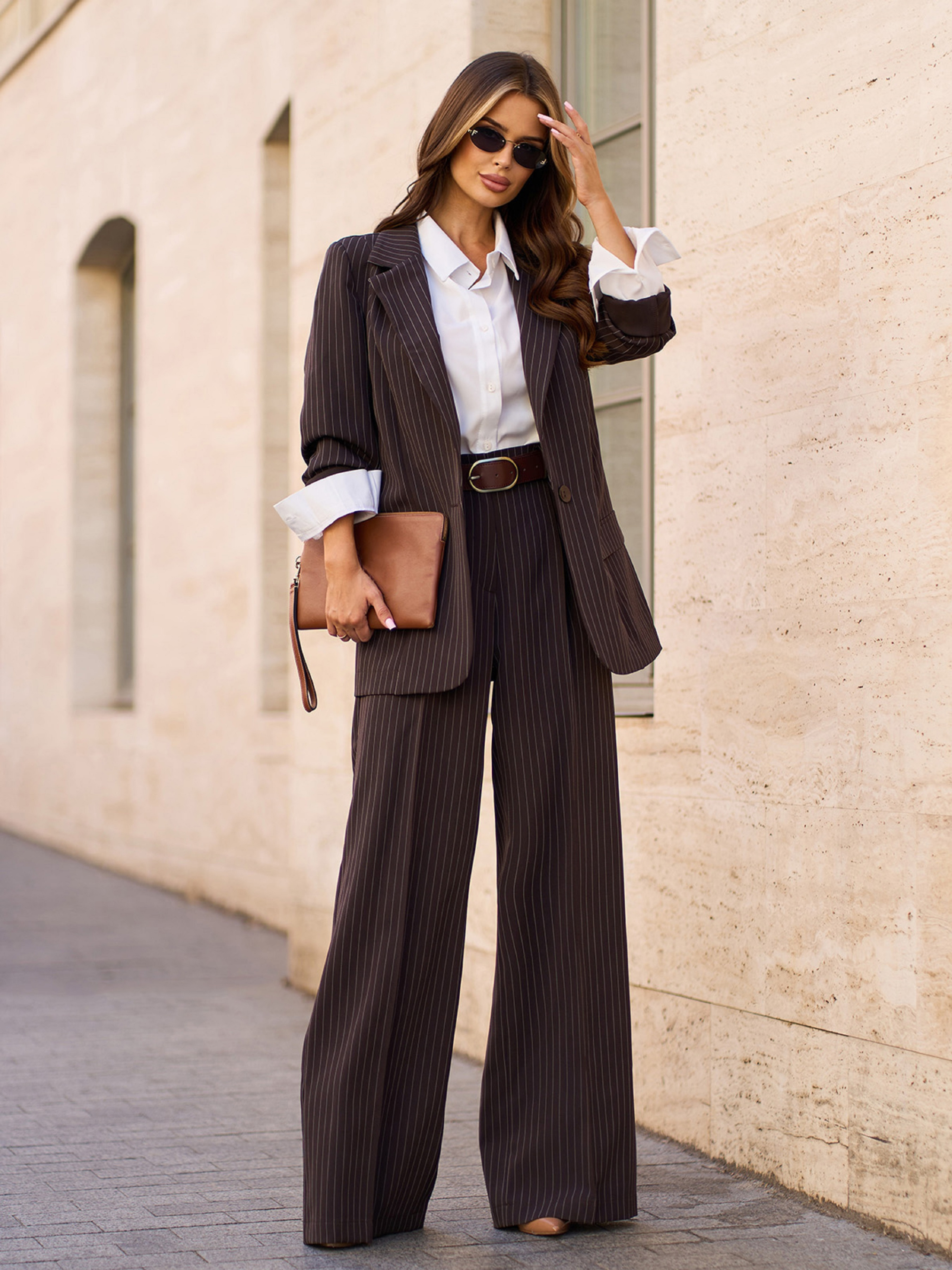 Темно-коричневые полосатые брюки из костюмки со стрелками и высокой посадкой. Модель широкого прямого кроя с карманами. Брюки на молнии и пуговице декорированы защипами. Полуобхват: Талия: S (32), M (34), L (36), XL (38), XXL (40), 3XL (42), Бедра: S (52), M (54), L (56), XL (58), XXL (60), 3XL (62), Длина изделия - 110, Длина по внутреннему шву - 81, Ткань: Низкой эластичности.