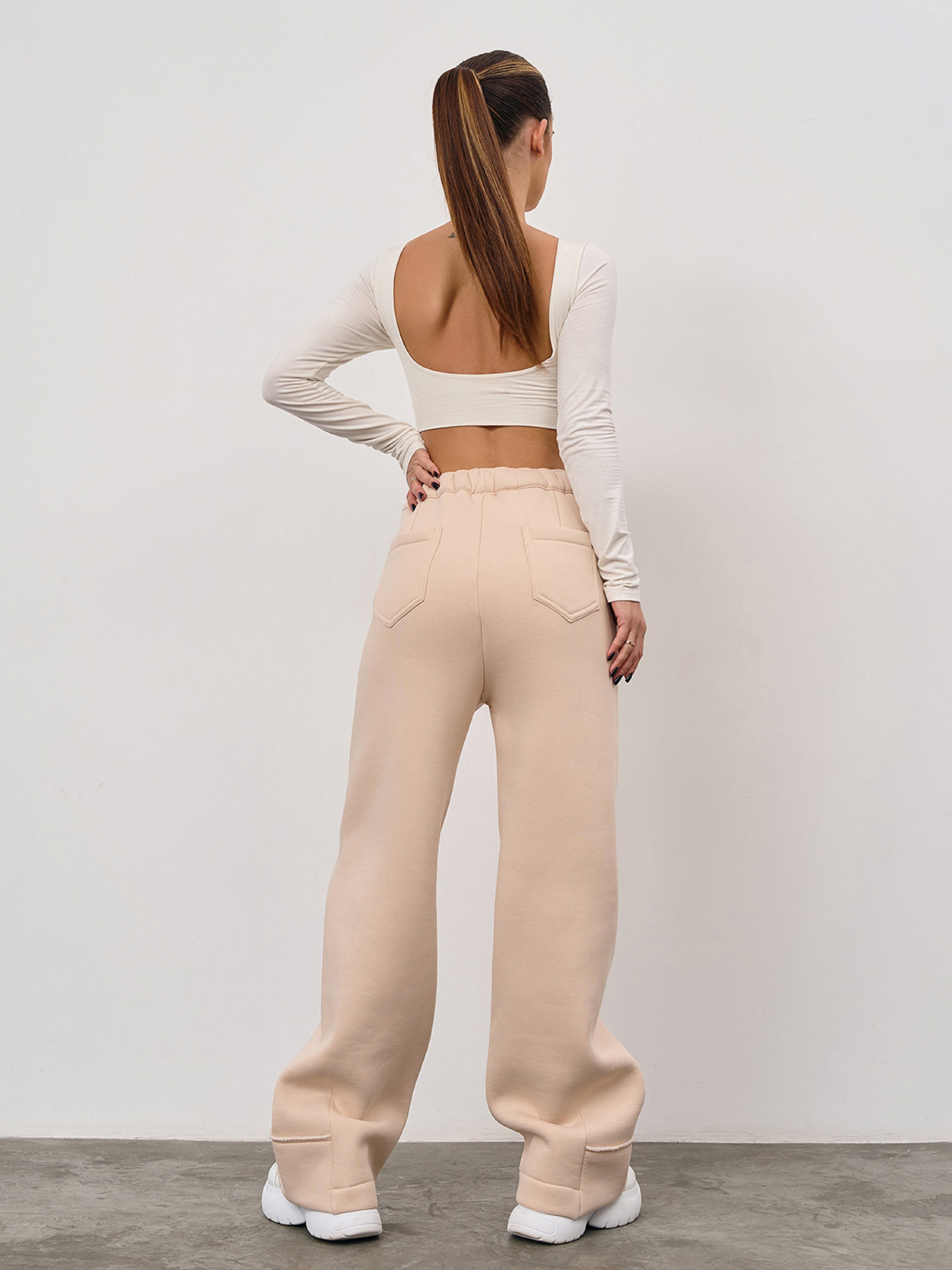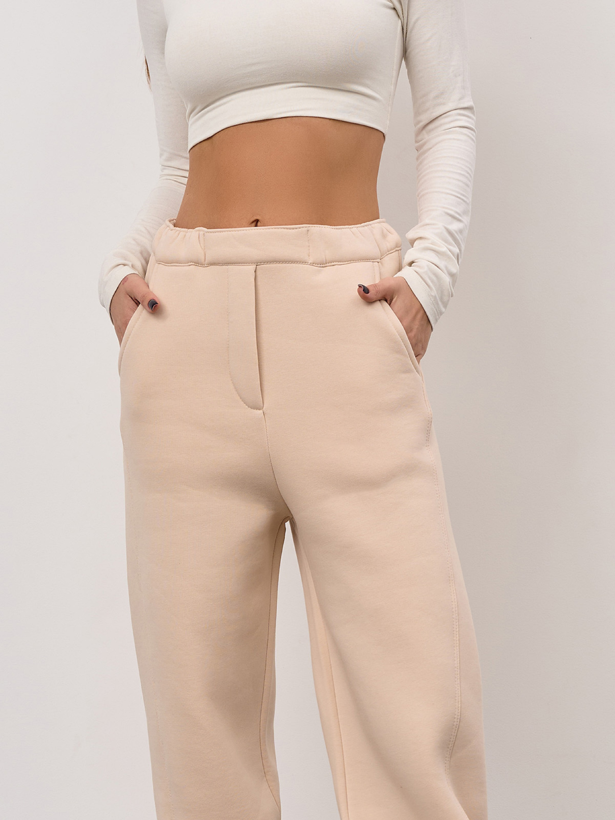 Утепленные штаны багги на поясной резинке с диагональными швами. Модель широкого кроя оснащена задними и боковыми карманами. Спереди декоративный гульфик, материал брюк - бежевый трикотаж на флисе (Пенье). Полуобхват: Талия: S (32-40), M (34-42), L (36-44), XL (38-46), Бедра: S (48), M (50), L (52), XL (54), Длина изделия - 105, Длина по внутреннему шву - 74, Ткань: Низкой эластичности.