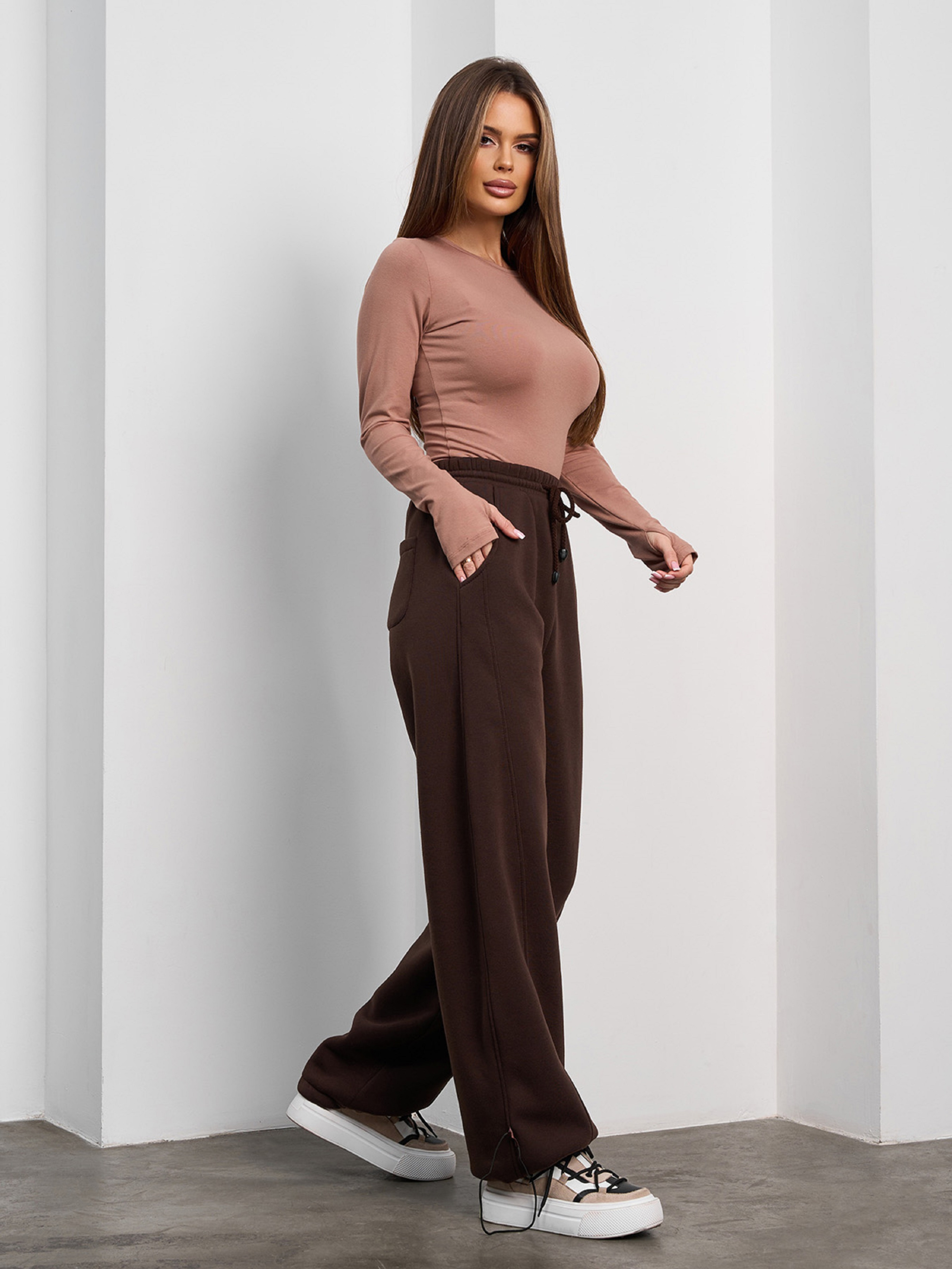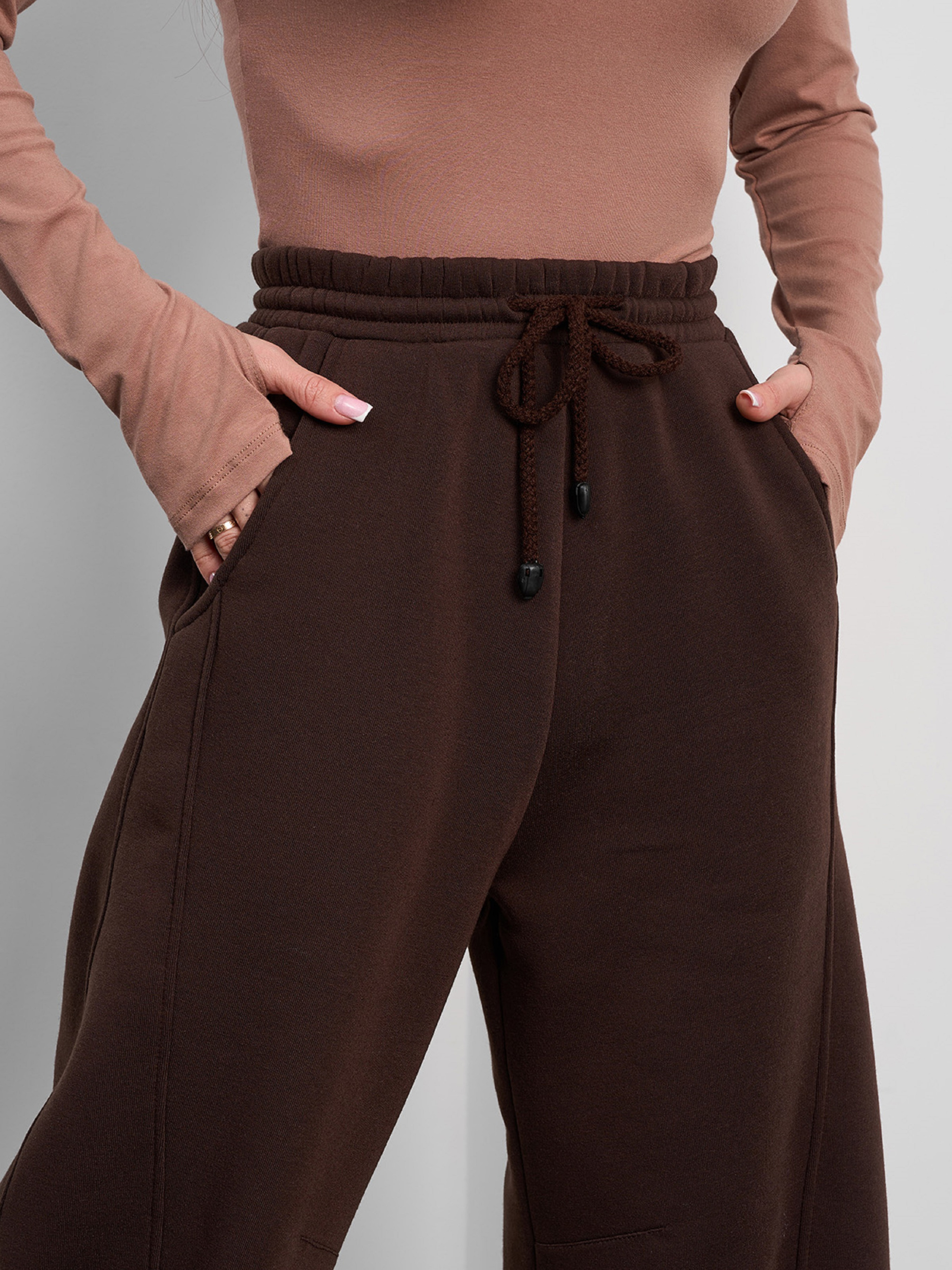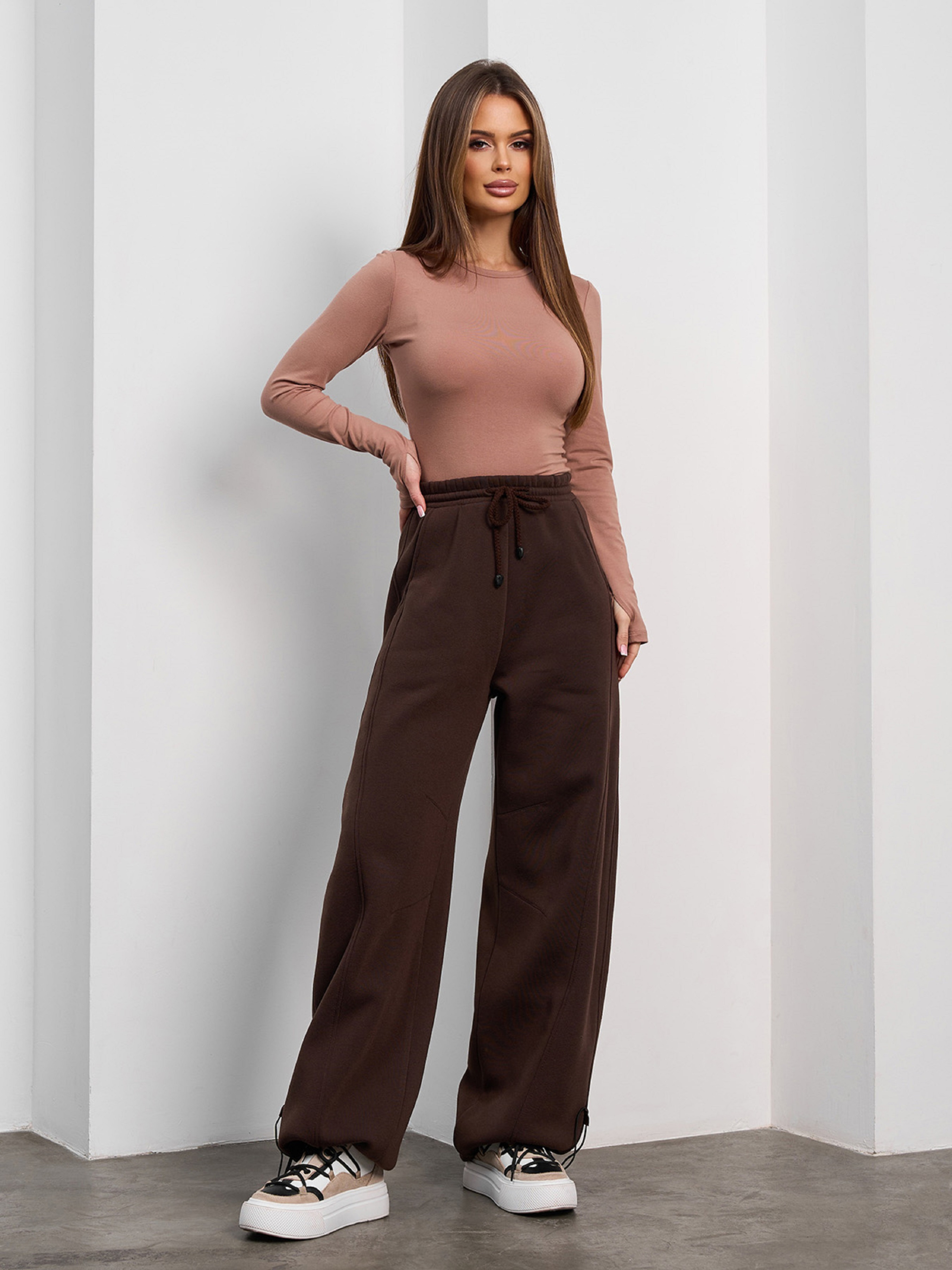 Утепленные брюки баггииз темно-коричневого трикотажа на флисе с диагональными боковыми швами. Модель со шнуровкой и поясной резинкой оснащена карманами. Брюки свободного широкого кроя с кулисками по нижнем у краю. Полуобхват: Талия: S (32-40), M (34-42), L (36-44), XL (38-46), XXL (40-48), 3XL (42-50), Бедра: S (52), M (54), L (56), XL (58), XXL (60), 3XL (62), Длина изделия - 107, Длина по внутреннему шву - 74, Ткань: Средней эластичности.