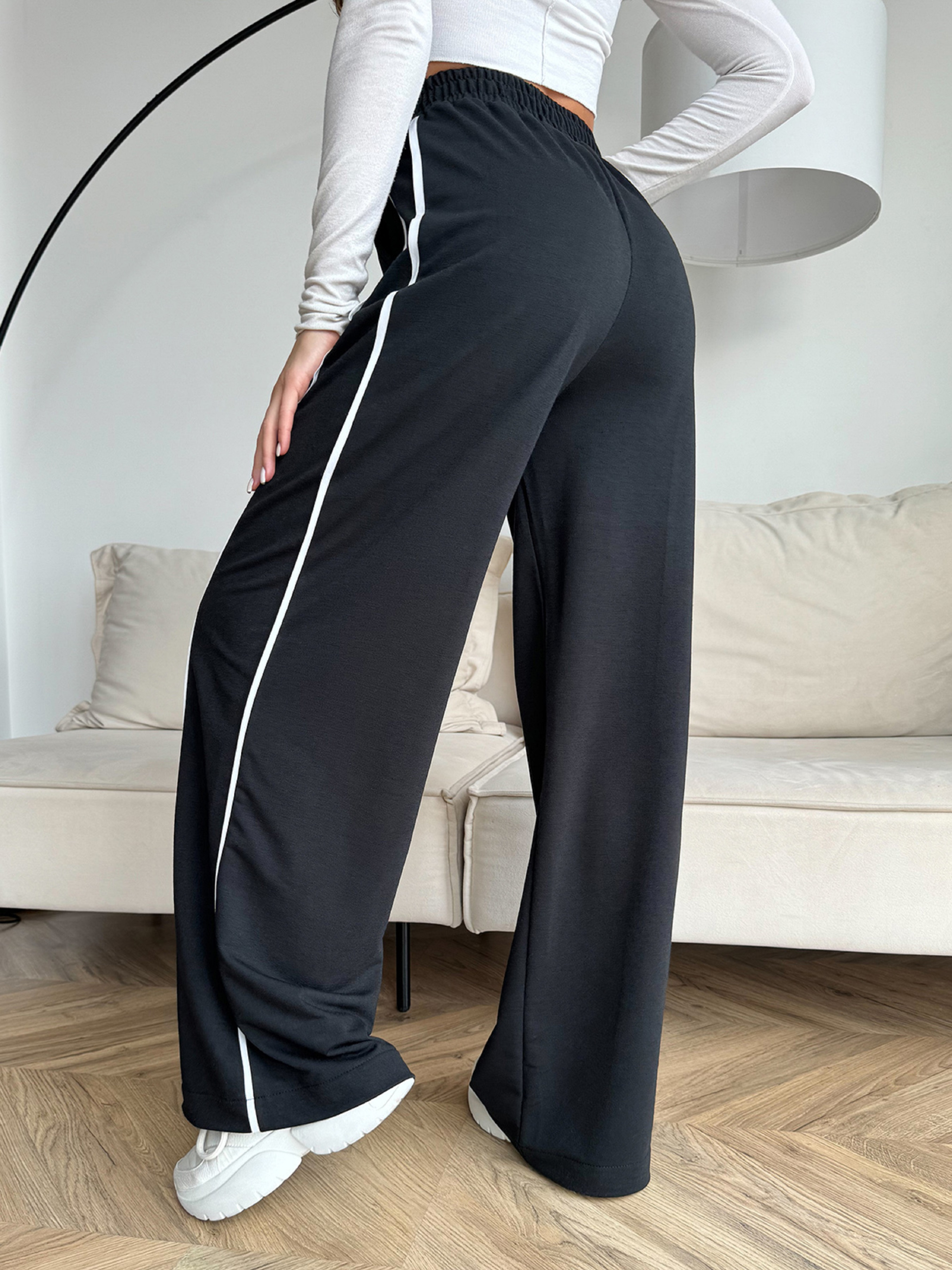 Черные широкие спортивные штаны высокой посадки, выполненные из трикотажа пенье с белыми тесемками. Модель прямого свободного кроя с поясной резинкой и карманами. Полуобхват: Талия: S (30-48), M (32-50), L (34-52), XL (36-54), XXL (38-55), 3XL (40-58), Бедра: S (52), M (54), L (56), XL (58), XXL (60),3XL (62), Длина изделия - 106, Длина по внутреннему шву -78, Ткань: Низкой эластичности.