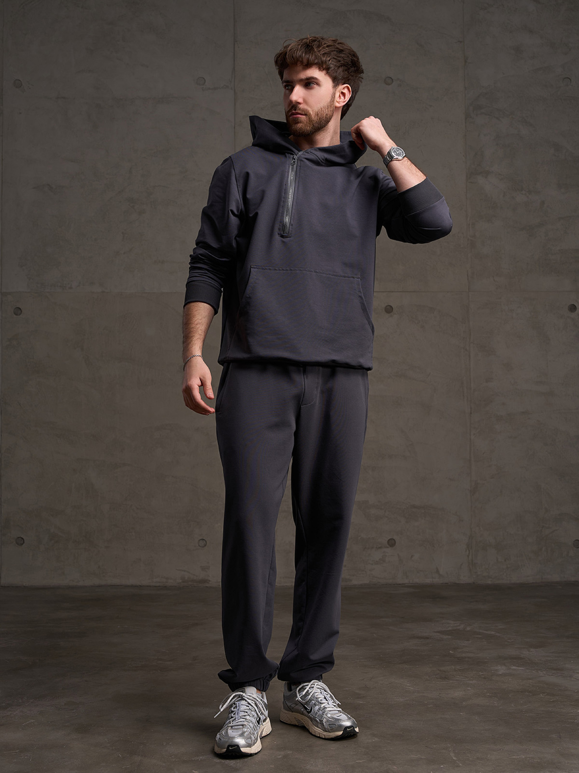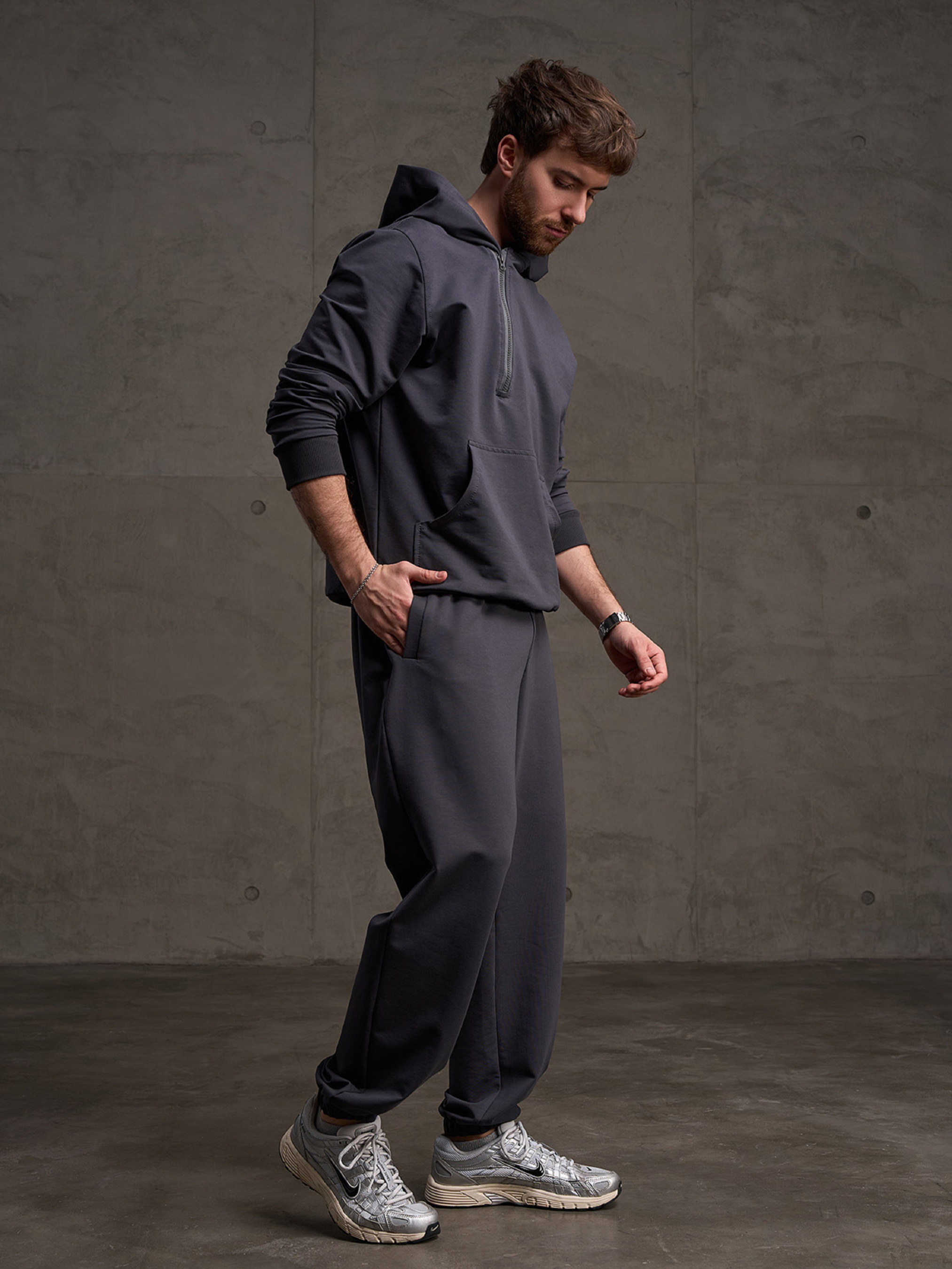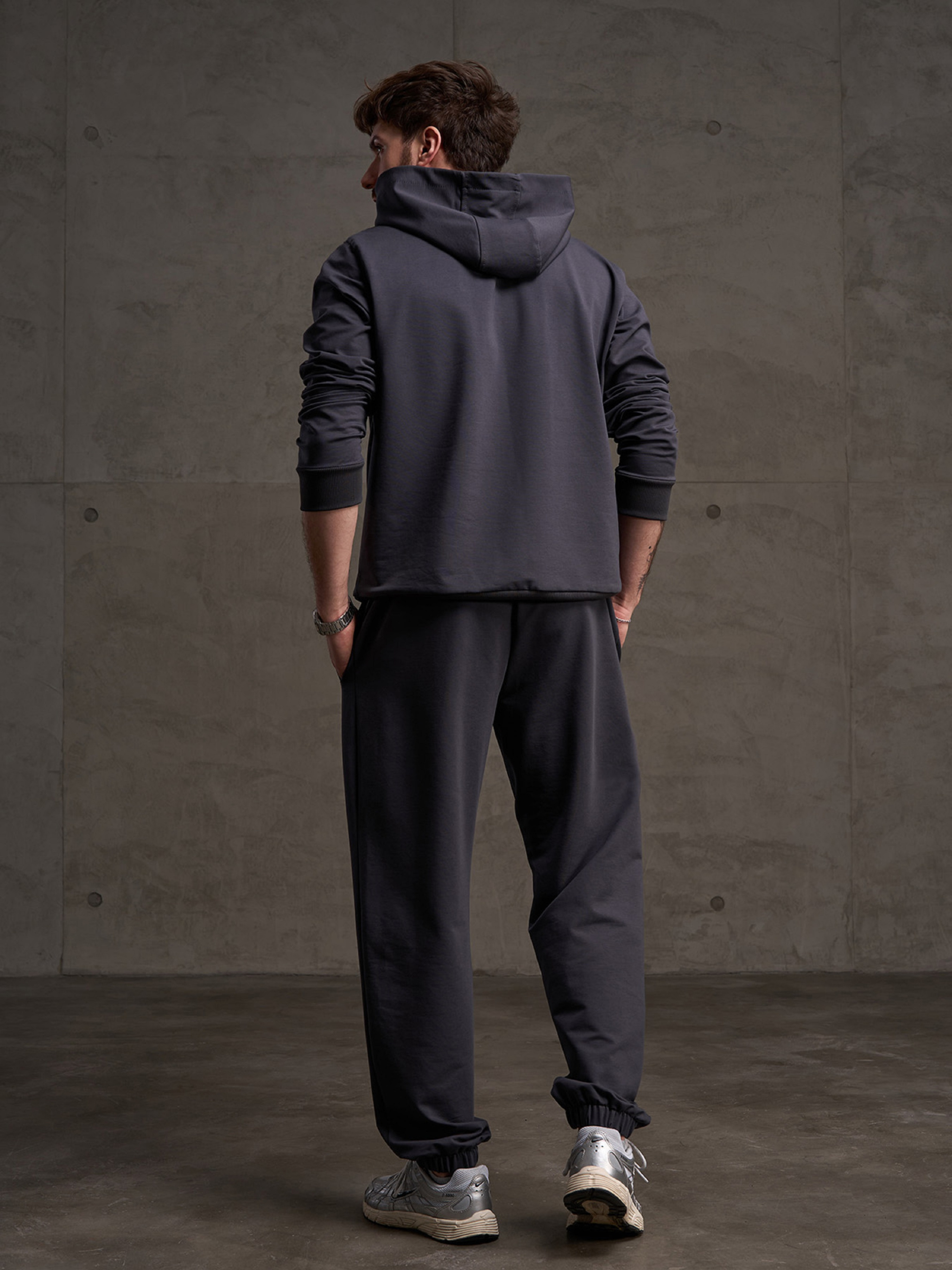 Серые брюки джоггеры на резинках, выполненные из двухнитного трикотажа пенье. Модель свободного кроя с поясной резинкой, шнуровкой и боковыми карманами. Полуобхват: Талия: S (36-44), M (38-46), L (40-48), XL (42-50), XXL (44-52), 3XL (46-54), Бедра: S (56), M (58), L (60), XL (62), XXL (64), 3XL (66), Длина изделия - 102, Длина по внутреннему шву - 76, Ткань: Низкой эластичности.