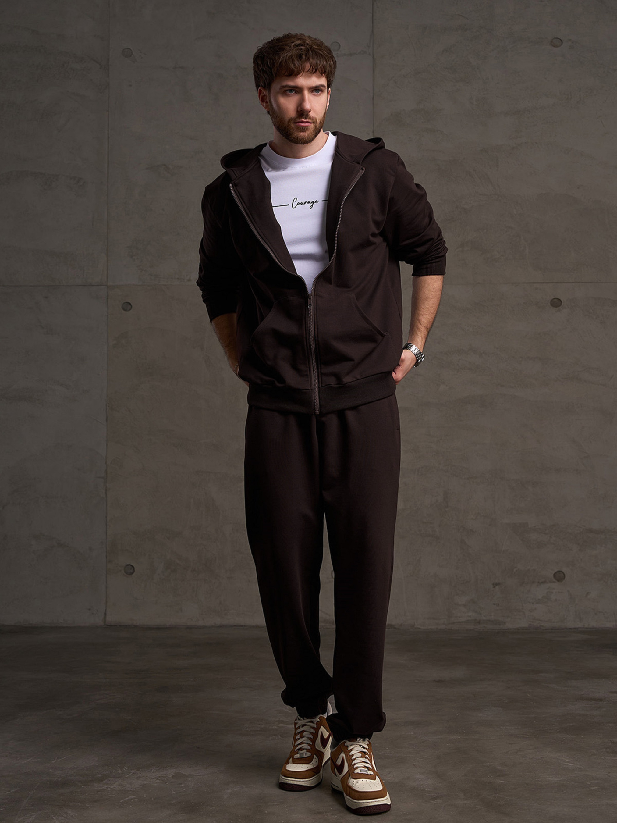 Темно-коричневые брюки джоггеры на резинках, выполненные из двухнитного трикотажа пенье. Модель свободного кроя с поясной резинкой, шнуровкой и боковыми карманами. Полуобхват: Талия: S (36-44), M (38-46), L (40-48), XL (42-50), XXL (44-52), 3XL (46-54), Бедра: S (56), M (58), L (60), XL (62), XXL (64), 3XL (66), Длина изделия - 102, Длина по внутреннему шву - 76, Ткань: Низкой эластичности.