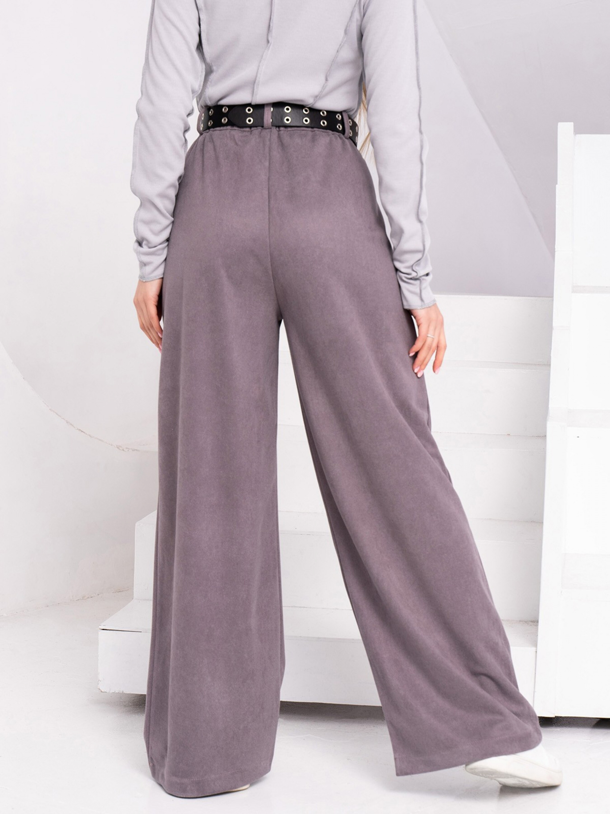 Серые свободные брюки палаццо из эко-замши. Классические брюки палаццо высокой посадки выполненные из фактурной серой эко-замши. Модель на молнии и пуговице оснащена комфортной резинкой сзади и карманами. Изделие широкого кроя с двойными складками в районе талии.