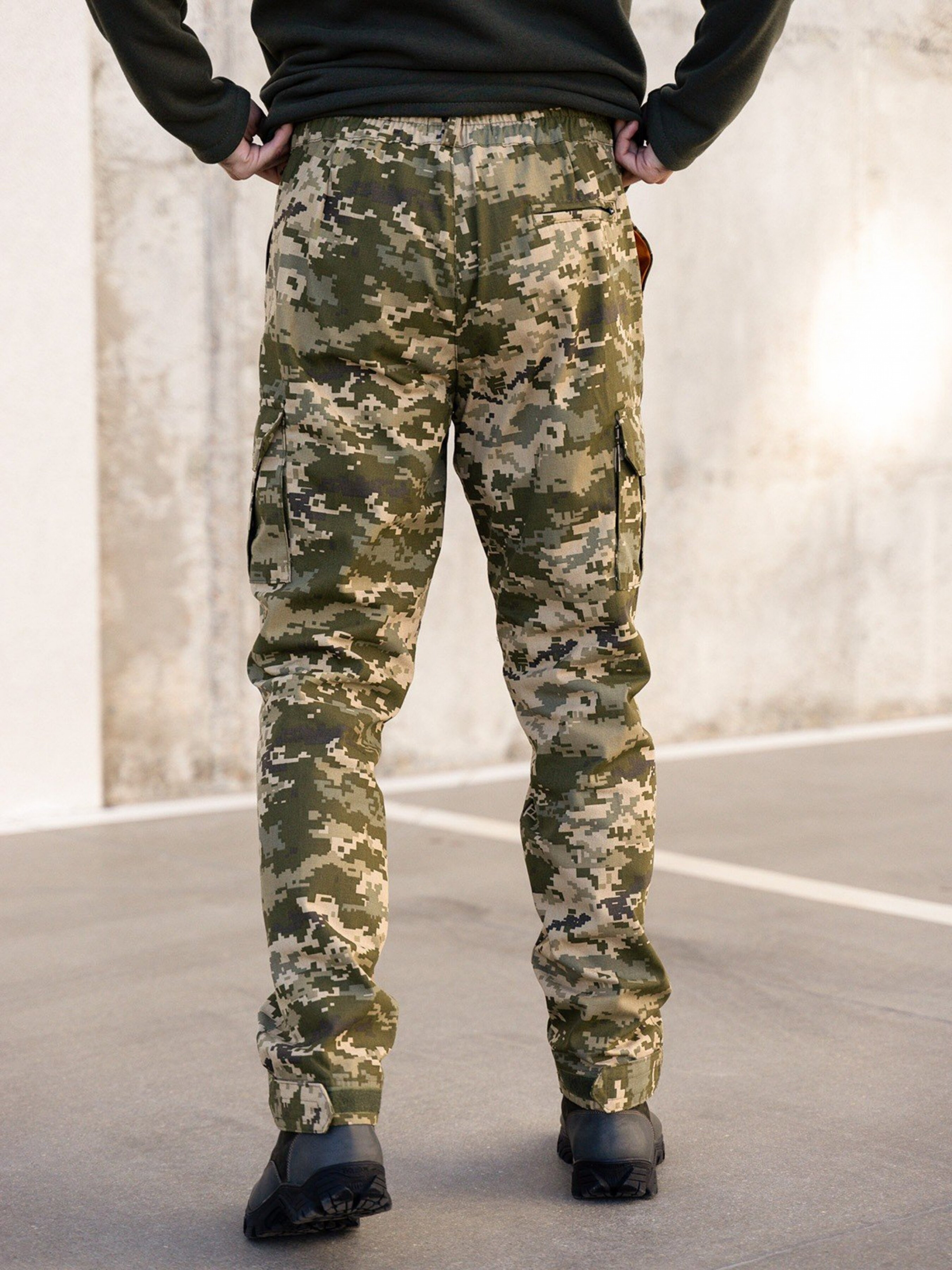 Хлопковые брюки цвета хаки с принтом в стиле милитари. Принтованные брюки из плотного хлопка с декором в стиле милитари и пятью карманами. Модель на резинке с застежкой-пуговицей и молнией спереди. Брюки прямого свободного кроя с фиксаторами н а липучке снизу изделия. Состав: 95% хлопок, 5% полиэстер. Материал: Коттон. Талия: 32 (71), 34 (74), 36 (77), 38 (80), 40 (83), Бедра: 32 (105), 34 (108), 36 (111), 38 (114), 40 (117), Длина изделия - 110, Длина по внутреннему шву - 82,Ткань: Низкой эластичности