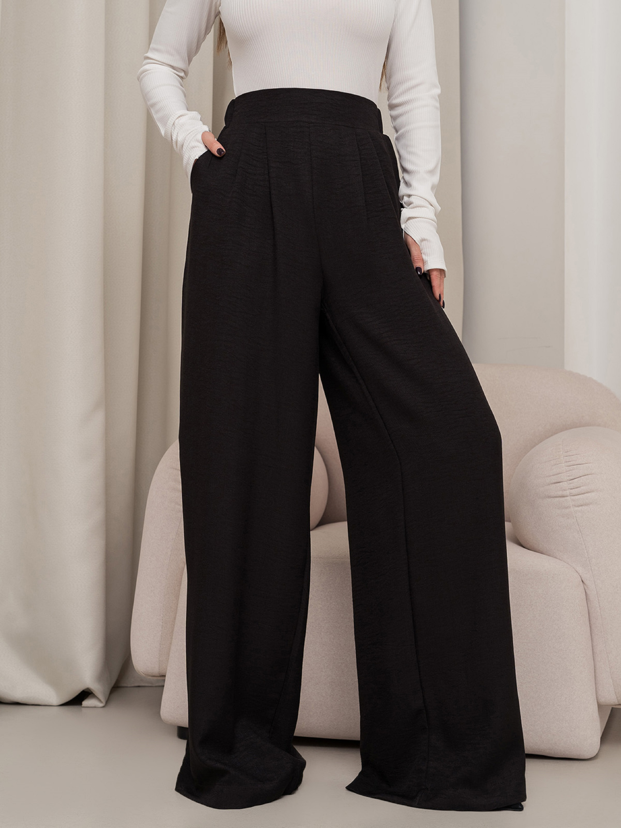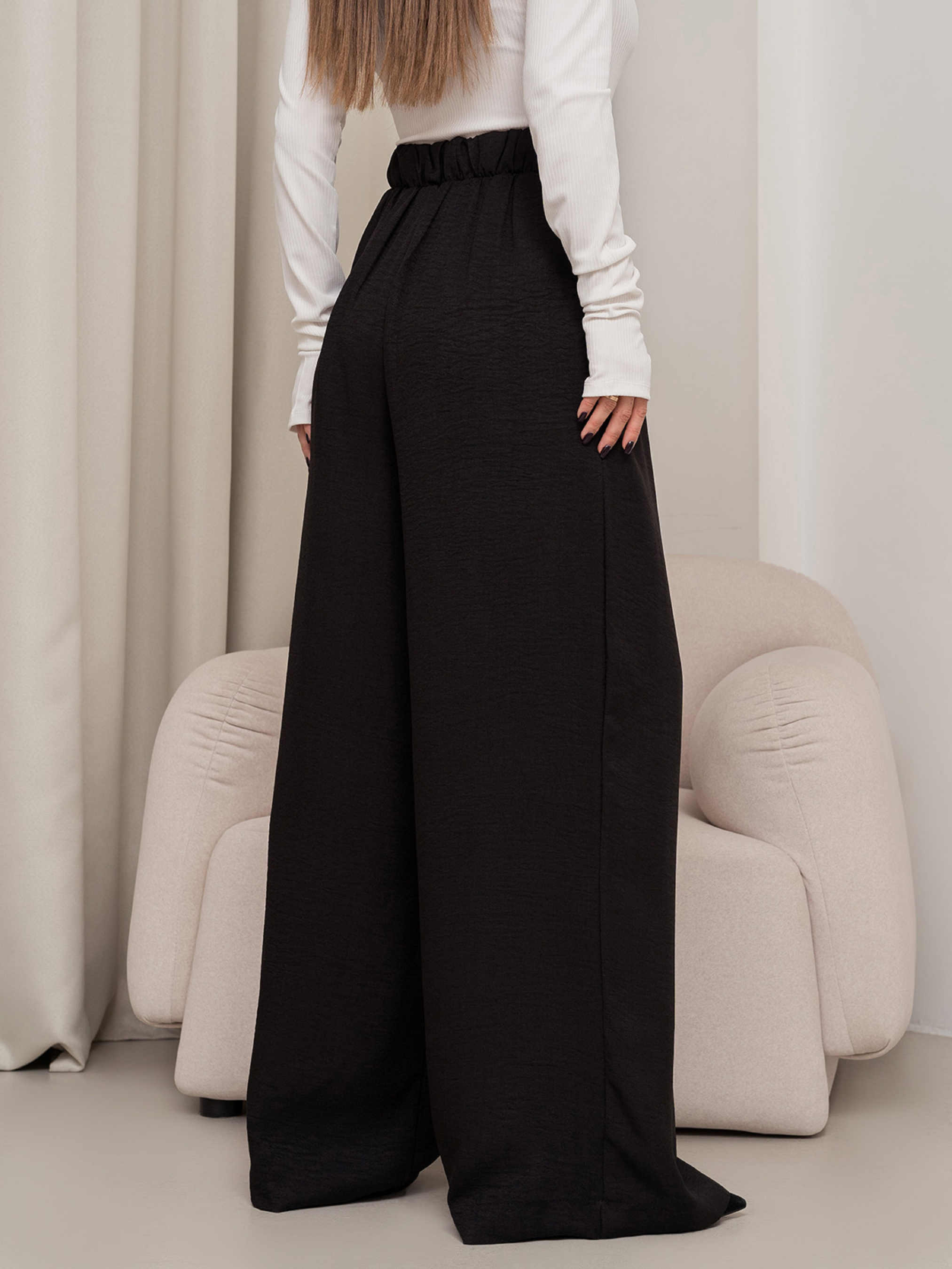 Текстурированные льняные брюки палаццо черного цвета с карманами. Брюки прямого широкого кроя с защипами и шлевками. Модель с высокой посадкой оснащена поясной задней резинкой.Полуобхват: Талия: S (32-36), M (34-38), L (36-40), XL (38-42), Бедра: S (56), M (58), L (60), XL (62), Длина изделия - 110, Длина по внутреннему шву - 83, Ткань: Низкой эластичности.