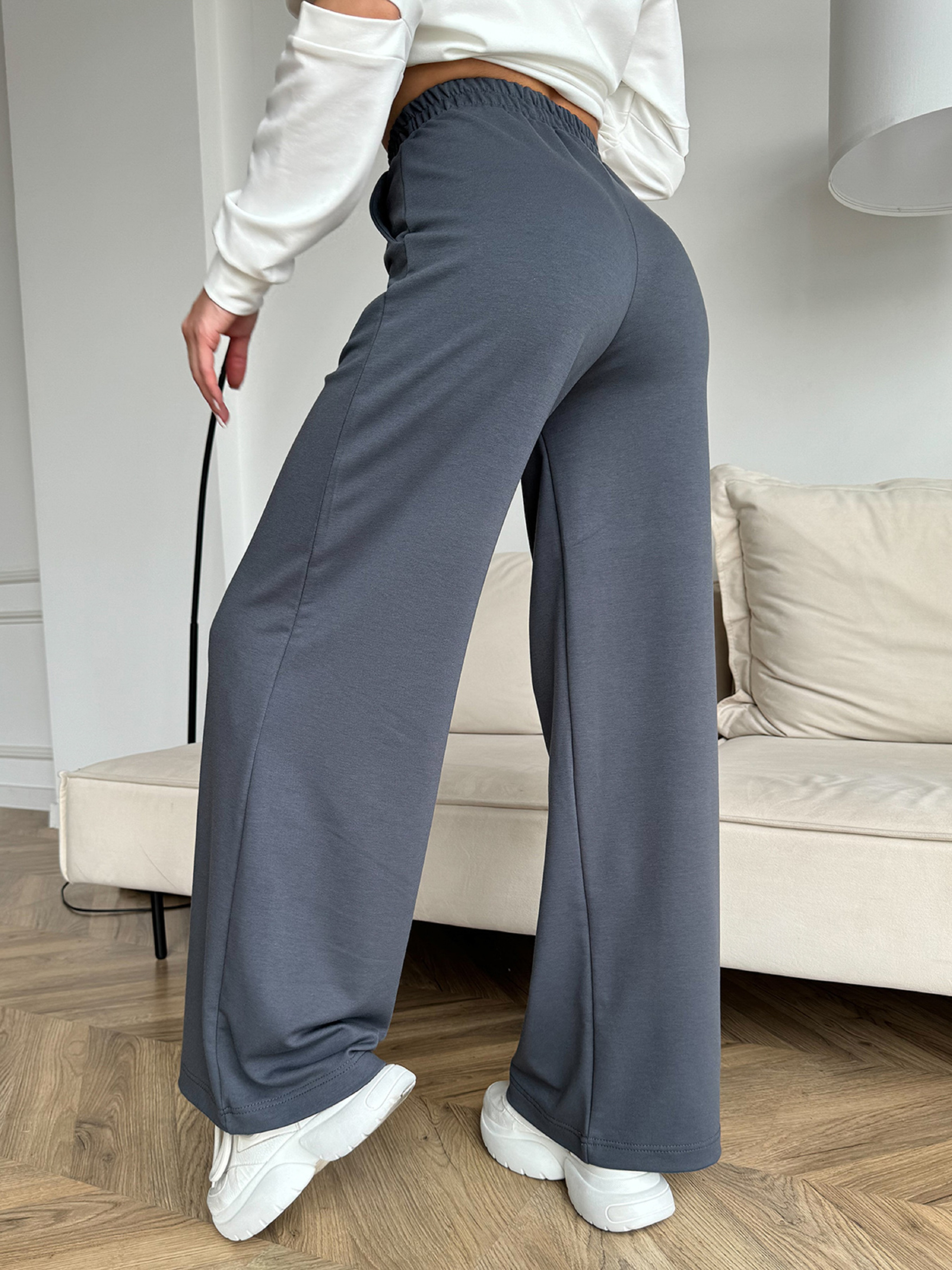 Серые повседневные брюки прямого свободного кроя, выполненные из однотонного трикотажа. Модель с эластичной поясной резинкой и карманами. Полуобхват: Талия: S (29-39), M (31-41), L (33-43), XL (35-45), Бедра: S (47), M (49), L (51), XL (53), Длина изделия - 102, Длина по внутреннему шву - 74, Ткань: Средней эластичности.