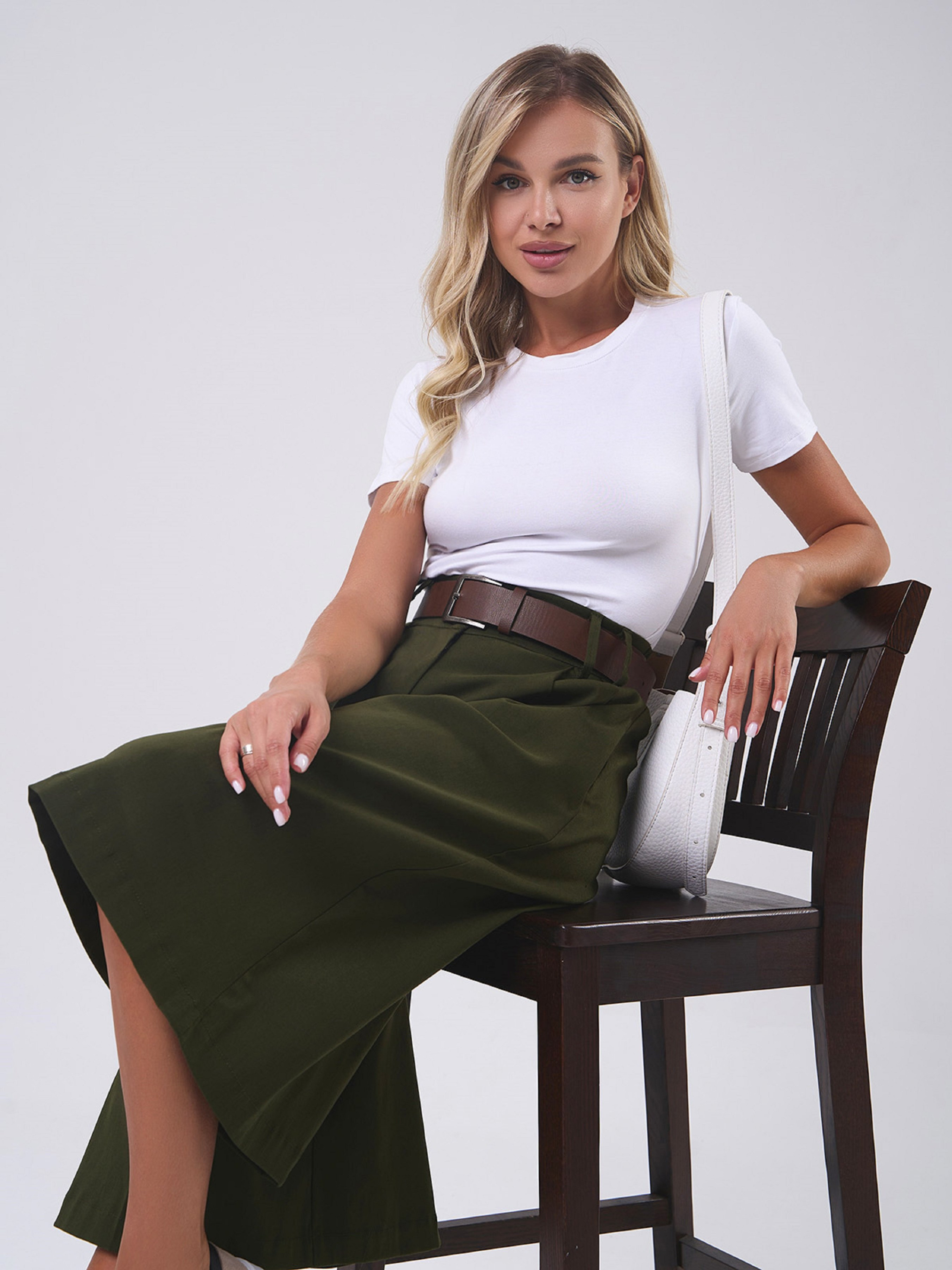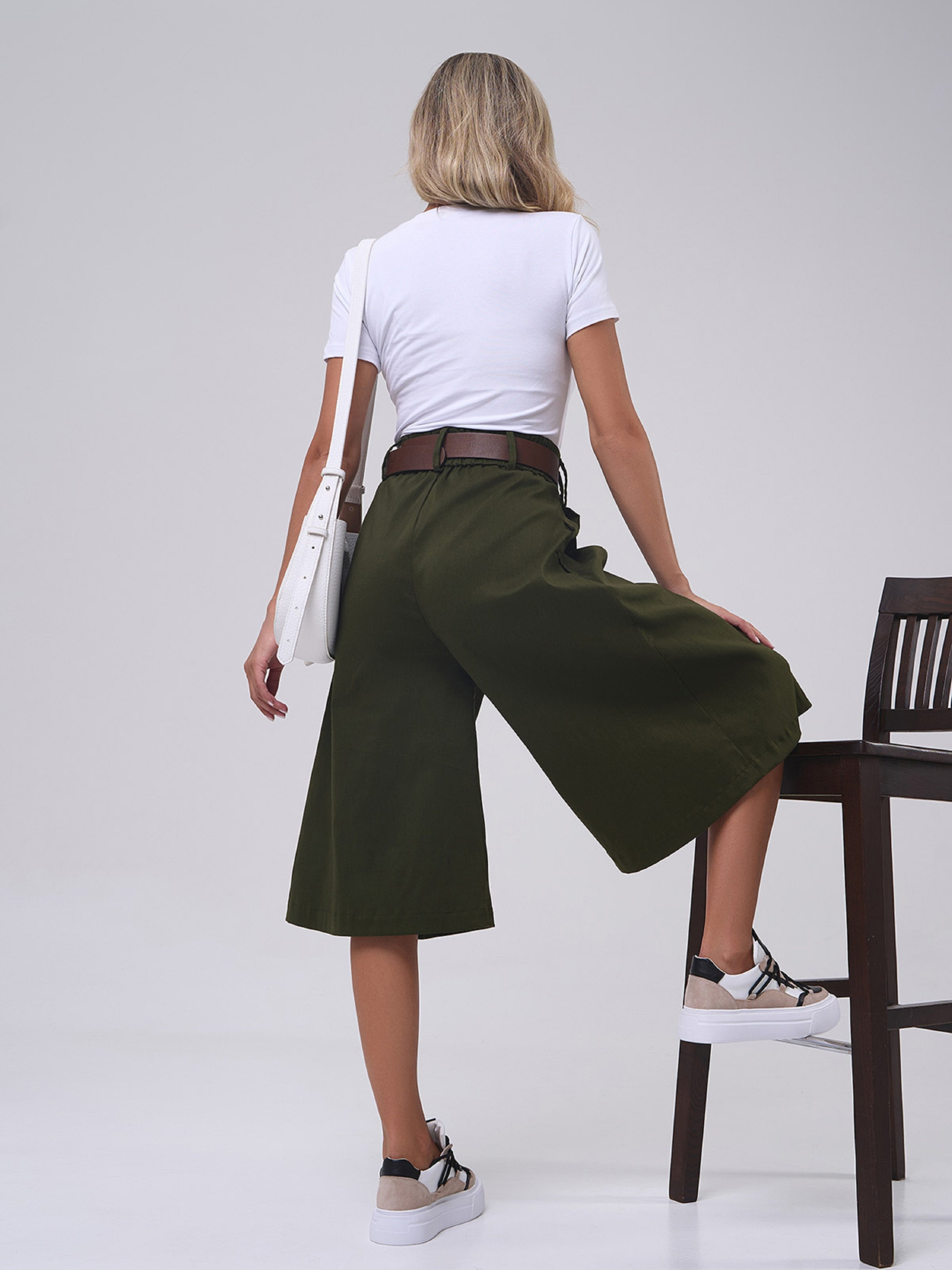 Кюлоты высокой посадки на талии с боковыми карманами, выполненные из джинс-коттона цвета хаки. Модель свободного расклешенного кроя с длиной ниже колен и застежкой-молнией с двумя пуговицами. Изделие с резинкой сзади на поясе, защипами у талии и поясными шлевками. Ремень в комплект не входит. Полуобхват: Талия: S (31), M (33), L (32-37*), XL (37), XXL (40), 3XL (38-42*), Бедра: S (60), M (58-63*), L (63), XL (62-67*), XXL (67-71*), 3XL (71), Длина изделия - 69, Длина по внутреннему шву - 36, Ткань: Низкой эластичности.