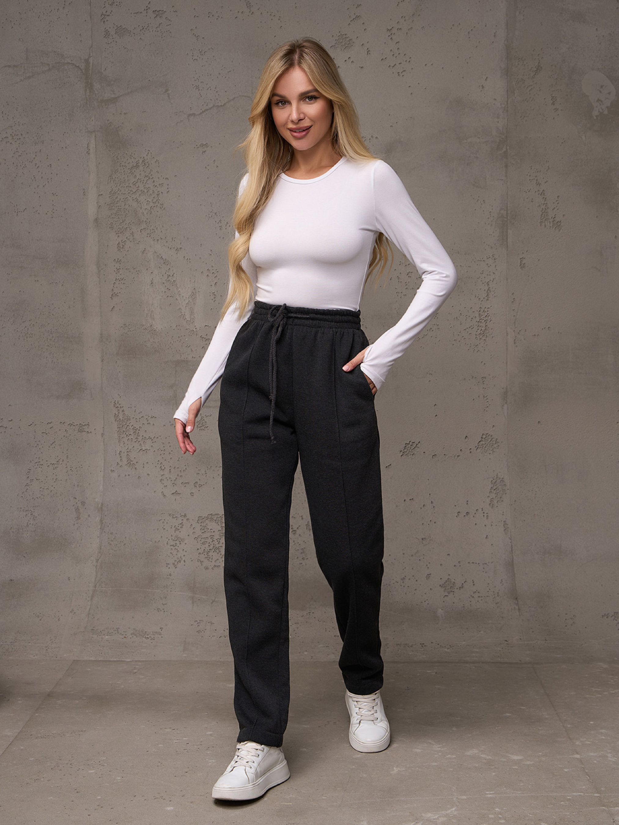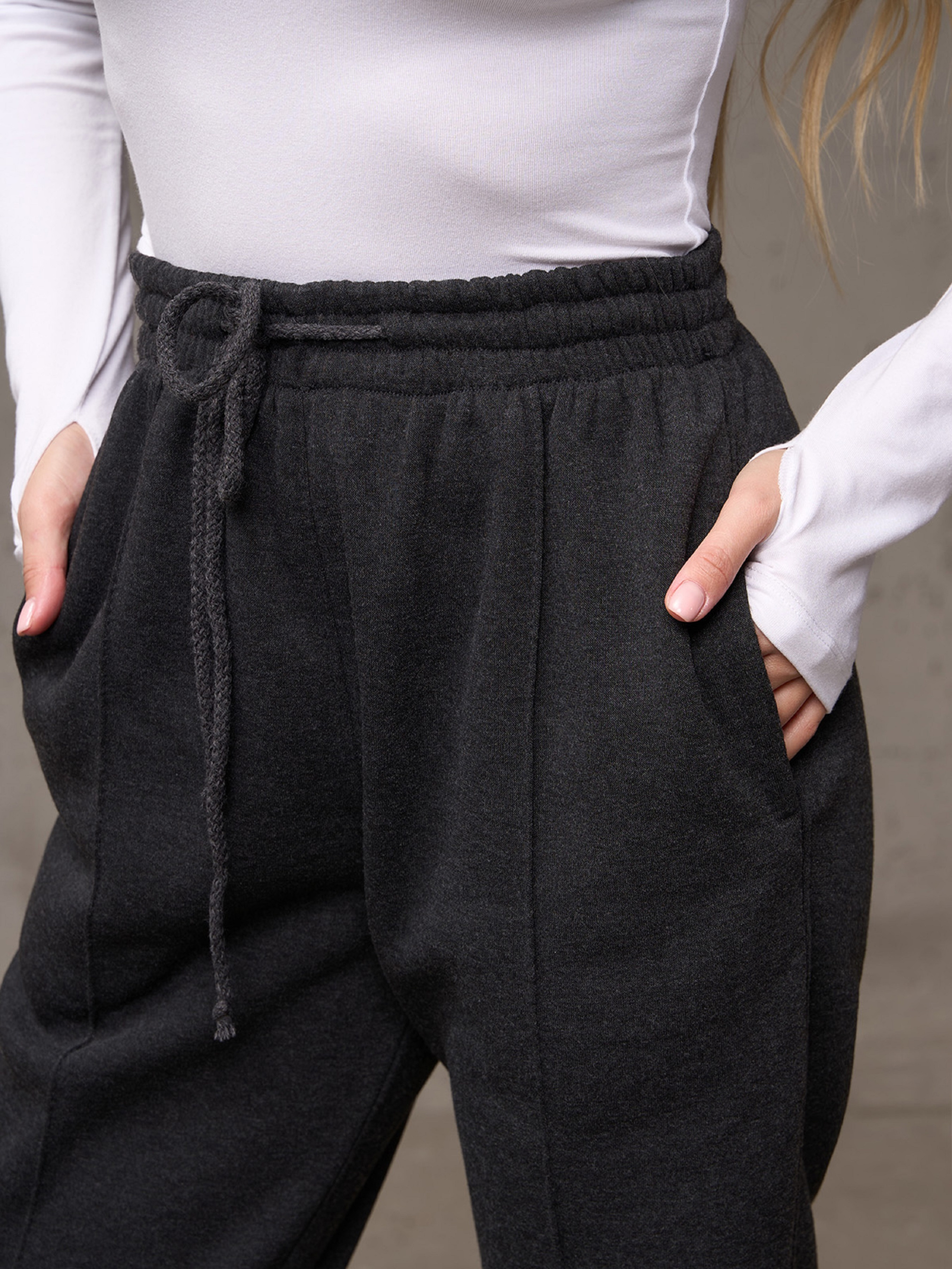 Темно-серые утепленные штаны из трикотажа на флисе с поясной резинкой на шнуровке. Штаны зауженного к низу кроя с карманами и фиксированными стрелками. Посадка высокая. Полуобхват: Талия: S (30-48), M (32-50), L (33-52), XL (35-54), XXL (37-59), 3XL (40-57), Бедра: S (49), M (52), L (53), XL (55), XXL (59), 3XL (62), Длина изделия - 102, Длина по внутреннему шву - 71, Ткань: Низкой эластичности