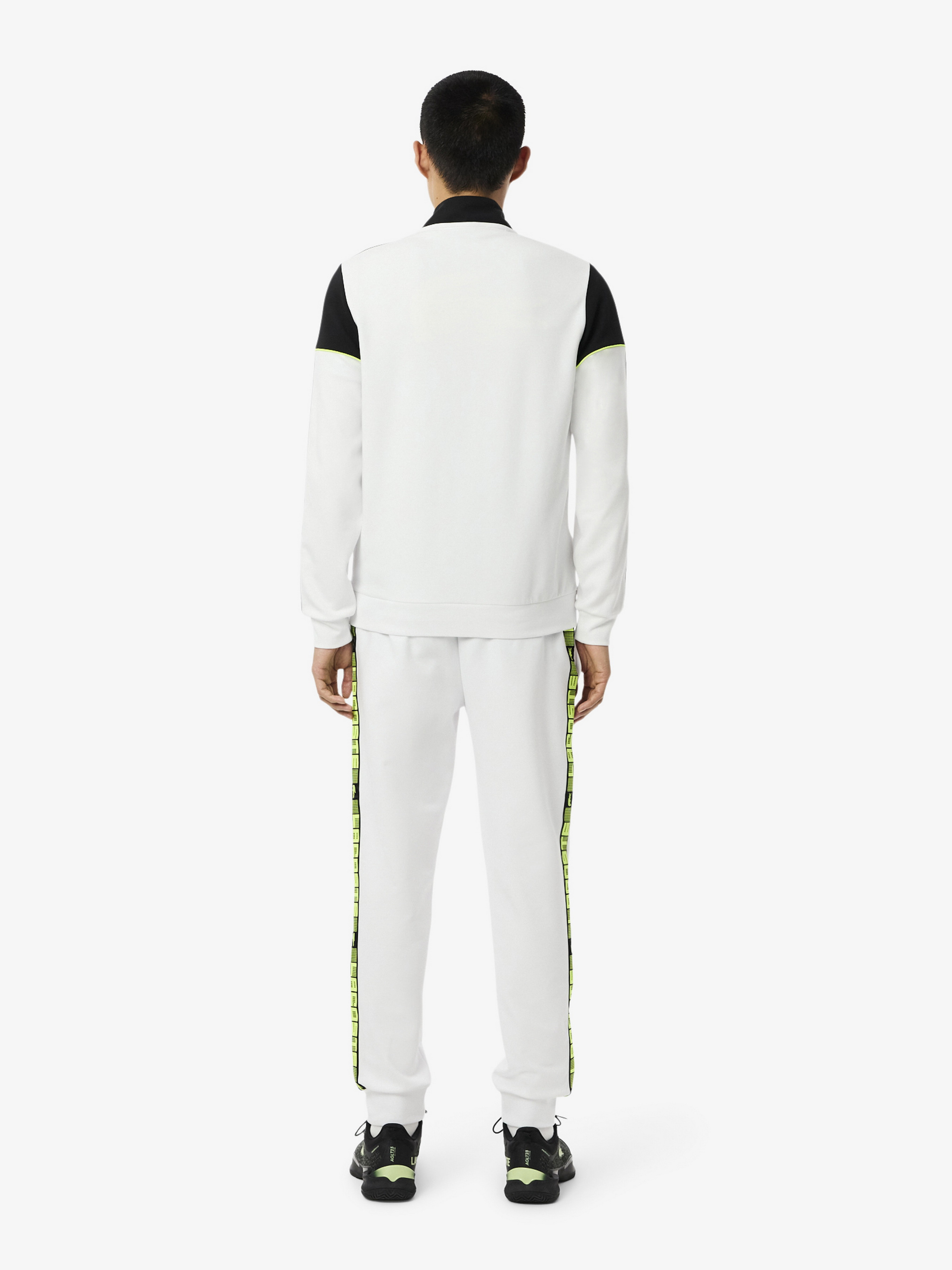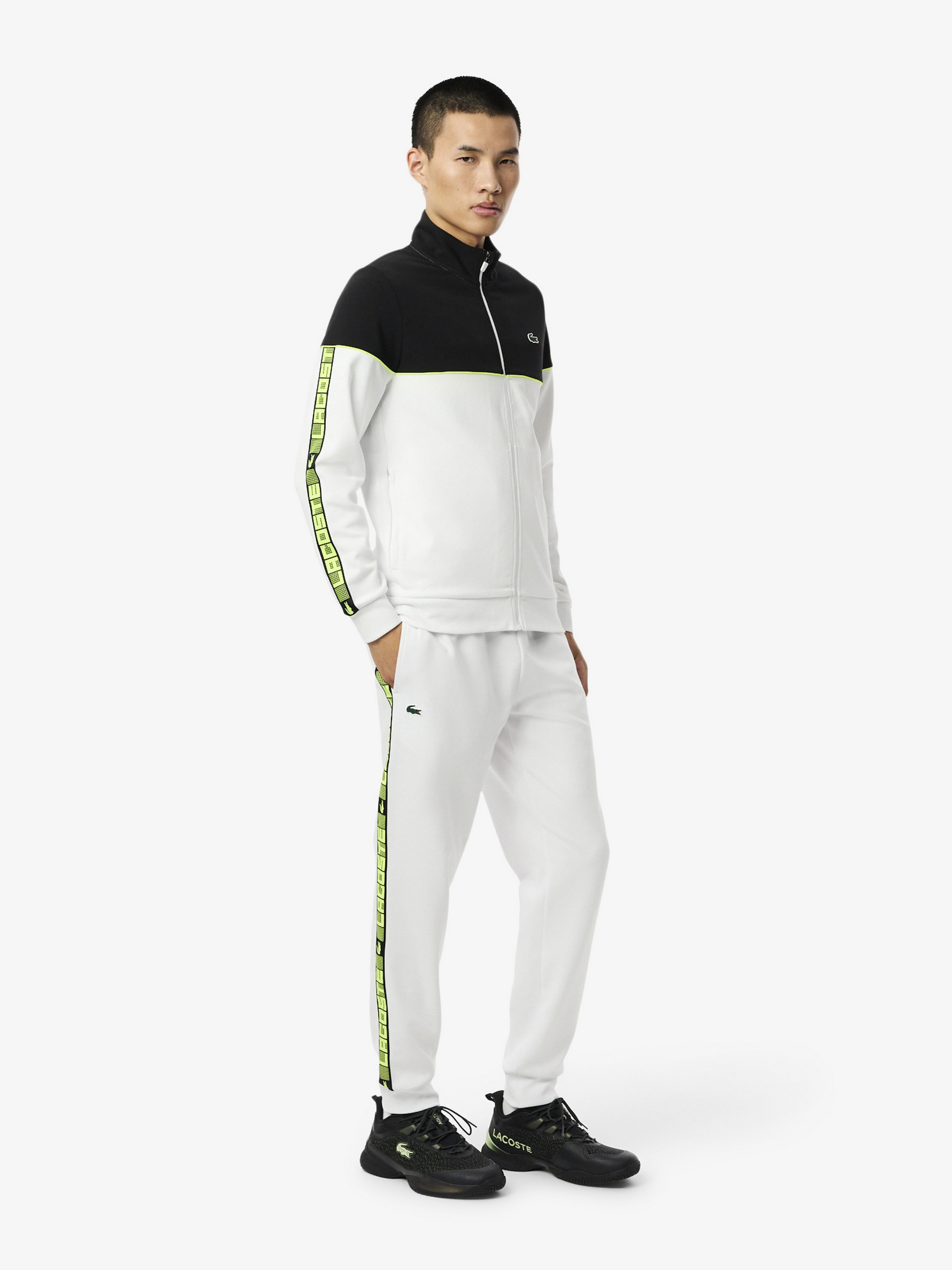 Брюки из спортивного костюма из мягкой хлопковой смеси с графическими полосами и мотивами с крокодилом и ракеткой. Смелый спортивный стиль от Lacoste. Материал: основа – 71% полиэстер, 25% хлопок, 4% эластан; мешковина кармана – 60% хлопок, 40% полиэстер; нижний рыбак – 58% хлопок, 39% полиэстер, 3% эластан Двойное полотно из органического хлопка и переработанного полиэстера Полосы с логотипом вдоль ноги Рибана на лодыжках Два боковых кармана Силиконовый крокодил на правой ноге Дизайн: Франция