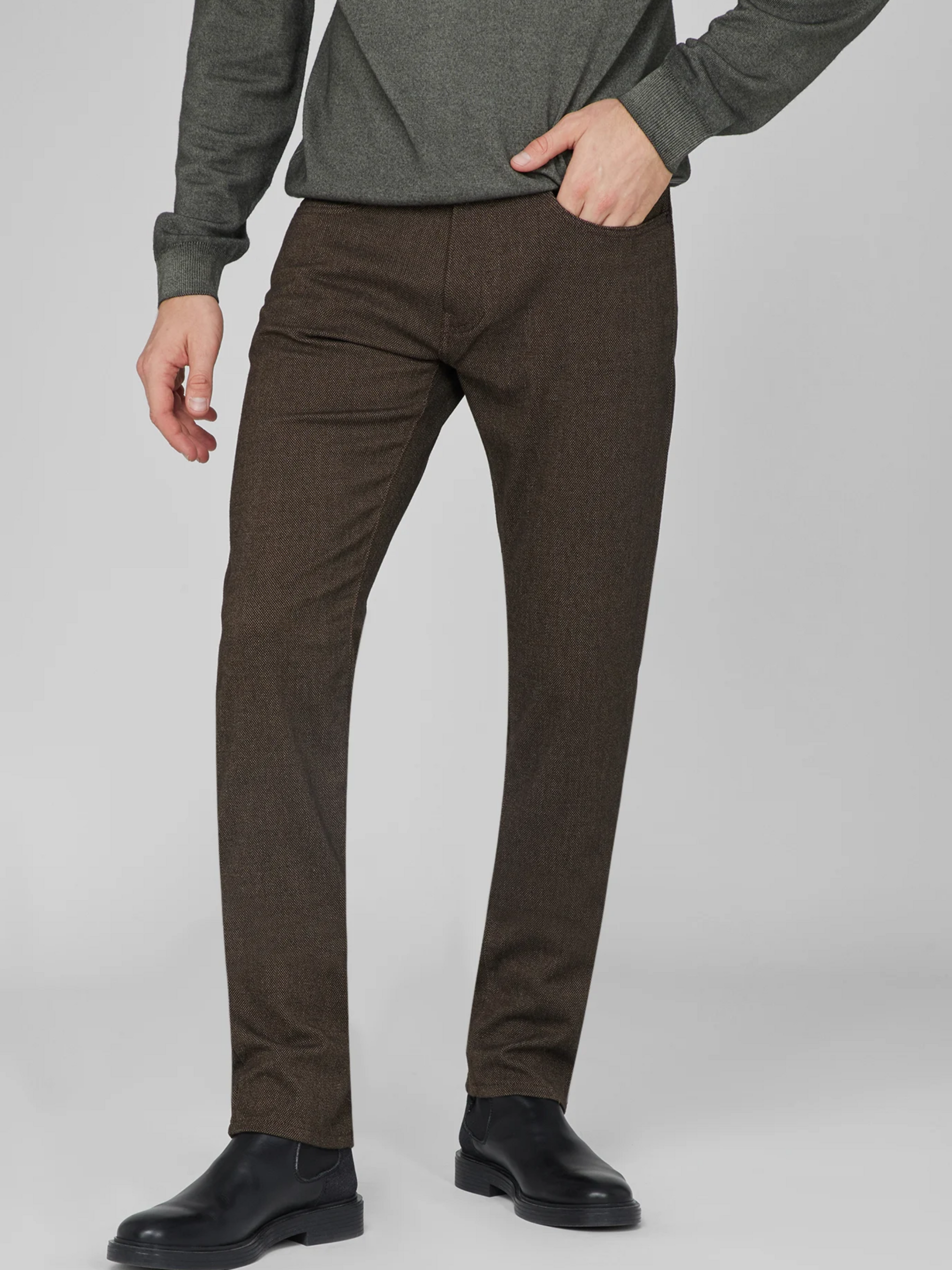 Эти коричневые брюки от Pierre Cardin — идеальное сочетание элегантности и современного силуэта. Они созданы для тех, кто ценит безупречный внешний вид и удобство в каждом движении. Основные характеристики: Цвет: коричневый Состав ткани: 63 % полиэстер, 33 % вискоза, 4 % эластан — прочный, мягкий и слегка эластичный материал, который обеспечивает идеальную посадку и комфорт Фасон: зауженный крой (slim/tapered fit), средняя посадка — современный вид и удобное прилегание Застёжка: молния и пуговица Карманы и декор: пять карманов и изысканный патч-логотип Pierre Cardin, подчеркивающий фирменный стиль