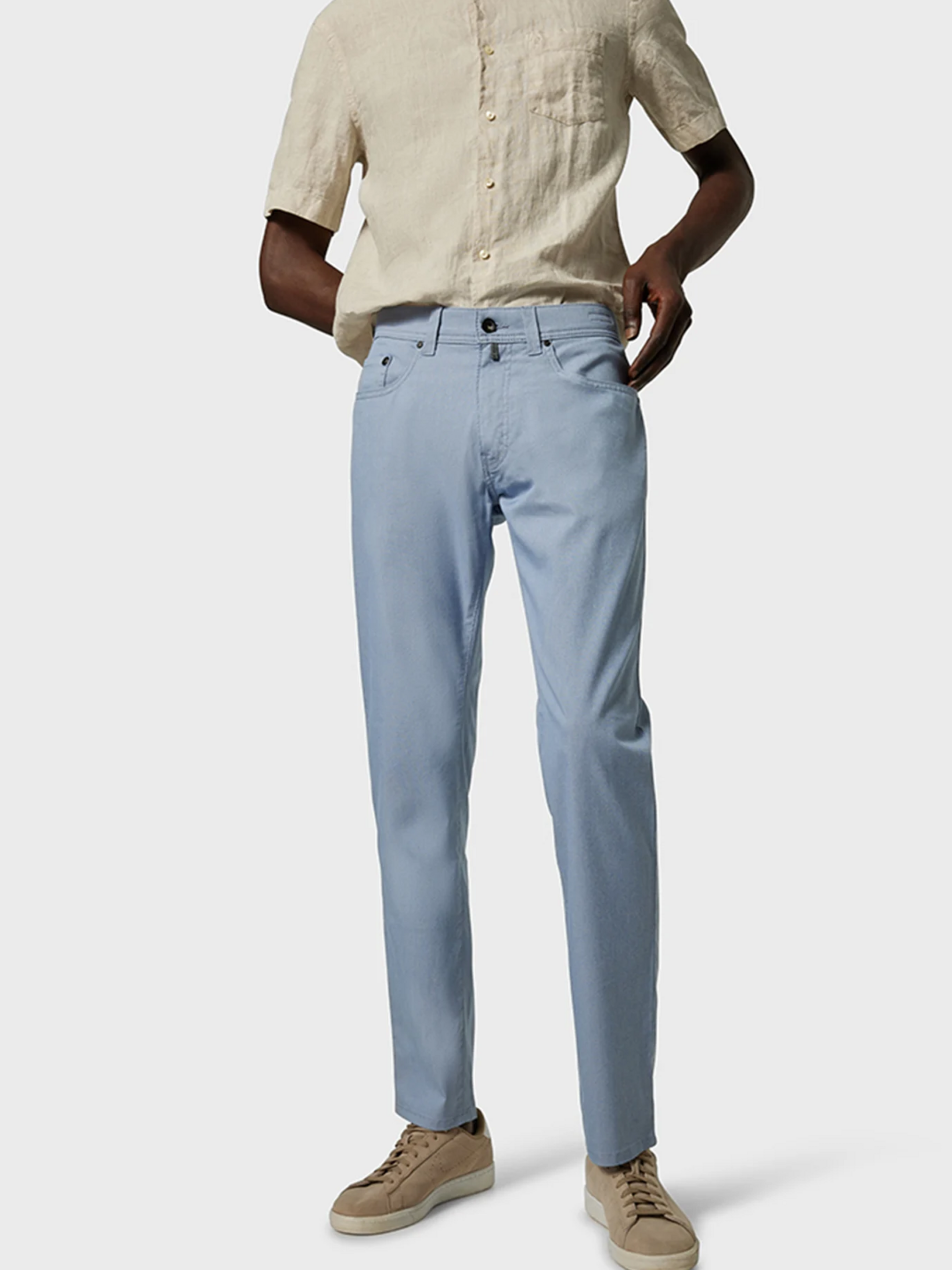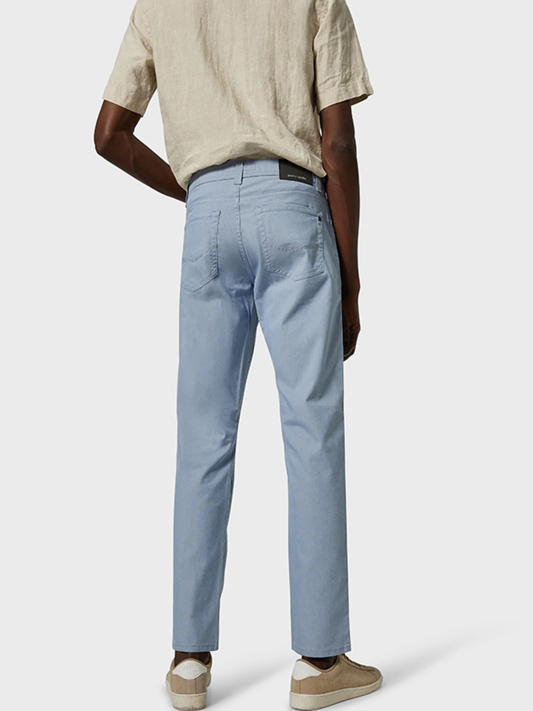 Брюки Pierre Cardin из коллекции Voyage – слегка сужены от колена. Средняя комфортная посадка. Материал легок и комфортен на летний период, хорошо пропускает воздух, очень приятен к телу. По внешнему виду они невероятно похожи на джинсы, но сделаны из легкой брючной ткани. Они прекрасно тянутся, но за счет эластичности не растягиваются и хорошо держат форму.