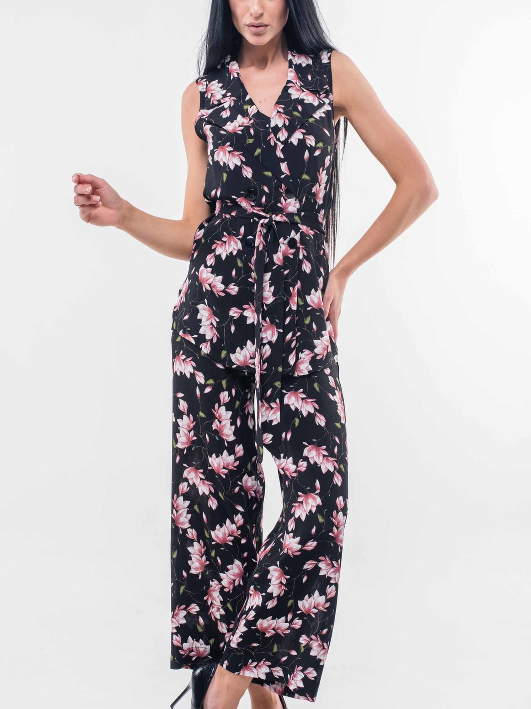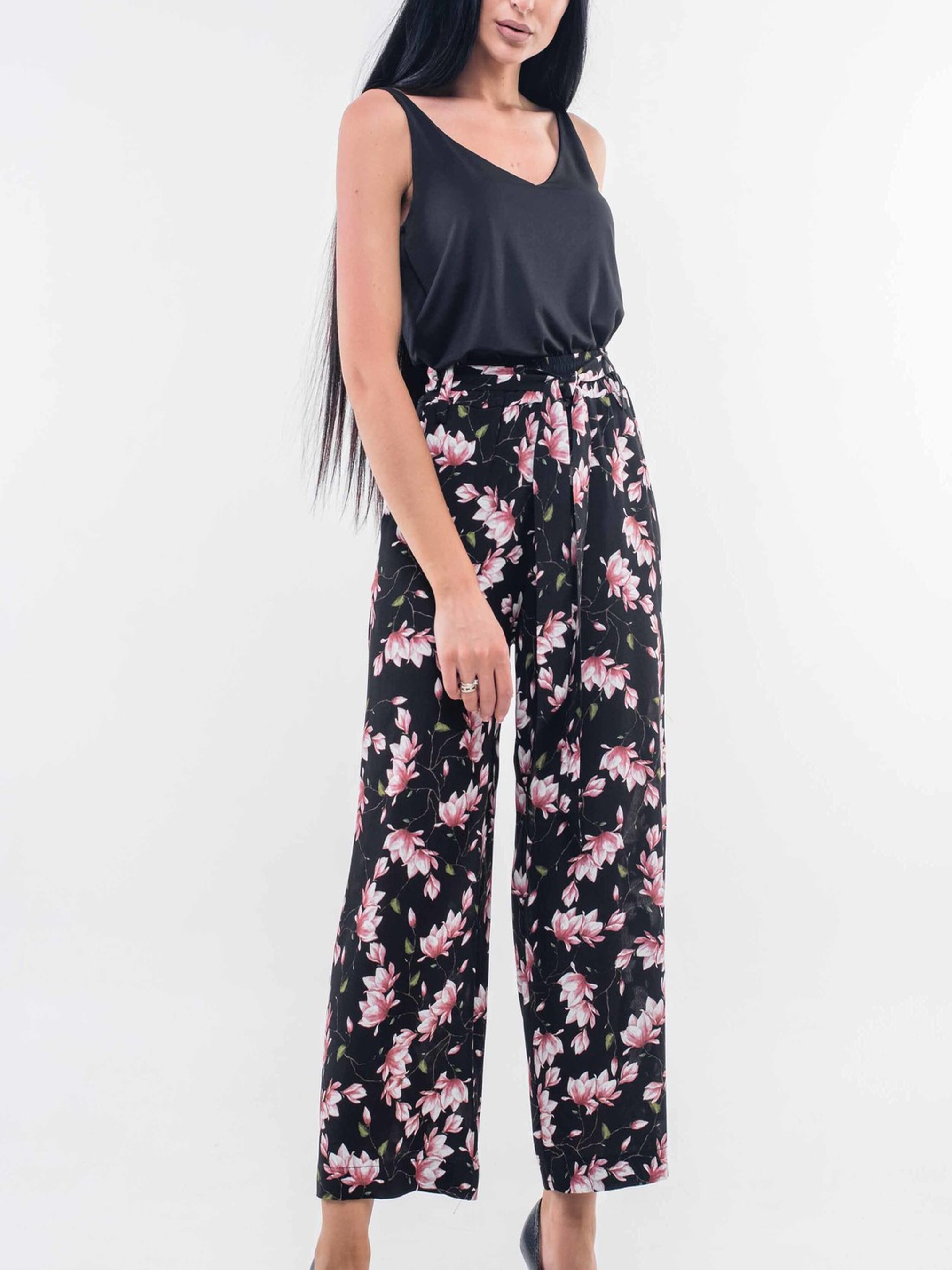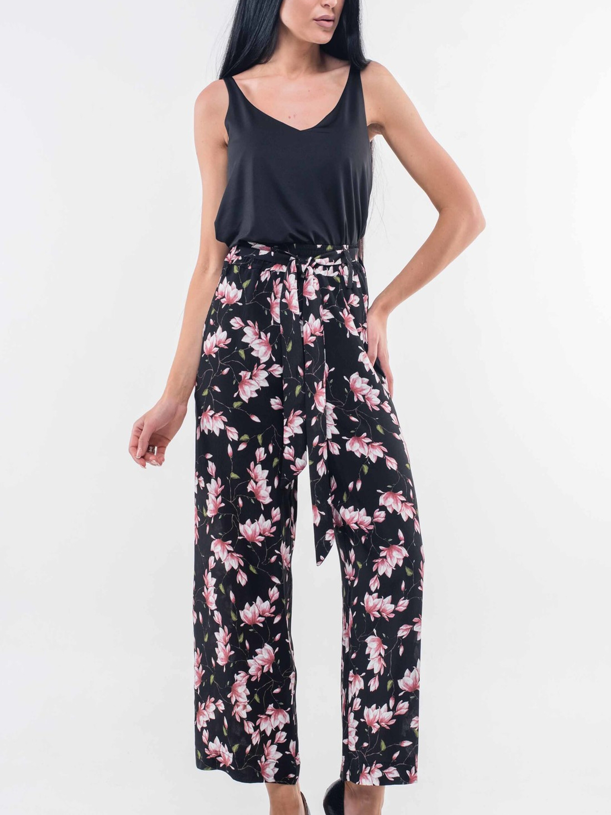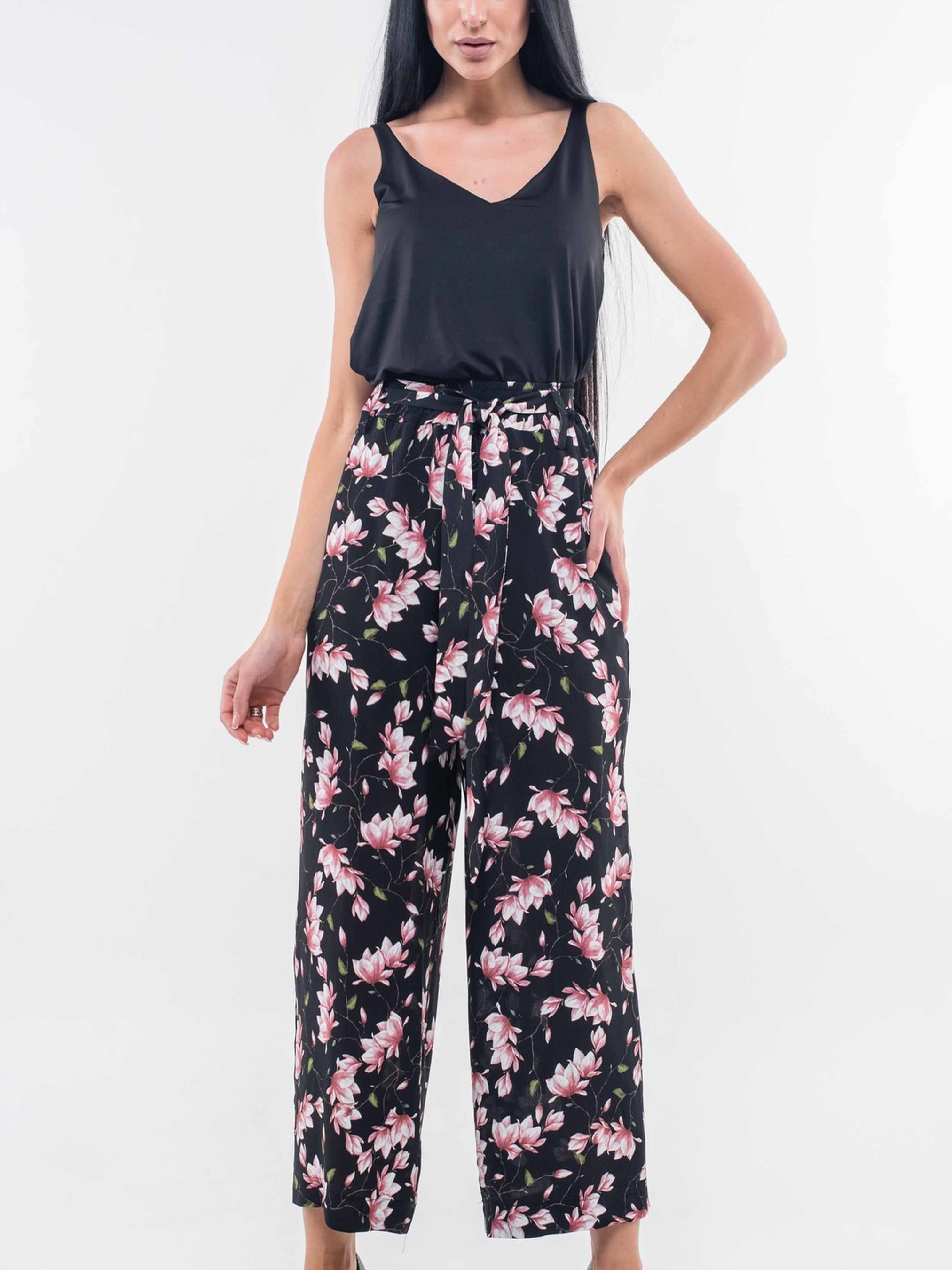 Стильні широкі брюки-кюлоти з високою посадкою стануть вдалим поєднанням актуального дизайну та неперевершеного комфорту. Завдяки еластичній резинці на поясі вони забезпечують зручну посадку та свободу рухів. Практичні кишені, розташовані в бічних швах, додають функціональності. До комплекту входить елегантний пояс з того ж матеріалу, що й брюки, дозволяючи підкреслити лінію талії. Виготовлені з приємного на дотик штапель-крепу, ці брюки відмінно тримають форму та мають легку текстуру. Їх універсальний крій дозволяє створювати різноманітні образи – від розслаблених повсякденних до більш вишуканих, залежно від обраного верху та аксесуарів. Характеристики: Матеріал брюк: Штапель-креп (34% віскоза, 56% поліестер, 10% бавовна) Крій: Кюлоти, широкі Посадка: Завищена лінія талії Пояс: На резинці, в комплекті пояс з основного матеріалу Деталі: Кишені в бічних швах Стиль: Стильний, зручний, повсякденний, елегантний Властивості: Приємний на дотик матеріал, добре тримають форму