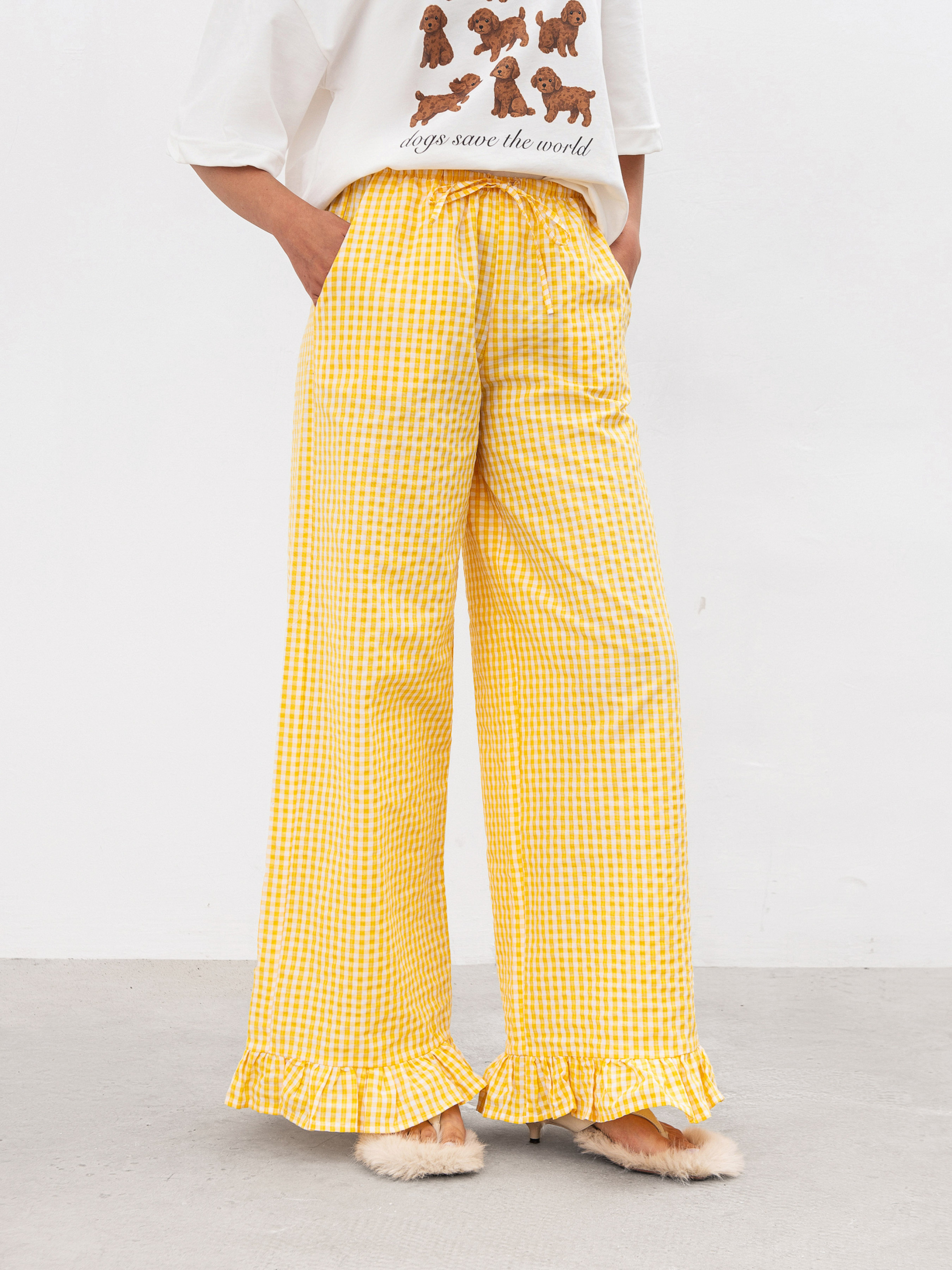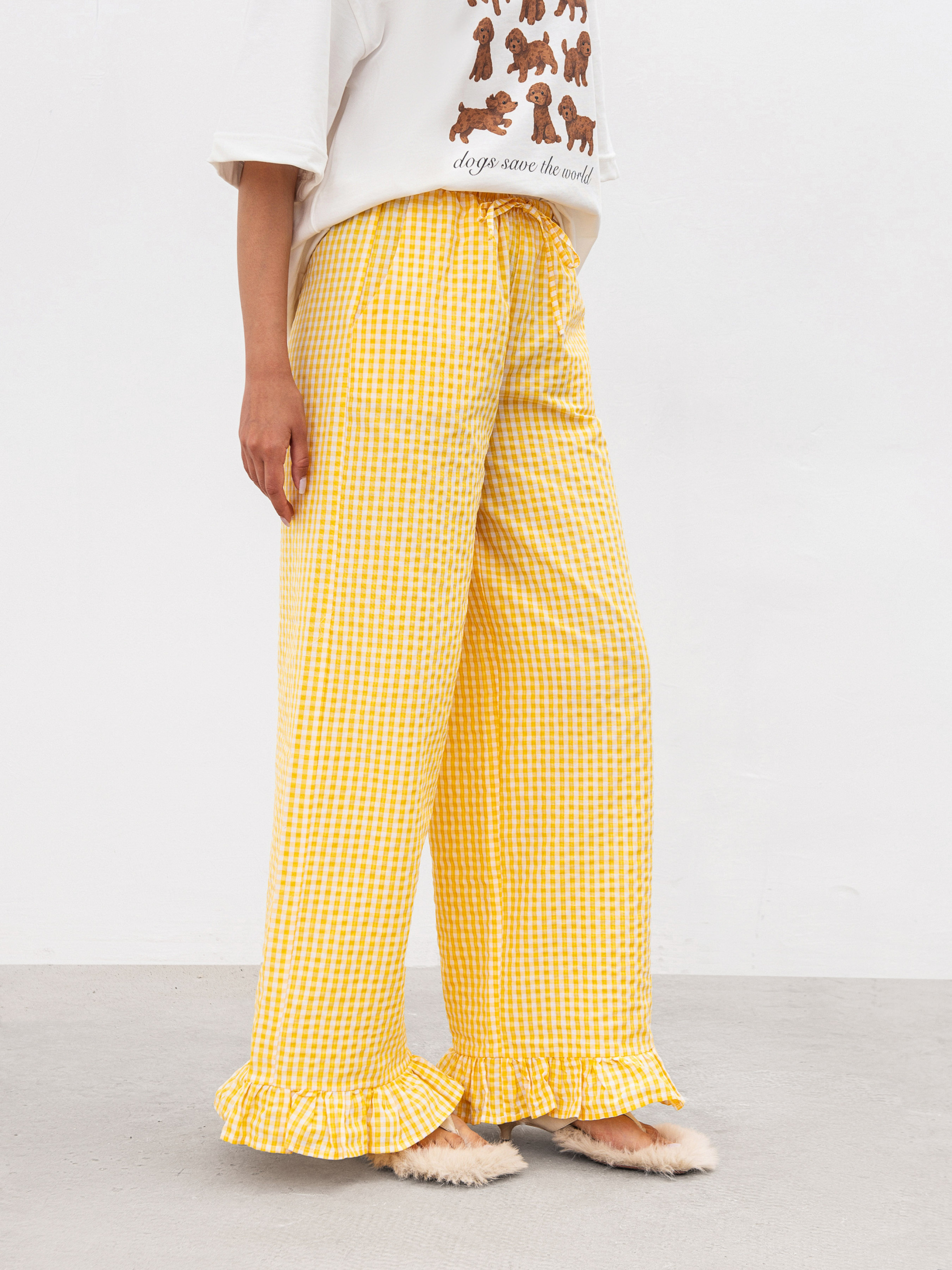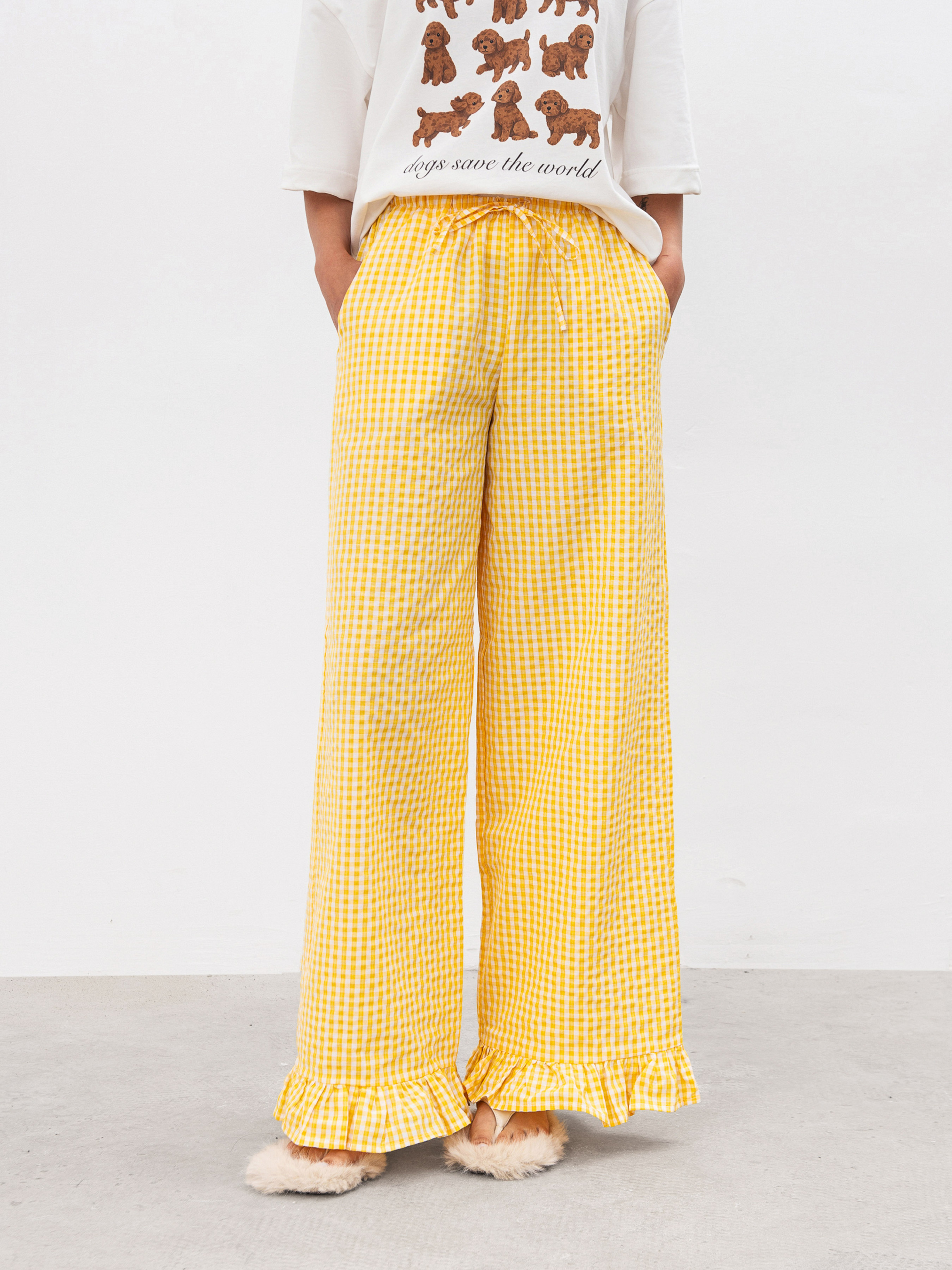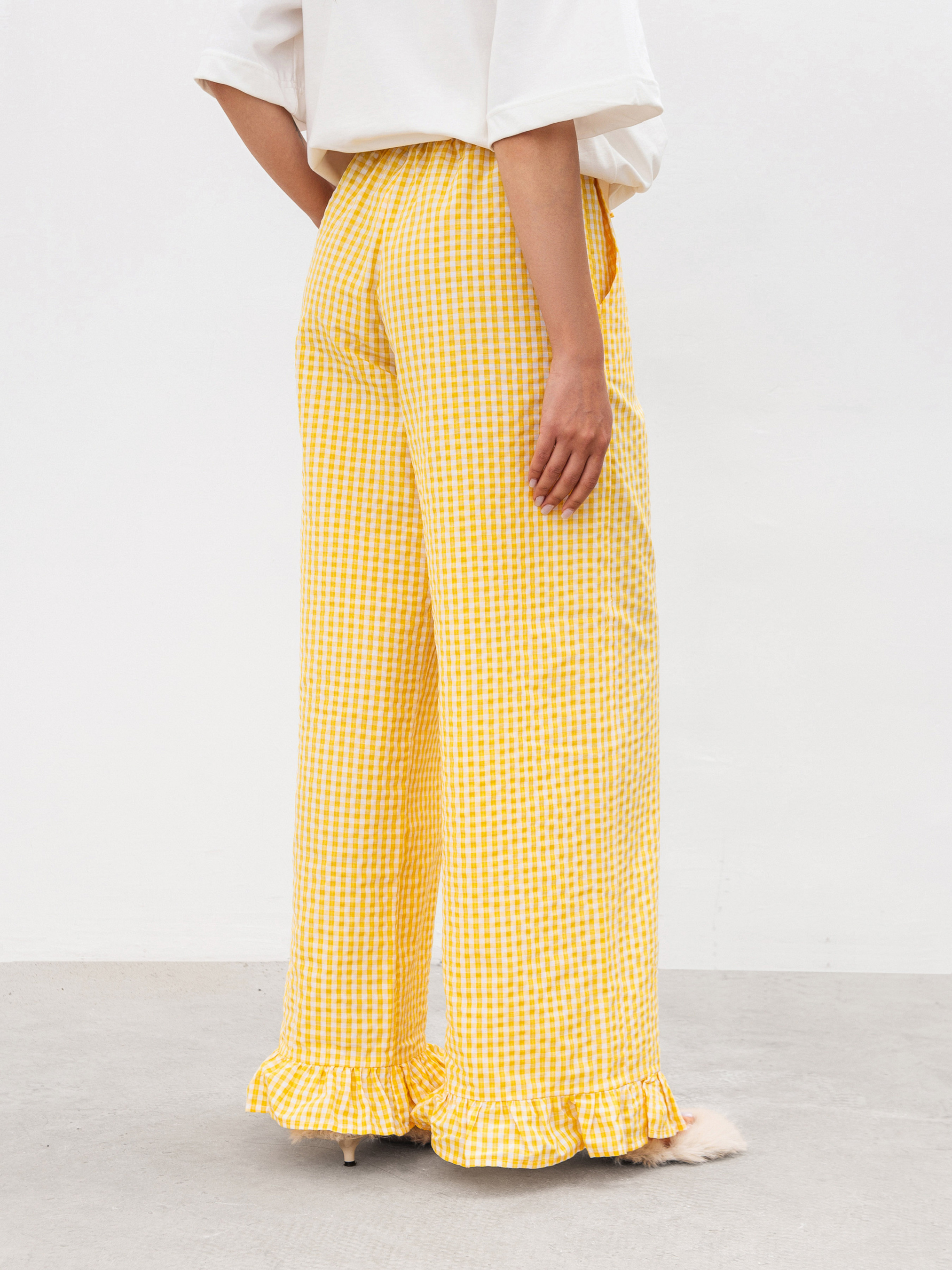 Брюки со слегка расклешенным низом, украшенным рюшами - идеальное сочетание комфорта и акцентной детали. Свободный крой позволяет чувствовать себя легко в течение всего дня, а эластичный пояс со шнурком мягко фиксируется на талии и не давит.Модель оснащена удобными кармашками в передних половинках, что добавляет практичности. Благодаря сочетанию хлопка и полиэстера ткань приятная к телу, хорошо держит форму и не требует сложного ухода. Эти брюки - о ежедневном комфорте с ненавязчивой игривостью. ХС Длина по внутреннему шву: 78 см. Длина по внешнему шву: 102 см. Полуобхват бедер: 50 см Ширина по низу: 28 см Посадка: 26 см Полуобхват талии: 28 см С Длина по внутреннему шву: 79 см. Длина по внешнему шву: 102 см. Полуобхват бедер: 53 см Ширина по низу: 28 см Посадка: 28 см Полуобхват талии: 31 см М Длина по внутреннему шву: 79 см. Длина по внешнему шву: 104 см. Полуобхват бедер: 54 см Ширина по низу: 29 см Посадка: 28 см Полуобхват талии: 32 см Л Длина по внутреннему шву: 79 см. Длина по внешнему шву: 105 см. Полуобхват бедер: 55 см Ширина по низу: 30 см Посадка: 30 см Полуобхват талии: 33 см ХЛ Длина по внутреннему шву: 79 см. Длина по внешнему шву: 106 см. Полуобхват бедер: 57 см Ширина по низу: 31 см. Посадка: 30 см Полуобхват талии: 34 см