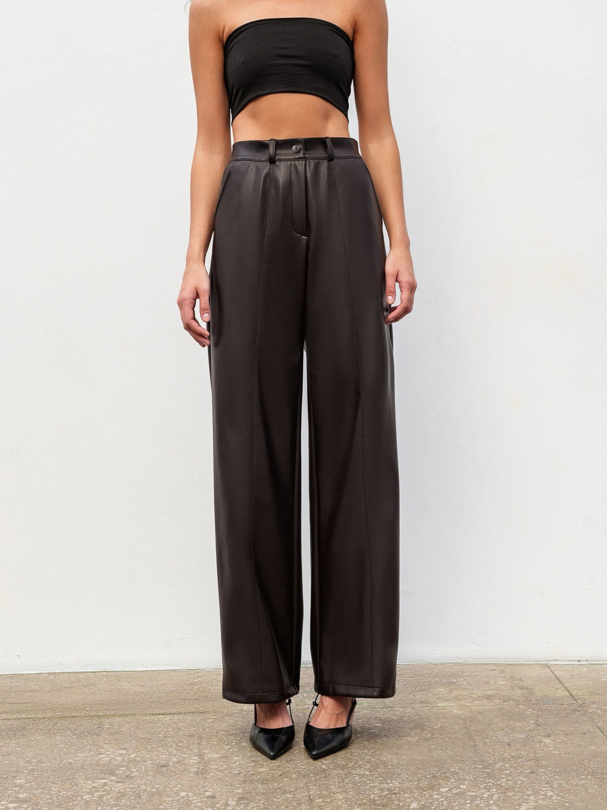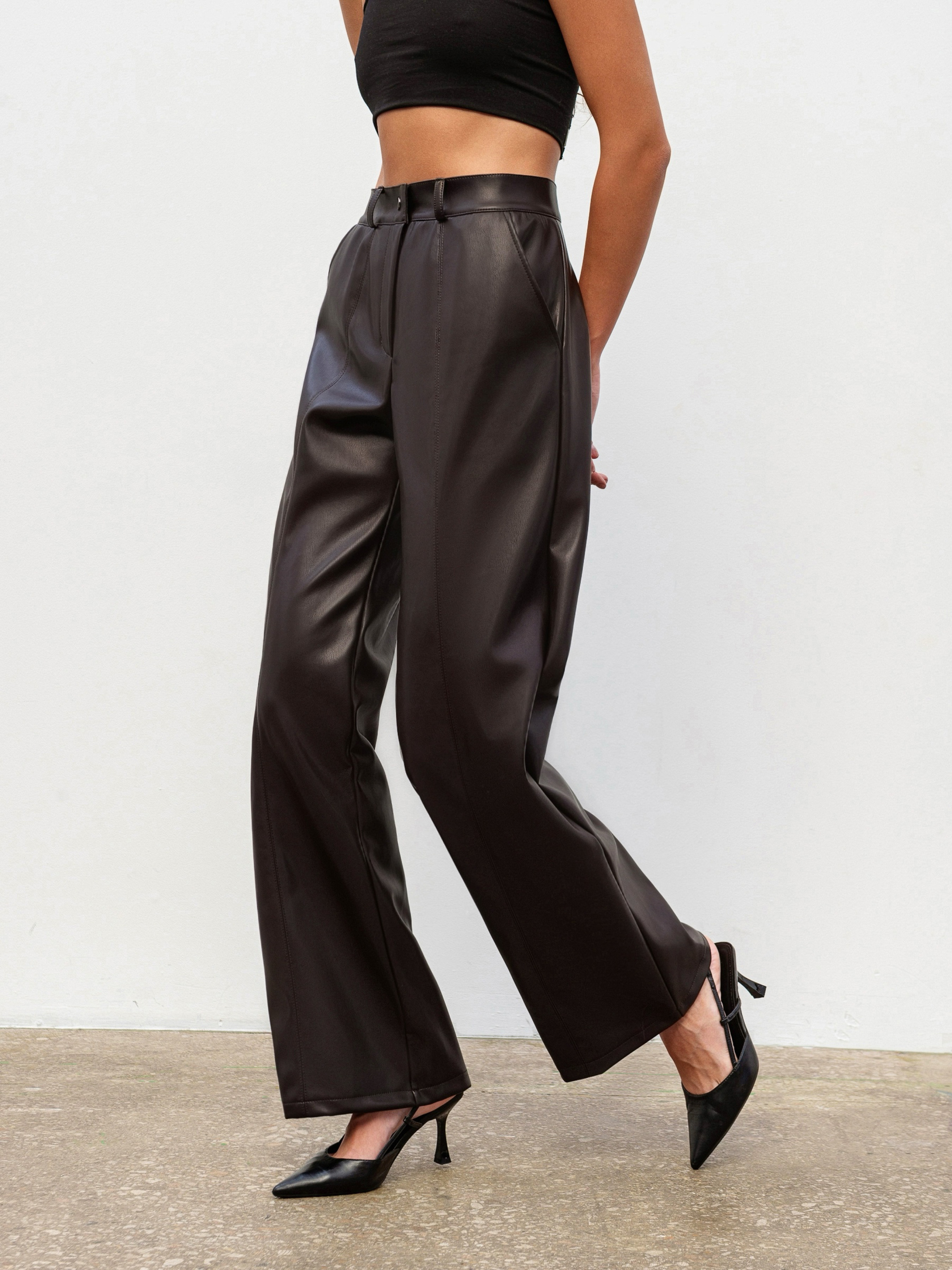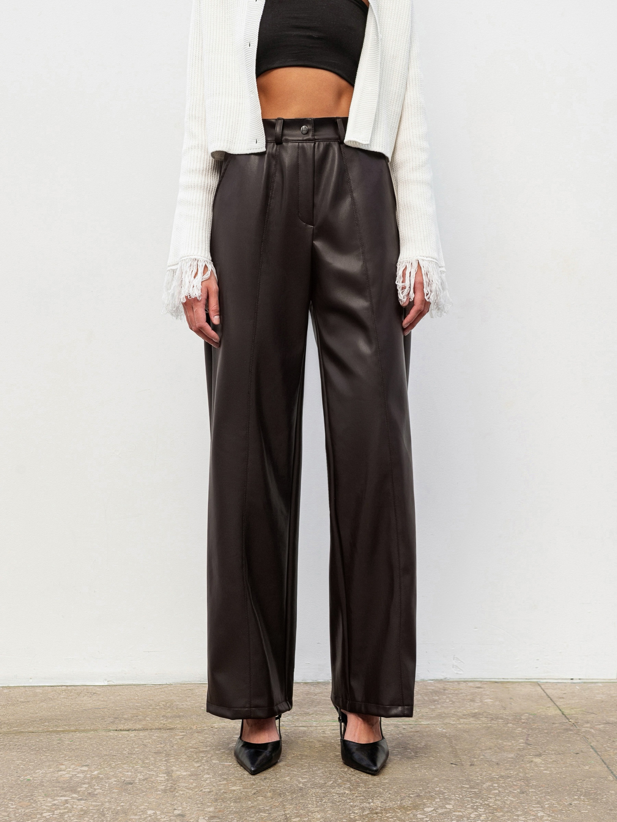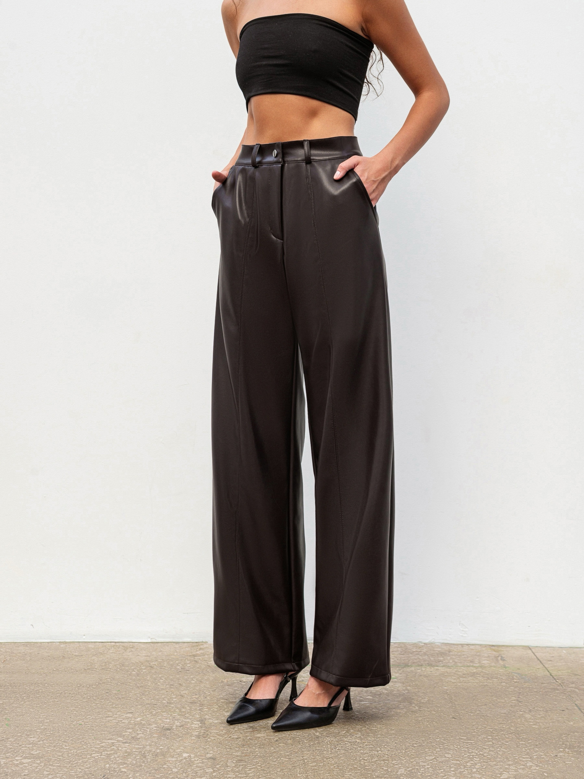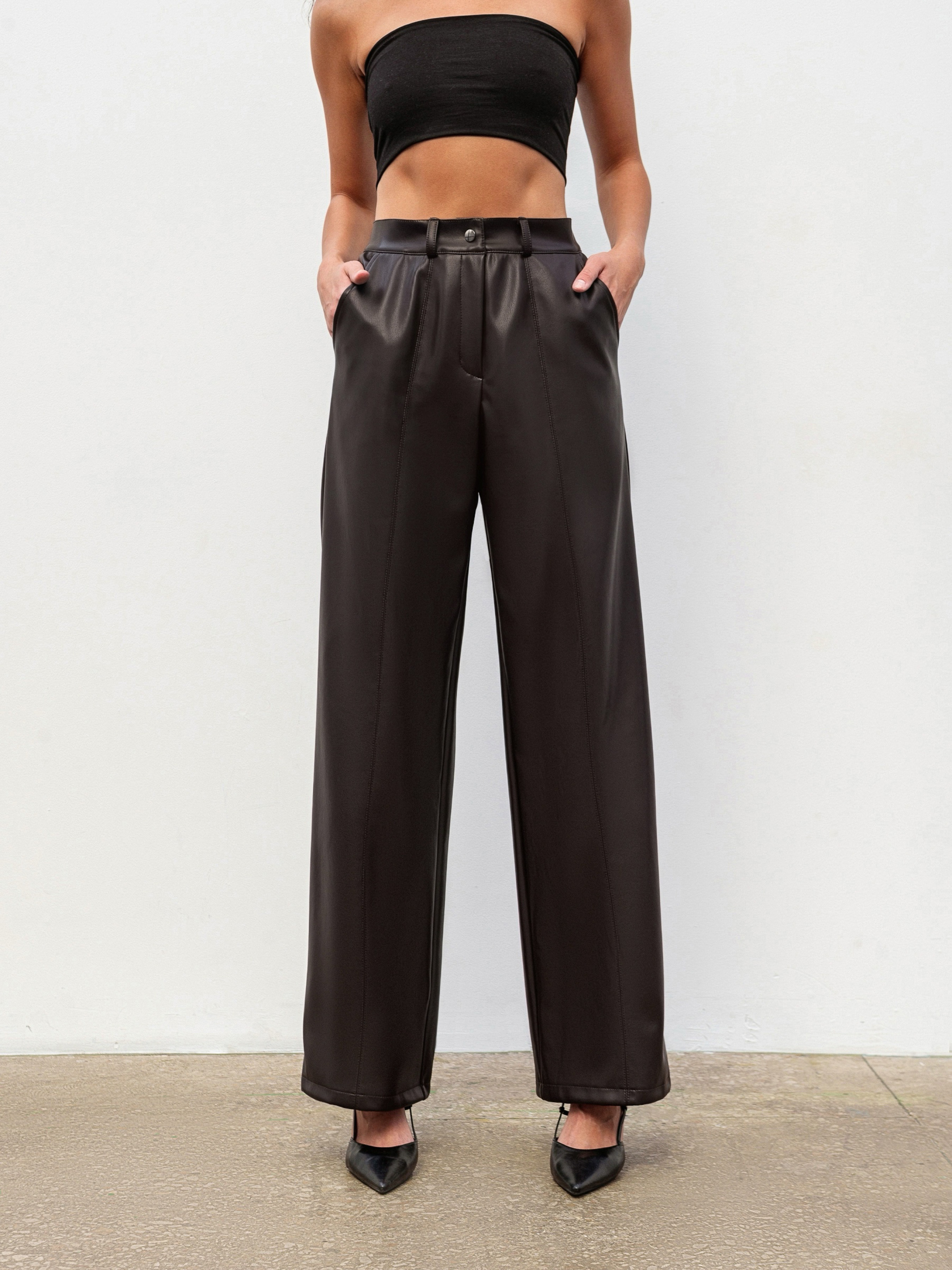 Брюки прямого фасона с эффектом кожи стильная база для осенне-зимних образов. Модель имеет высокую посадку, серебряную фурнитуру и шлевки для ремня. Вертикальные строчки спереди визуально удлиняют ноги, а глубокие передние карманы добавляют практичности. Сзади аккуратные прорезные карманы-имитации. Материал качественный заменитель кожи с мягкой замшевой тыльной стороной, приятный к телу и обеспечивающий комфорт при ношении. Брюки легко комбинируются как с базовым трикотажем, так и с пиджаками или свитерами. Доступные цвета: черный, коричневый.
