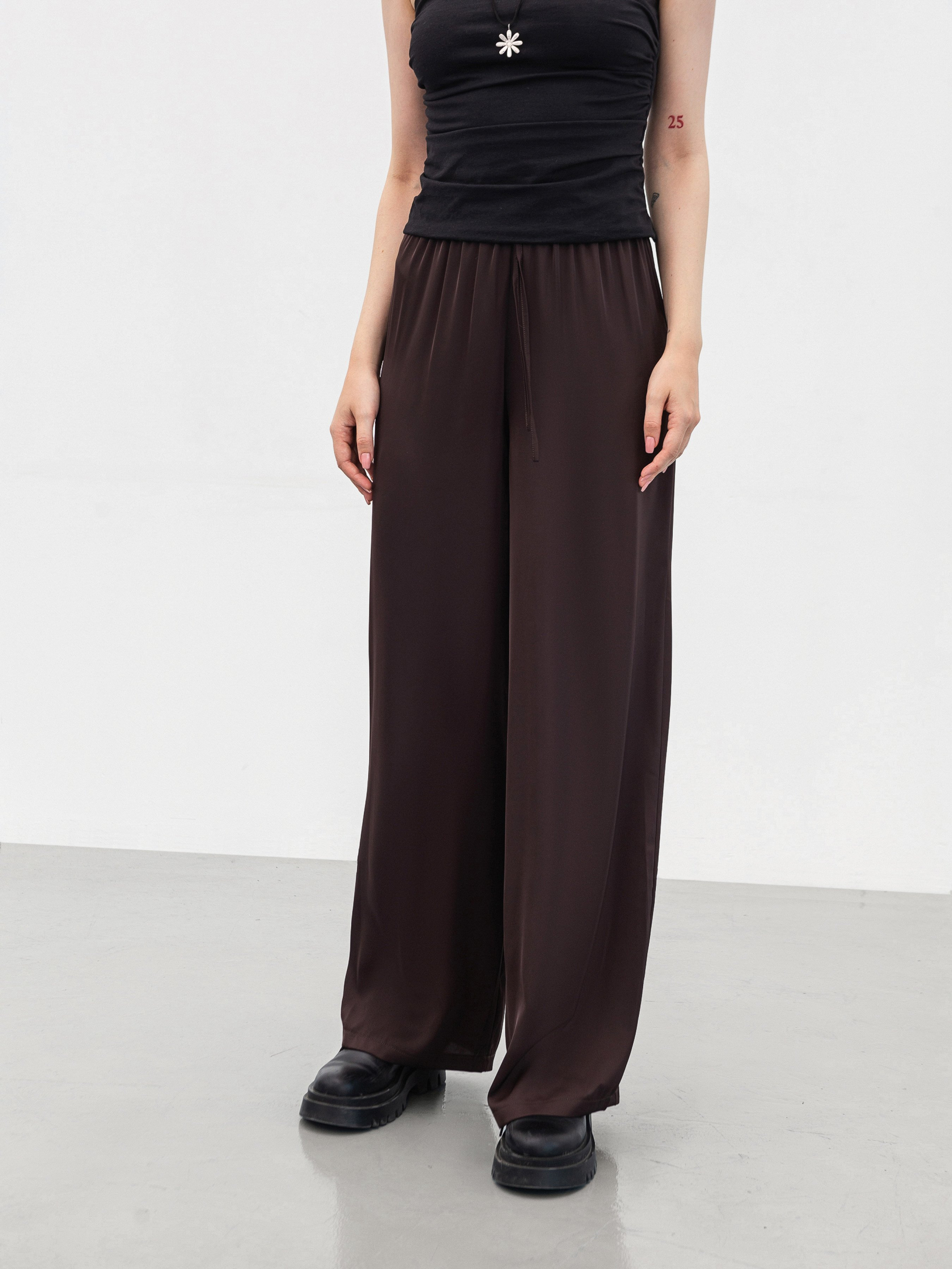 Сатиновые брюки в бельевом стиле. По поясу идет вставка из резинки и тонкого шнура. Материал мягкий и одновременно плотный сатин. Идеальный вариант под любой вариант обуви и верха. XS Длина по внешнему шву : 103 см Полуобхват бедер : 49 см Посадка : 28 см Полуобхват талии : 29 см (резинка) S Длина по внешнему шву: 105 см Полуобхват бедер : 51 см Посадка : 28 см Полуобхват талии : 30 см (резинка) M Длина по внешнему шву: 106 см Полуобхват бедер : 53 см Посадка : 28 см Полуобхват талии : 33 см (резинка) L Длина по внешнему шву: 106 см Полуобхват бедер : 55 см Посадка : 30 см Полуобхват талии : 34 см (резинка) XL Длина по внешнему шву : 109 см Полуобхват бедер : 57 см Посадка : 30 см Полуобхват талии : 35 см (резинка) XXL Длина по внешнему шву: 110 см Полуобхват бедер : 59 см Посадка : 30 см Полуобхват талии : 37 см (резинка)