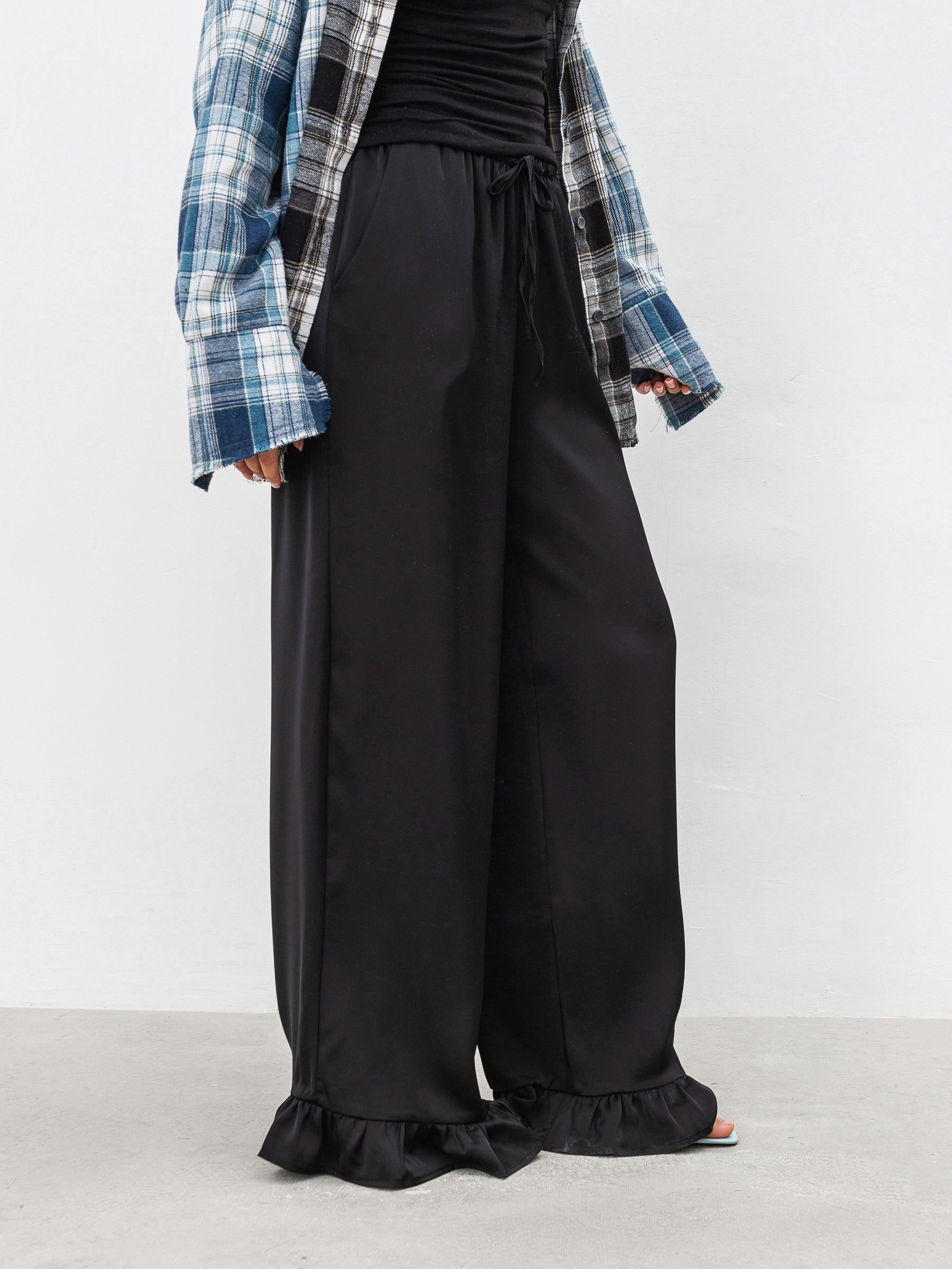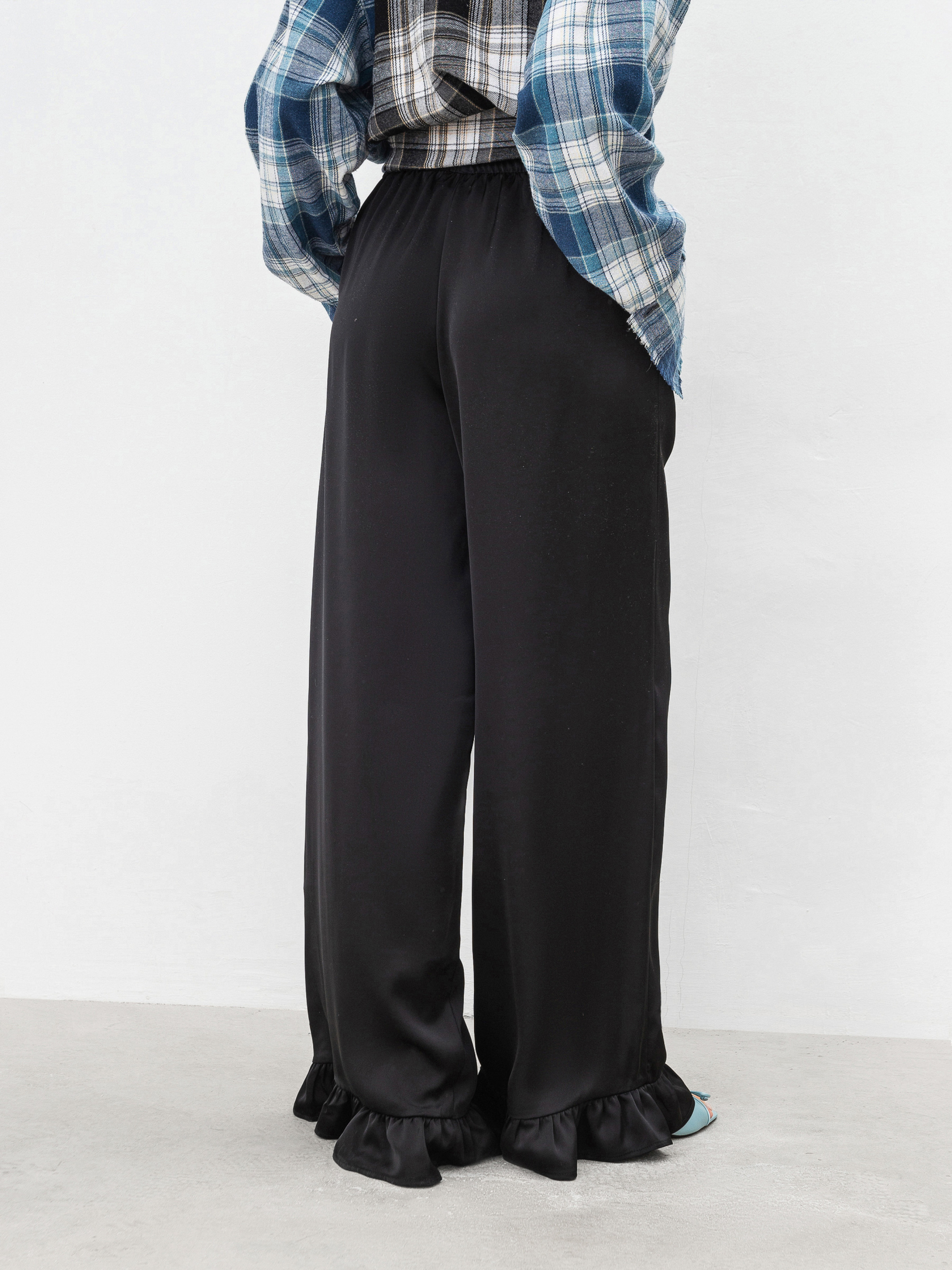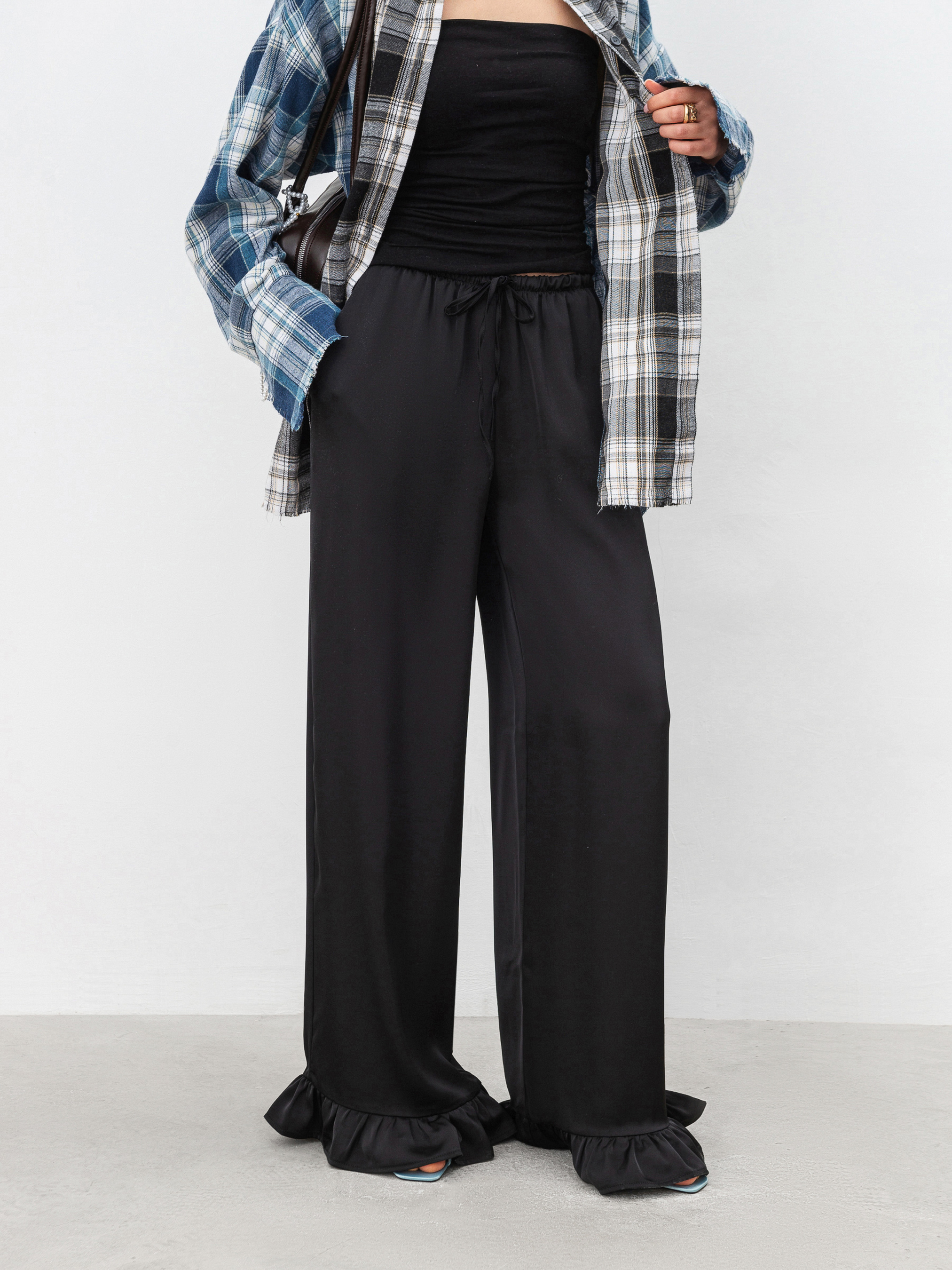 Трендовые сатиновые брюки свободного кроя. Модель имеет рюши по низу и резинку с дополнительным шнурком. Спереди есть кармашки. Изготовлены из сатина, который приятно ощущается на коже. Брюки, которые уже не один сезон держатся в трендах, советуем комбинировать или с базовым верхом, или сатиновыми рубашками/топами. ХС-С Длина по внутреннему шву: 80 см. Длина по внешнему шву: 107 см. Полуобхват бедер: 52 см Ширина по низу: 29 см Посадка: 26 см Полуобхват талии: 31 см С-М Длина по внутреннему шву: 81 см. Длина по внешнему шву: 107 см. Полуобхват бедер: 54 см Ширина по низу: 29 см Посадка: 27 см Полуобхват талии: 35 см М-Л Длина по внутреннему шву: 82 см. Длина по внешнему шву: 108 см. Полуобхват бедер: 55 см Ширина по низу: 30 см Посадка: 28 см Полуобхват талии: 36 см Л-ХЛ Длина по внутреннему шву: 82 см. Длина по внешнему шву: 109 см. Полуобхват бедер: 56 см Ширина по низу: 32 см Посадка: 29 см Полуобхват талии: 37 см