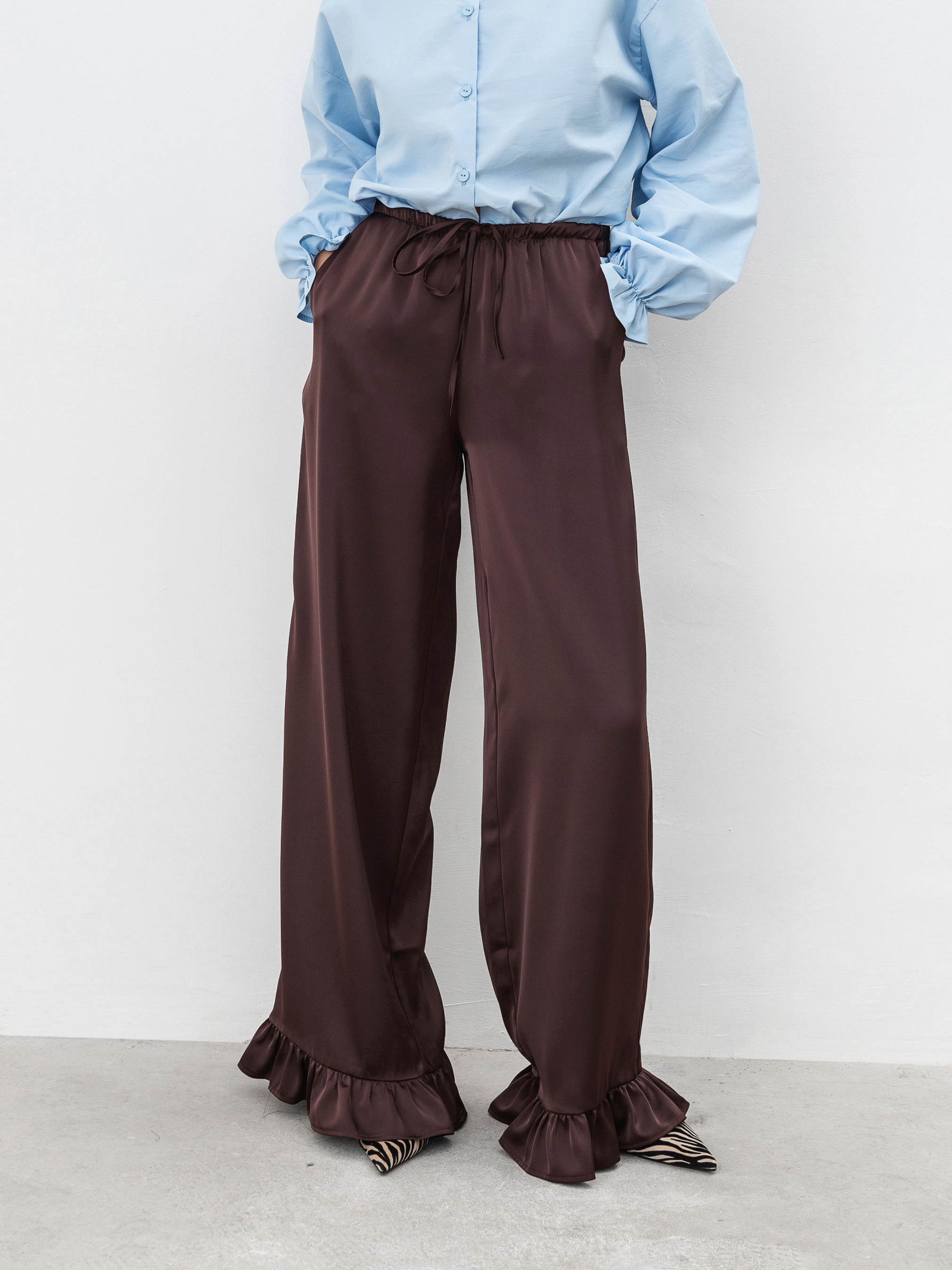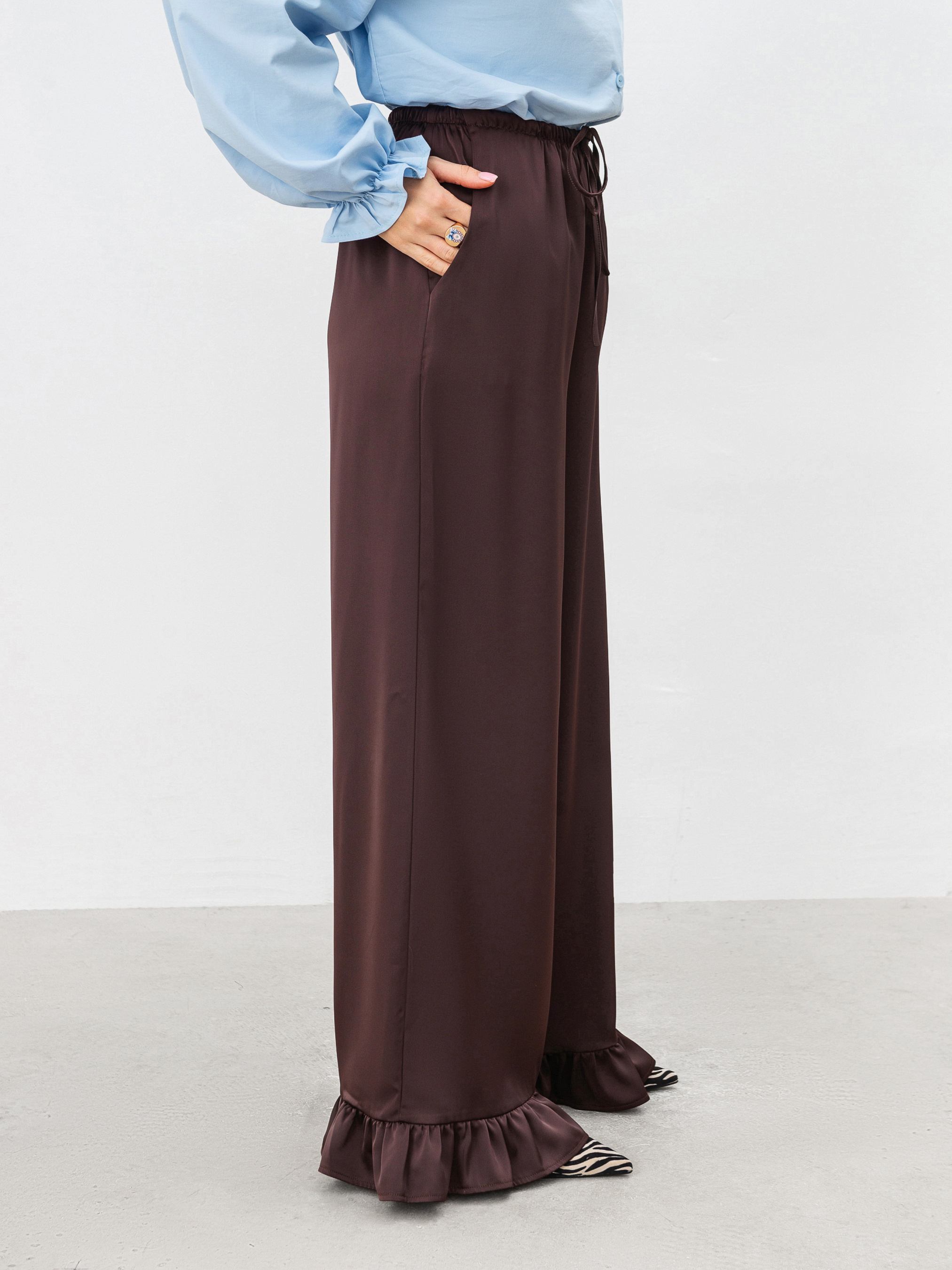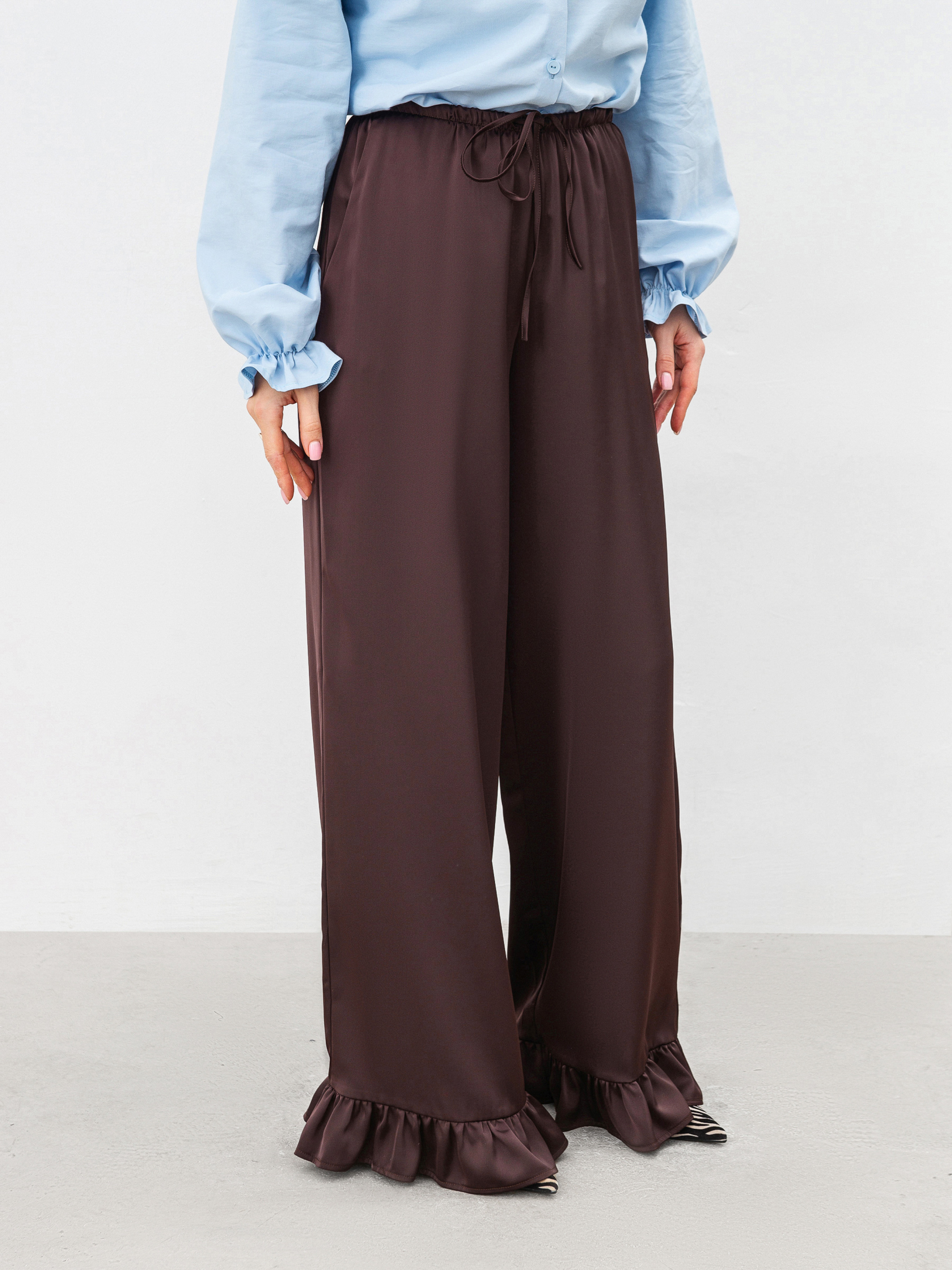 Трендовые сатиновые брюки свободного кроя. Модель имеет рюши по низу и резинку с дополнительным шнурком. Спереди есть кармашки. Изготовлены из сатина, который приятно ощущается на коже. Брюки, которые уже не один сезон держатся в трендах, советуем комбинировать или с базовым верхом, или сатиновыми рубашками/топами. ХС-С Длина по внутреннему шву: 80 см. Длина по внешнему шву: 107 см. Полуобхват бедер: 52 см Ширина по низу: 29 см Посадка: 26 см Полуобхват талии: 31 см С-М Длина по внутреннему шву: 81 см. Длина по внешнему шву: 107 см. Полуобхват бедер: 54 см Ширина по низу: 29 см Посадка: 27 см Полуобхват талии: 35 см М-Л Длина по внутреннему шву: 82 см. Длина по внешнему шву: 108 см. Полуобхват бедер: 55 см Ширина по низу: 30 см Посадка: 28 см Полуобхват талии: 36 см Л-ХЛ Длина по внутреннему шву: 82 см. Длина по внешнему шву: 109 см. Полуобхват бедер: 56 см Ширина по низу: 32 см Посадка: 29 см Полуобхват талии: 37 см