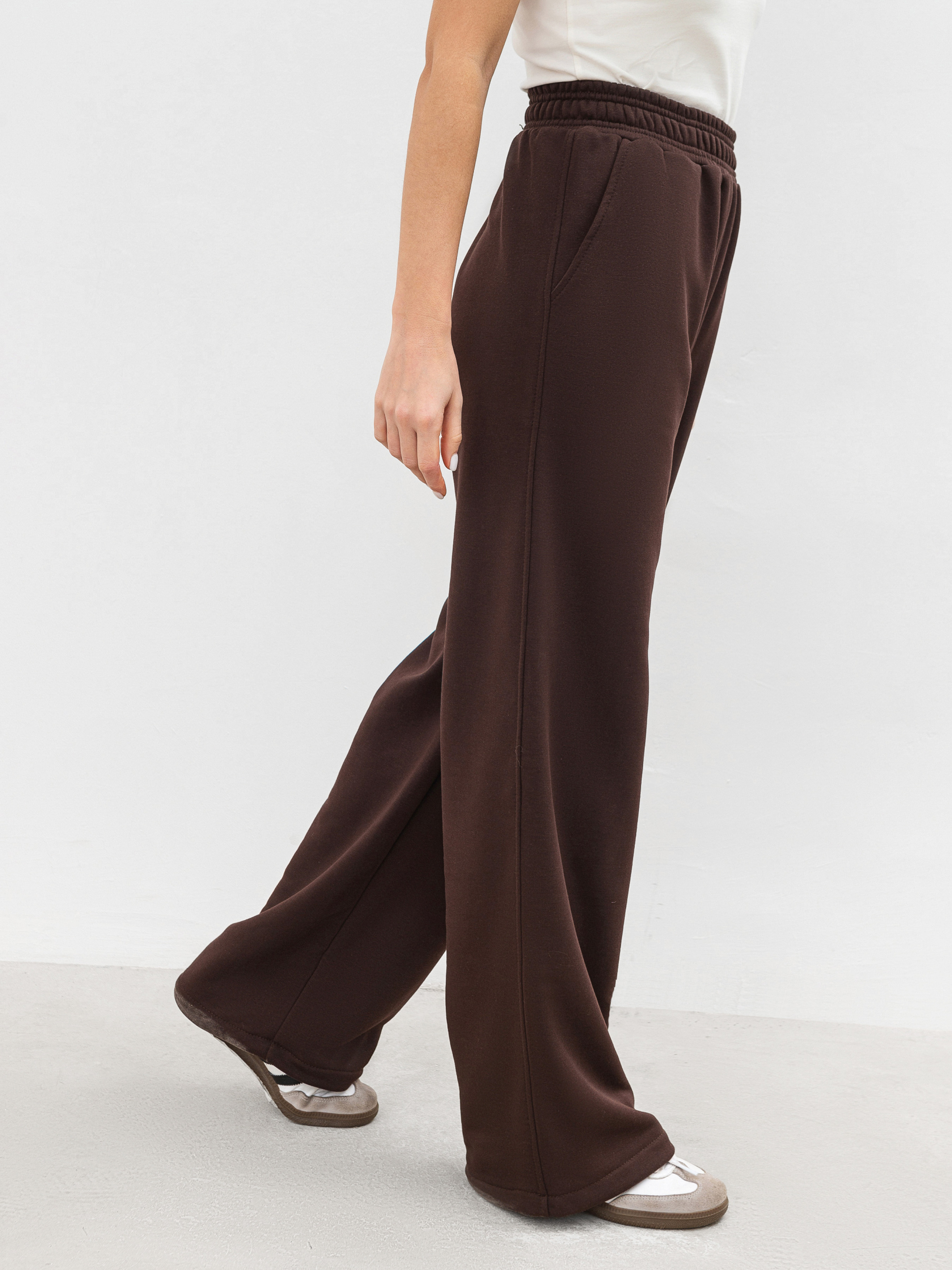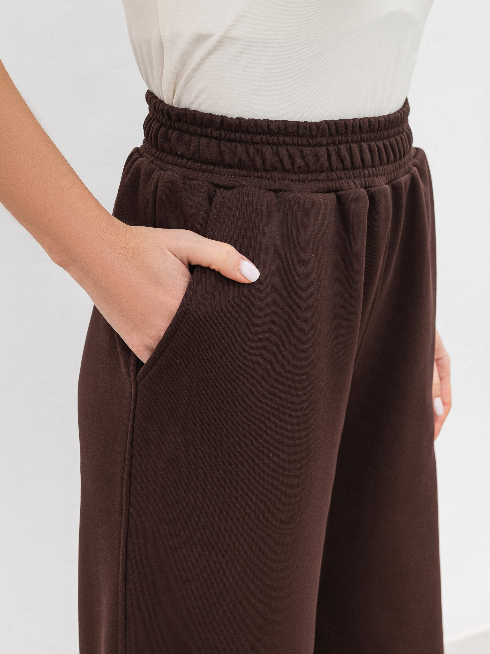 Брюки Смузи - идеальное сочетание комфорта и современного кроя. Благодаря высокой посадке модель красиво садится по фигуре, а эластичный пояс обеспечивает комфортную посадку без давления. Модель дополнена вместительными карманами, что делает ее еще более практичной. По низу брюк расположены кулиски, с помощью которых можно регулировать ширину штанин и менять образ - от классических прямых до слегка зауженных книзу. Материал: трикотаж трехнитка, содержащий 70% хлопка, поэтому изделие хорошо дышит, приятный на ощупь и не вызывает дискомфорта. Полиэстер в составе добавляет ткани прочности, благодаря чему брюки сохраняют форму даже после нескольких циклов стирки. Идеальное решение для городского стиля, активного отдыха или путешествий. Брюки легко сочетаются с худи, свитшотами и базовыми футболками, создавая универсальные образы на разные случаи жизни. ХС Длина по внутреннему шву: 81 см. Длина по внешнему шву: 107 см. Полуобхват бедер: 51 см Ширина по низу: 26 см Посадка: 30 см Полуобхват талии: 30 см С Длина по внутреннему шву: 81 см. Длина по внешнему шву: 107 см. Полуобхват бедер: 52 см Ширина по низу: 26 см Посадка: 30 см Полуобхват талии: 31 см М Длина по внутреннему шву: 82 см. Длина по внешнему шву: 107 см. Полуобхват бедер: 53 см Ширина по низу: 27 см Посадка: 30 см Полуобхват талии: 32 см Л Длина по внутреннему шву: 83 см. Длина по внешнему шву: 107 см. Полуобхват бедер: 55 см Ширина по низу: 27 см Посадка: 30 см Полуобхват талии: 33 см ХЛ Длина по внутреннему шву: 83 см. Длина по внешнему шву: 108 см. Полуобхват бедер: 57 см Ширина по низу: 29 см Посадка: 31 см Полуобхват талии: 35 см