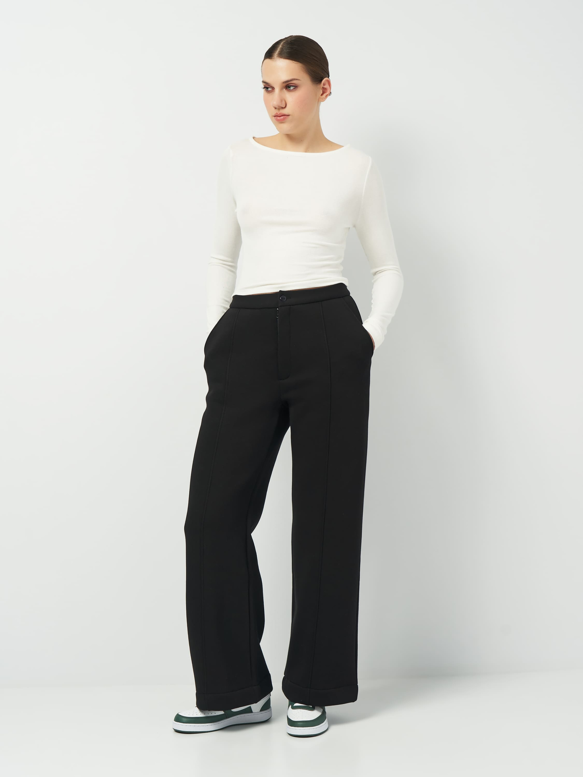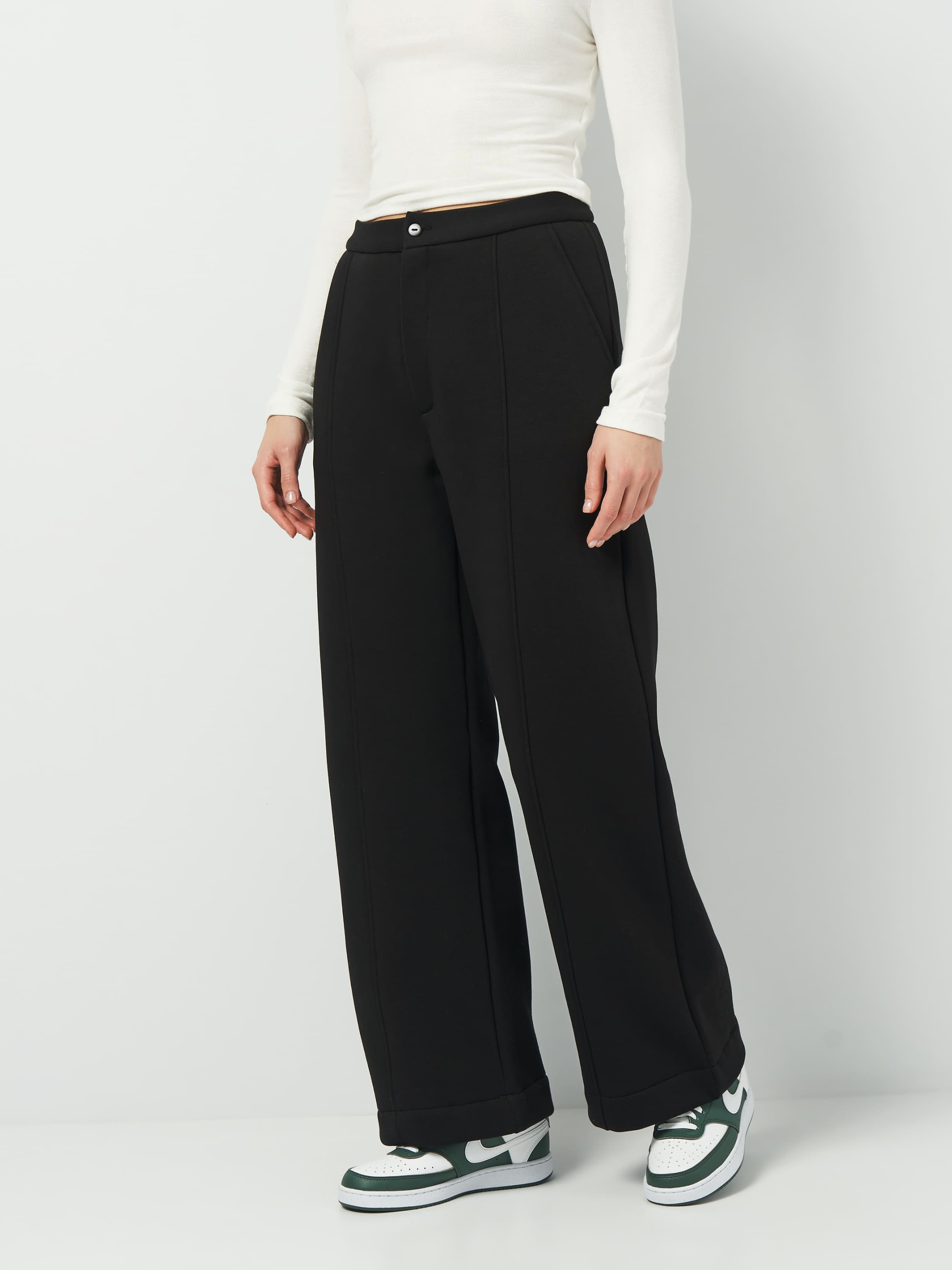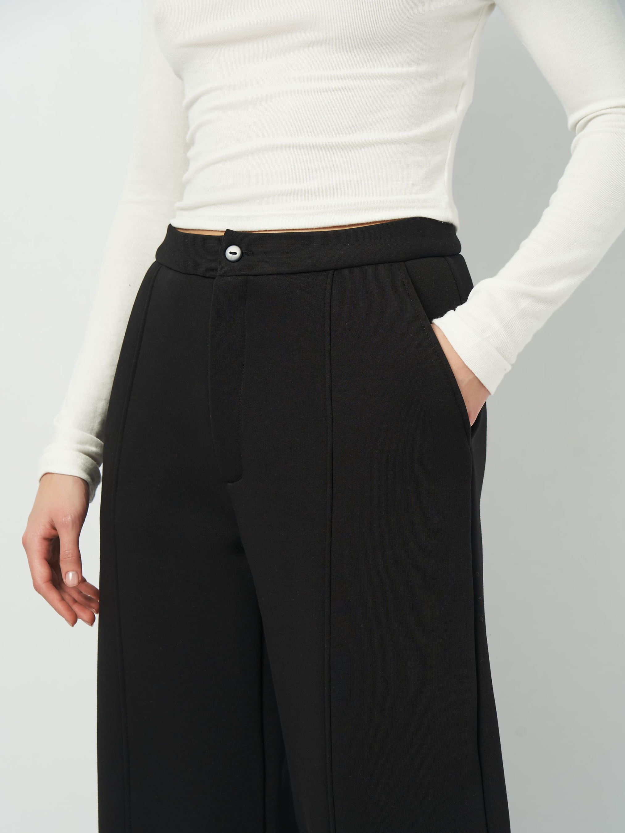 Элегантные зимние брюки прямого широкого кроя с теплым начесом — идеальный выбор для прохладного времени года. Модель имеет стрелки, придающие образу изысканности, и застегивается на молнию и пуговицу, обеспечивая классический вид и комфортную посадку. Боковые карманы с отрезным бочком делают штаны практичными и удобными в использовании. Благодаря универсальному дизайну, они прекрасно сочетаются как с теплыми свитерами, так и с более формальными элементами гардероба. Футер с начесом изготовлен с использованием современных технологий на трикотажной фабрике Роза. Это высококачественное трикотажное полотно имеет плотную структуру с внутренней мягкой начесной поверхностью, которая сохраняет тепло и обеспечивает ощущение комфорта даже в самые холодные дни. Благодаря добавлению 14% полиэстера ткань остается эластичной, сохраняя форму и вид даже после многократной стирки. Натуральный состав и продуманная разработка производства обеспечивают долговечность материала и его устойчивость к деформации.