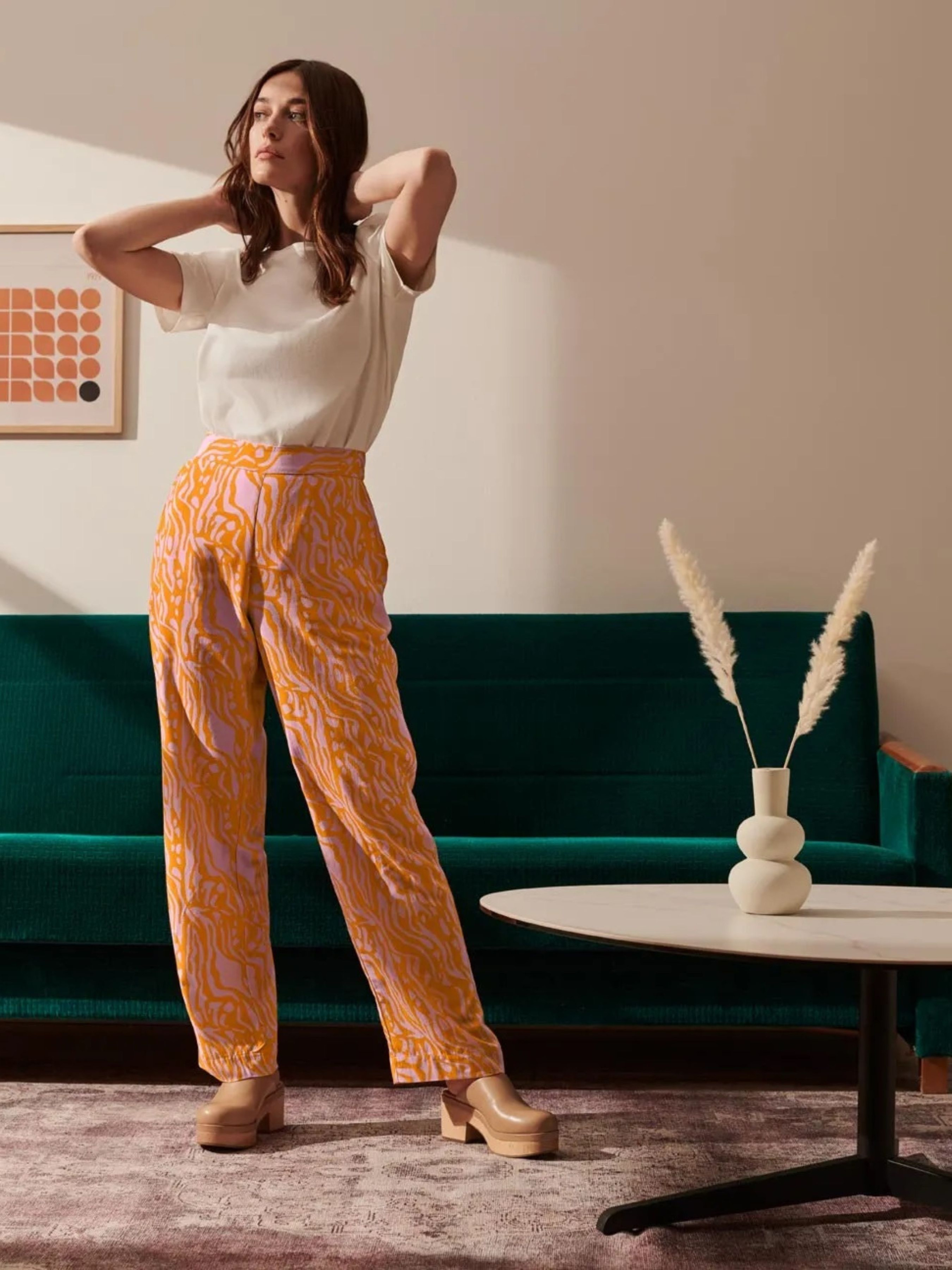 Легкие брюки с летним принтом.Мягкое качество, изготовленное из чистой вискозы.С эластичной вставкой на спине.2 боковых кармана,прямая нога.