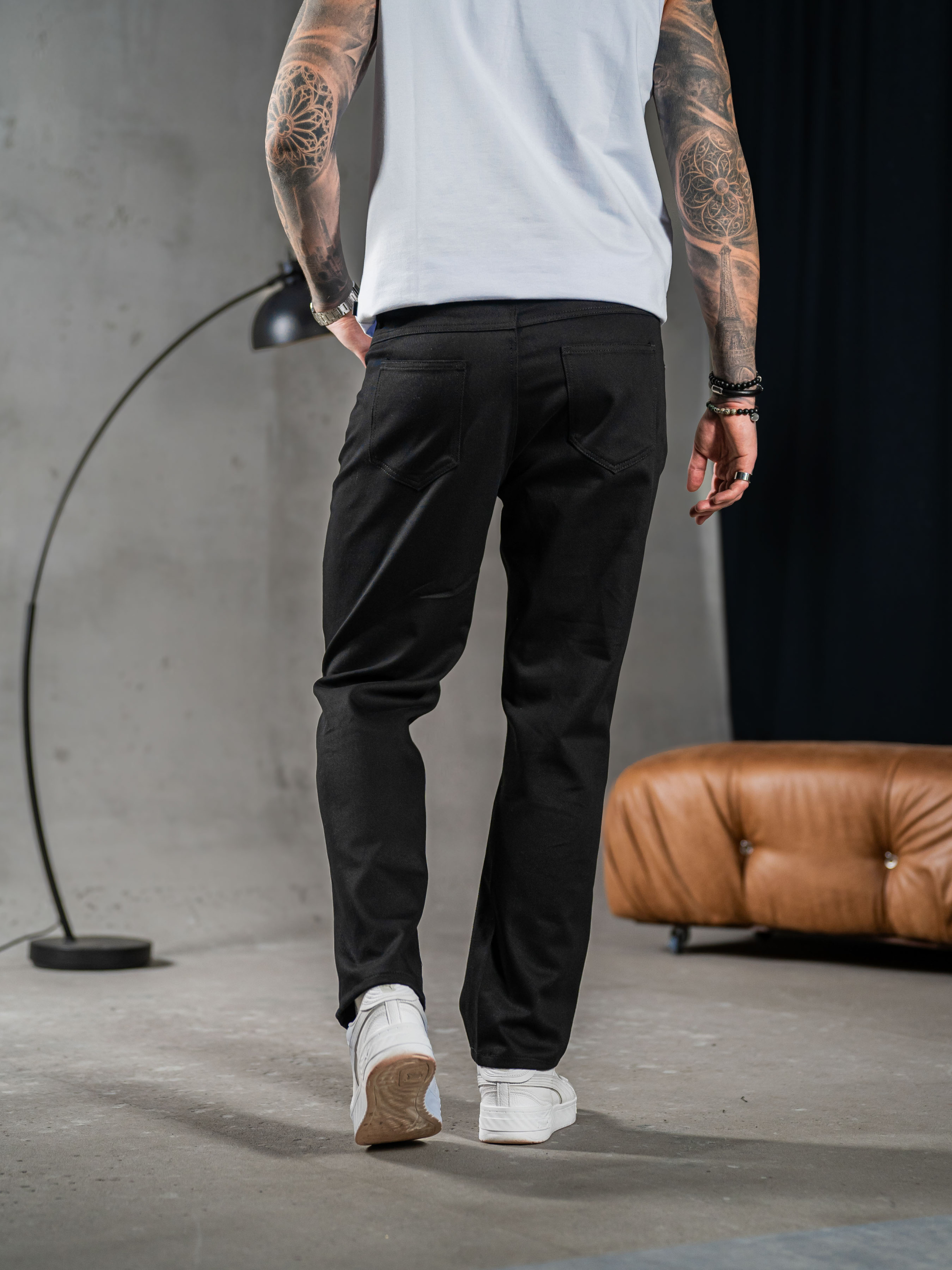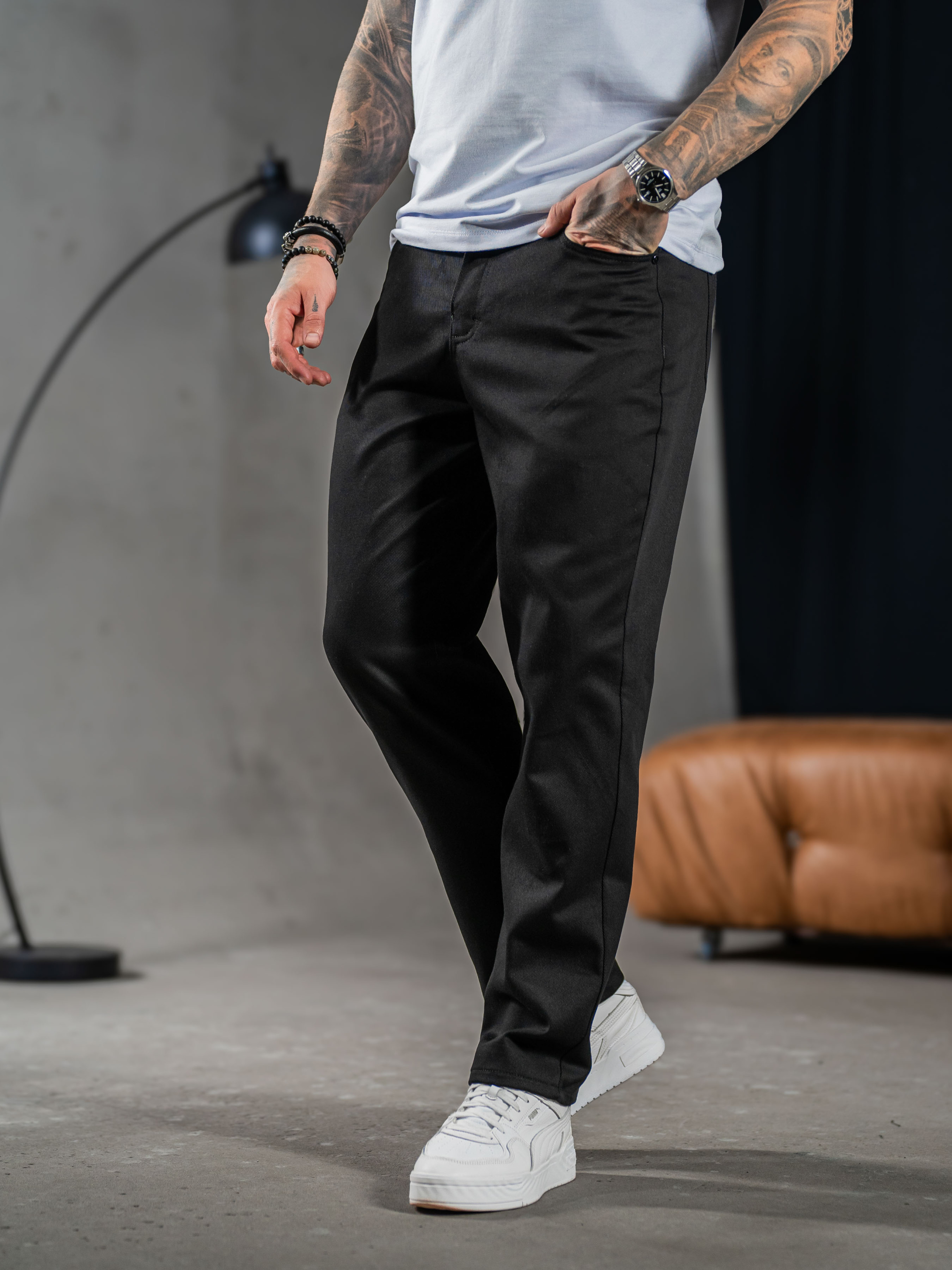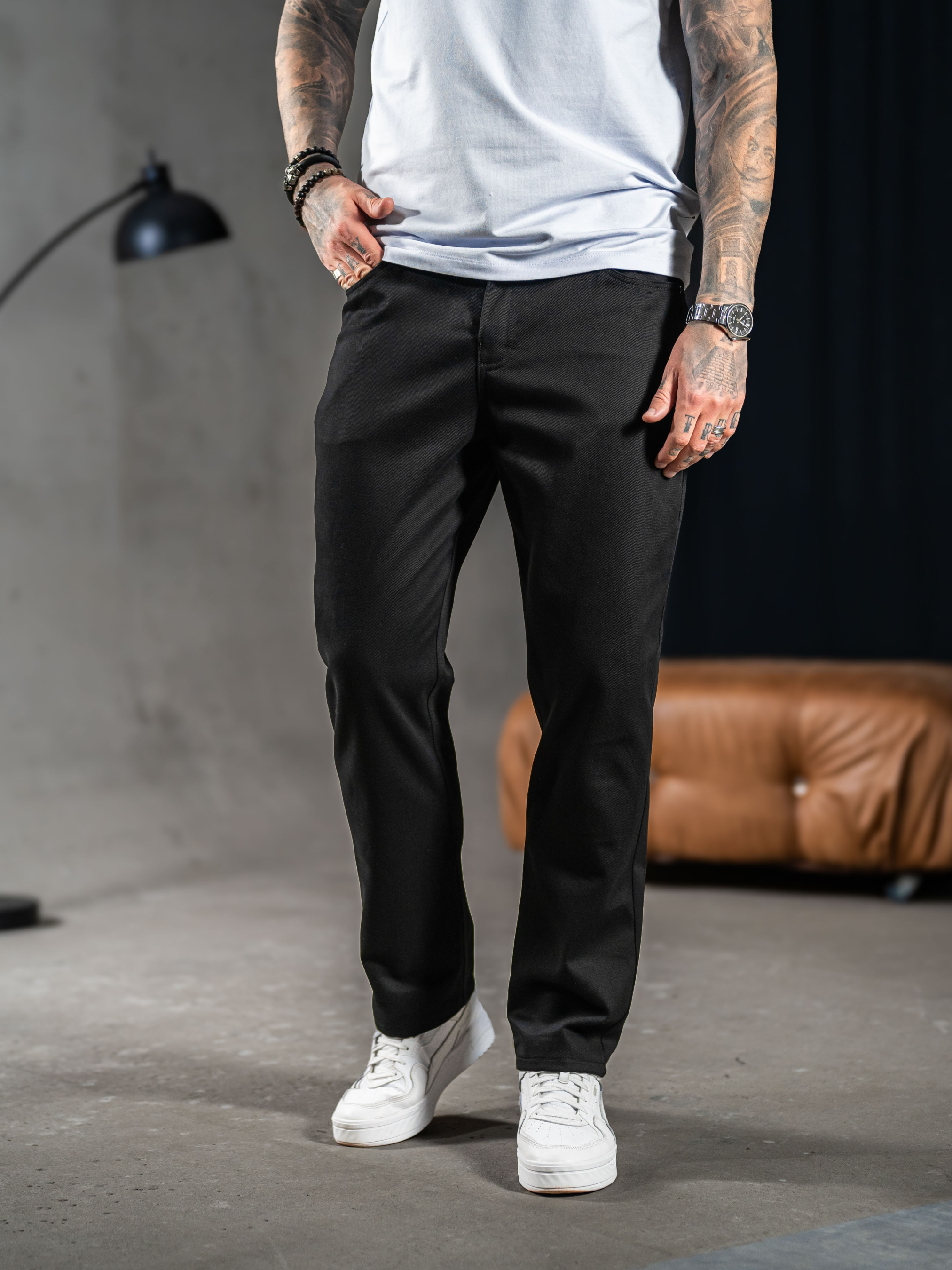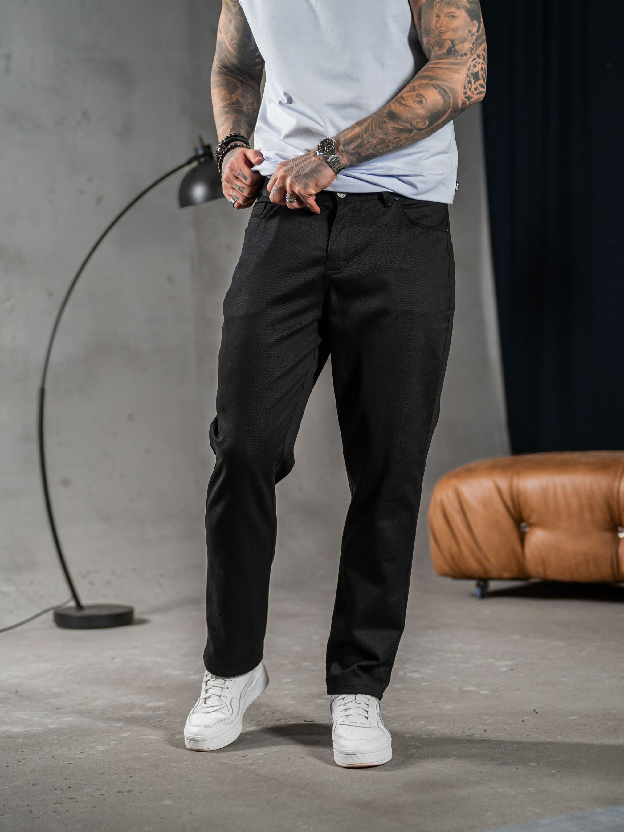 Мужские брюки выполнены из Джинс коттона, эластичная и мягкая ткань с фактурным диагональным плетением. Состав: 97% Хлопок, 3% эластан, 320г/м².