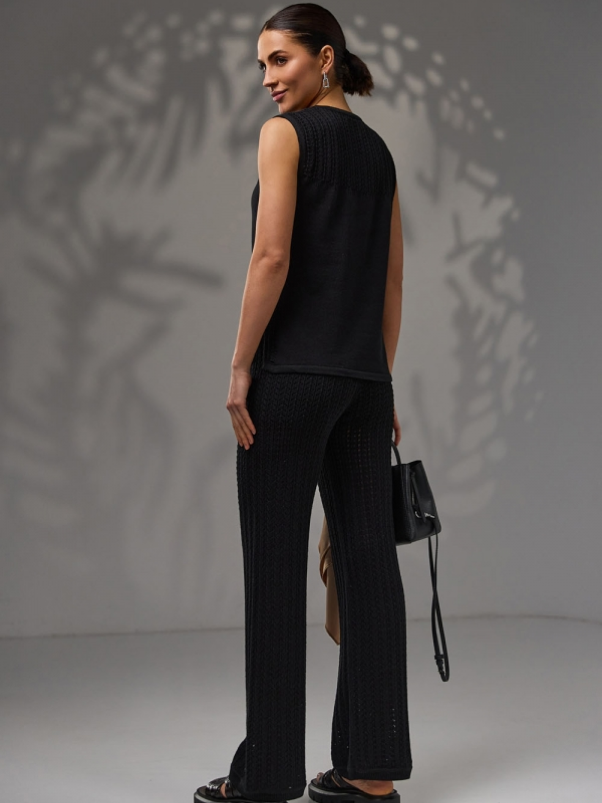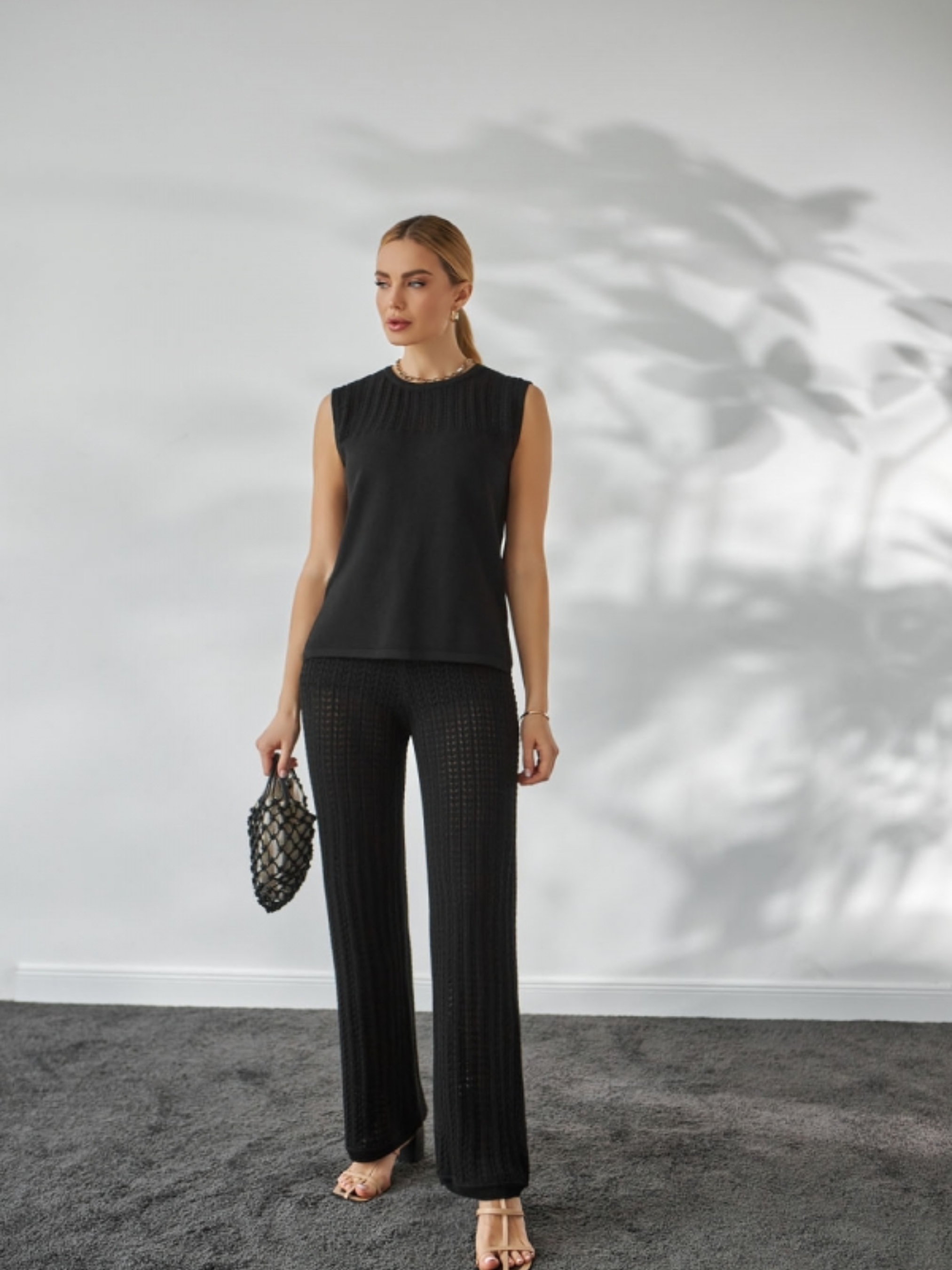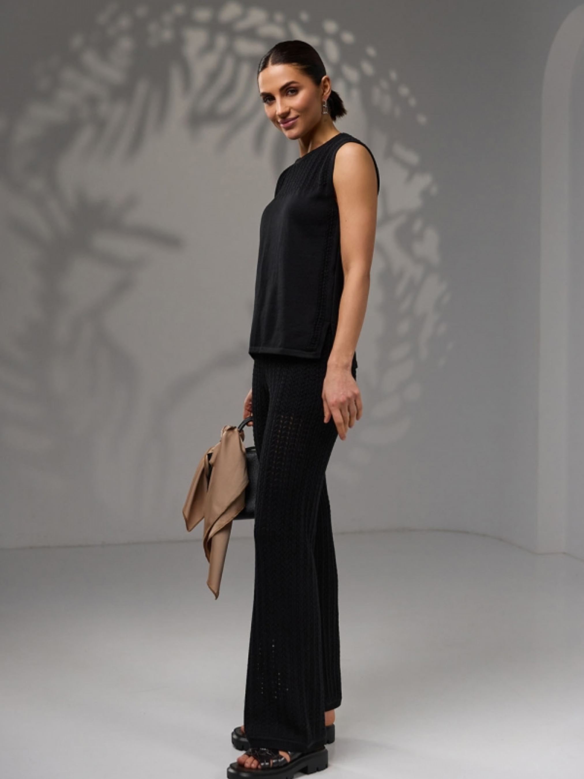 Ці ажурні штани — ідеальний вибір для літа. Виготовлені з натуральної пряжі з додаванням бавовни та віскози, вони дарують приємне відчуття на шкірі, забезпечують повітропроникність і комфорт навіть у спеку. Стильне фактурне переплетення візуально подовжує ноги та вигідно підкреслює фігуру. Модель оснащена м’яким еластичним поясом і трикотажними шортами-підкладкою, які додають впевненості та зручності у щоденному носінні. Штани чудово пасують до топів, футболок або легких сорочок, створюючи жіночний і витончений літній образ. Розміри: Довжина по боковому шву: близько 105 см (+- 2 см) Довжина крокового шва: 74–76 см Ширина у талії (в спокійному стані): 24–26 см У розтягнутому стані: 33–35 см Ширина у стегнах: 44–52 см Ширина штанини по низу: 25–27 см