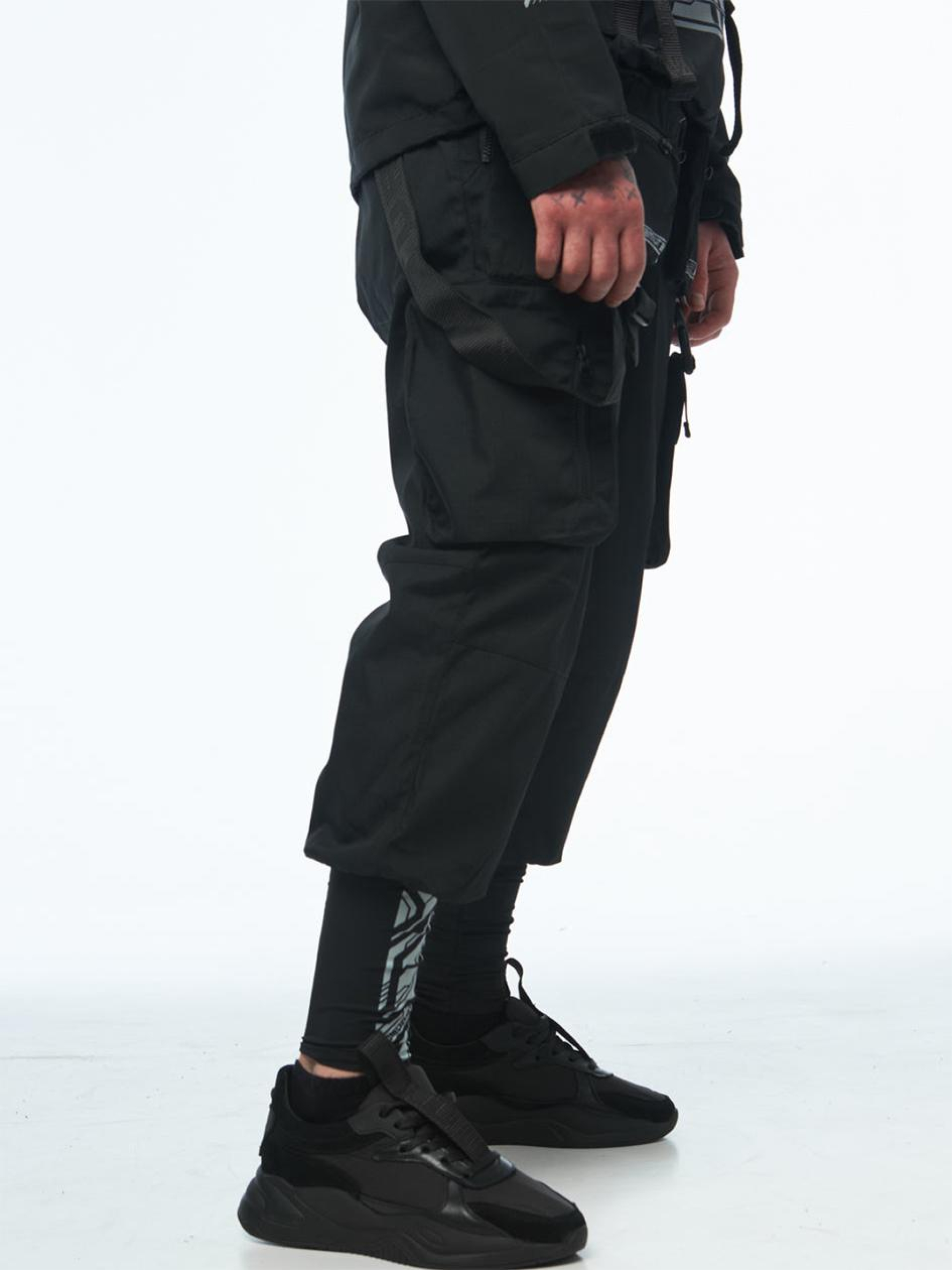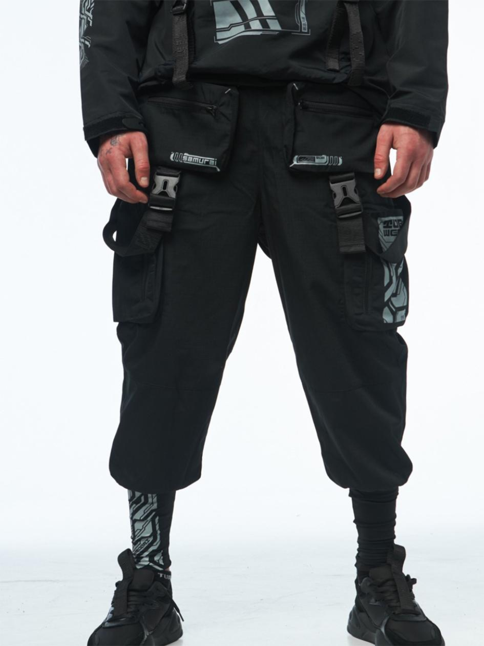 Состав ткани: 100% полиэстер. Особенности материалов и фурнитуры: Основная ткань — рипстоп: плотный, износостойкий материал с армирующей структурой, выдерживающий механическую нагрузку. Вставки из бифлекса – эластичные, хорошо тянутся и обеспечивают комфорт и свободу движений. Оба материала устойчивы к износу и подходят для активного использования. Фурнитура — молнии YKK, устойчивые к нагрузкам и многократному использованию. Ключевые особенности модели: Карго-штаны свободной посадки, созданные для тех, кто ценит не только функционал, но и детализацию. Восемь карманов: два боковых, два фронтальных объемных, два на молниях по бокам и два задних со скрытым входом под планкой — все на застежках-молниях для надежности. Пять контрастных белых принтов расположены на карманах и манжете, придавая визуальный ритм образа. Низ штанов выполнен в виде манжета из бифлекса, плотно прилегающего и обеспечивающего удобство в движении. Пояс – на резинке со шнурком. Декоративные стропы шириной 4 см с регулируемыми лямками придают тактическую эстетику. Идеальный вариант для урбан-самурая в условиях мегаполиса. Сопутствующие товары: Длинная оверсайз футболка SM-2419, Худые мантия SM-2414 Рекомендации по уходу: Машинная стирка при макс. 30 ºC Нельзя использовать отбеливатель Упражнение при макс. 150 ºC Химчистка запрещена Можно сушить в сушилке при низкой температуре