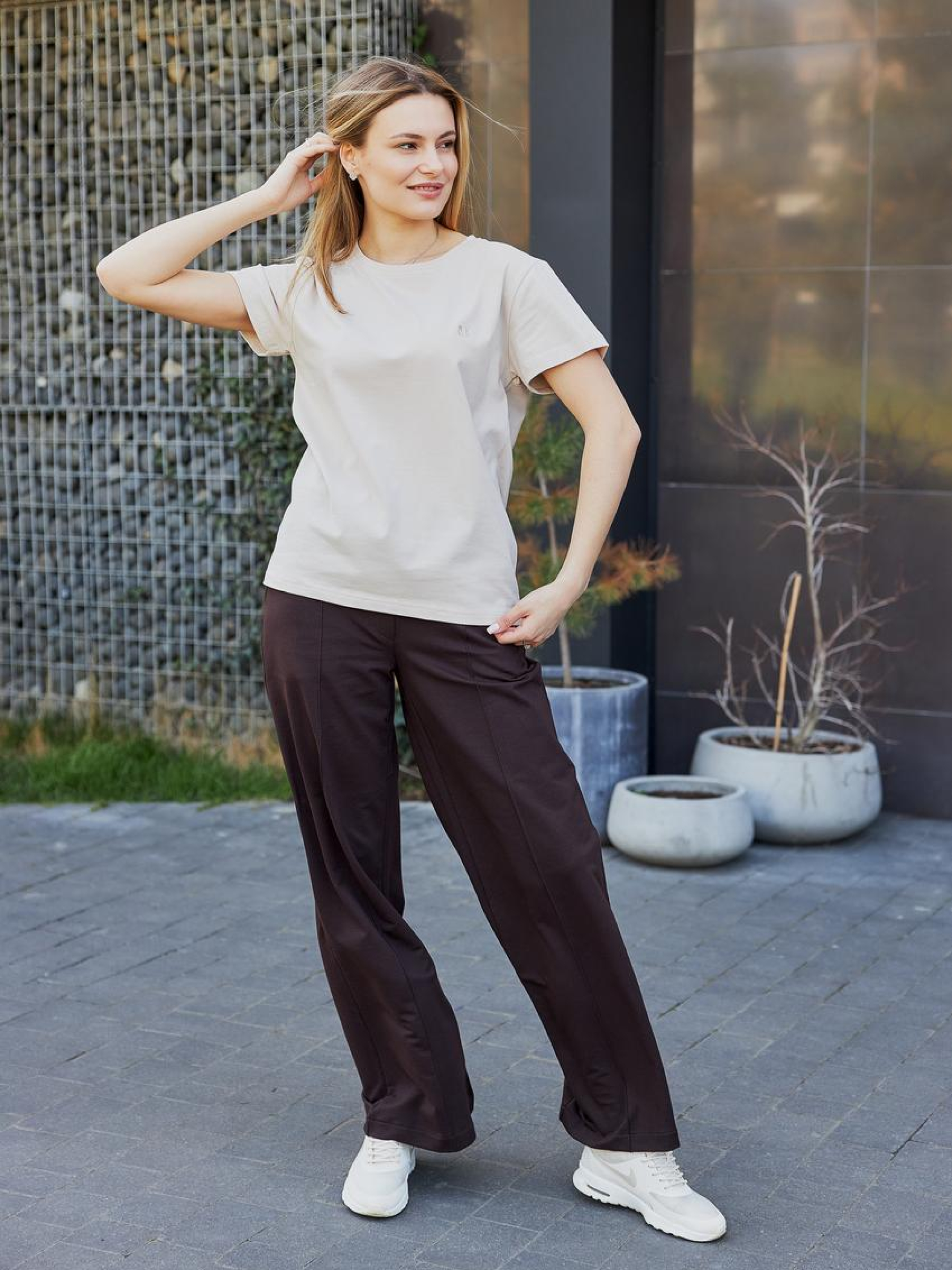 Женские брюки палаццо из двунитки — лёгкость, свобода и стиль в каждом движении Стильные широкие брюки фасона палаццо — это модная база для комфортных и женственных образов. Изготовлены из приятной к телу двунитки, они обеспечивают мягкость, воздухопроницаемость и свободу движений. Идеальны для весны, осени и прохладного лета. Брюки имеют прямой крой с расклёшиванием от бедра, визуально удлиняют ноги и делают силуэт более утончённым. Эластичный пояс с завязками легко подстраивается под фигуру, обеспечивая удобную посадку без давления. Палаццо прекрасно сочетаются с футболками, свитшотами, кроп-топами или жакетами — как для городского casual, так и для расслабленного athleisure. Преимущества: Мягкая, дышащая двунитка — комфорт при движении Силуэт палаццо — визуально удлиняет ноги Эластичный пояс — удобная посадка Универсальный стиль — легко сочетается с любым верхом Подходят для прогулок, дома, путешествий и повседневной носки Женские палаццо из двунитки — свобода, которая выглядит стильно!