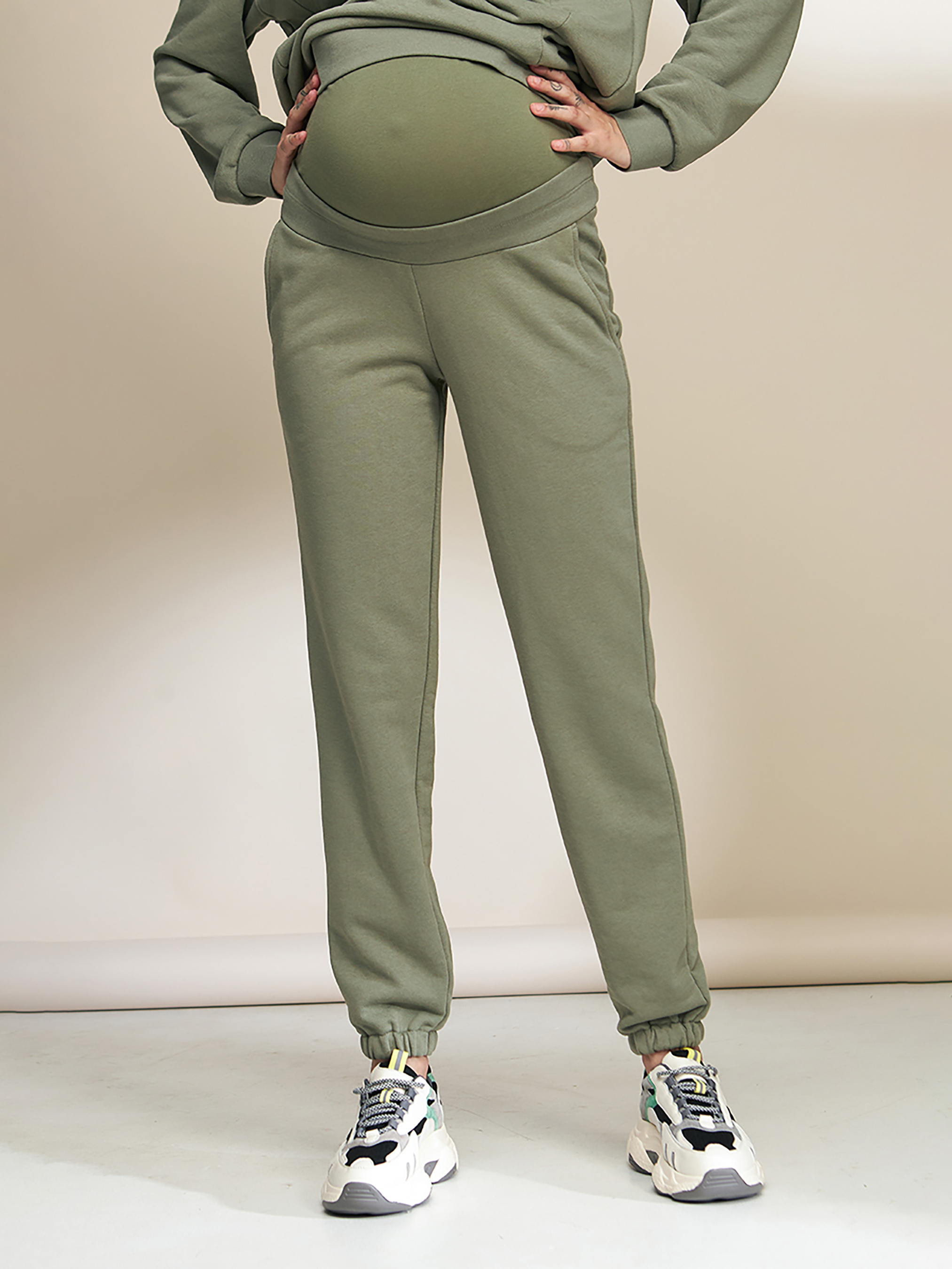Спортивные брюки-джогеры для беременных из плотного трикотажа. Силуэт: свободны по бедрам и сужены книзу. Тип пояса - комбинированный: низкий под живот с двойной регулировкой + высокая хлопковая трикотажный пояс с перфорированной резинкой, позволяющий носить эту модель во время и после беременности (предварительно убрав высокий пояс). Карманы: впереди карманы с косым входом. Ткань: хлопковый трикотаж петля (без начеса). Растяженность ткани: примерно 4-8%. Цвет: темная оливка. На фотографии: размер модели S, объем груди 88 см, бедер 93 см, рост 174 см. Ориентировочные измерения готового изделия: S: Длина шагового шва 75 см, Талия 80 см, Бедра 93 см. M: Длина шагового шва 75,1 см, Талия 84 см, Бедра 97,6 см. L: Длина шагового шва 75,1 см, Талия 88 см, Бедра 102,4 см. XL: Длина шагового шва 75,2 см, талия 92 см, бедра 107,8 см. Состав: 70% Хлопок, 30% Полиэстер