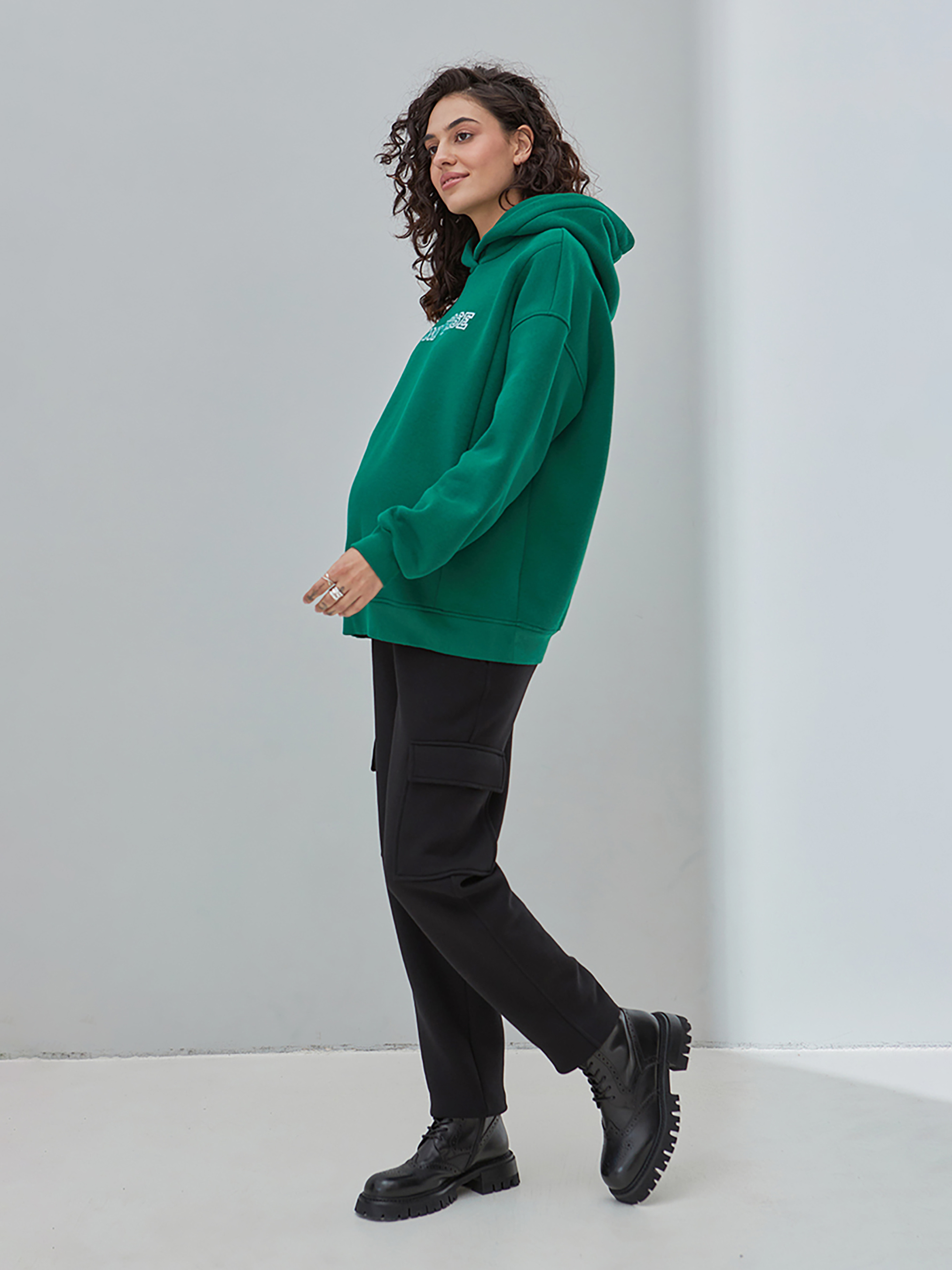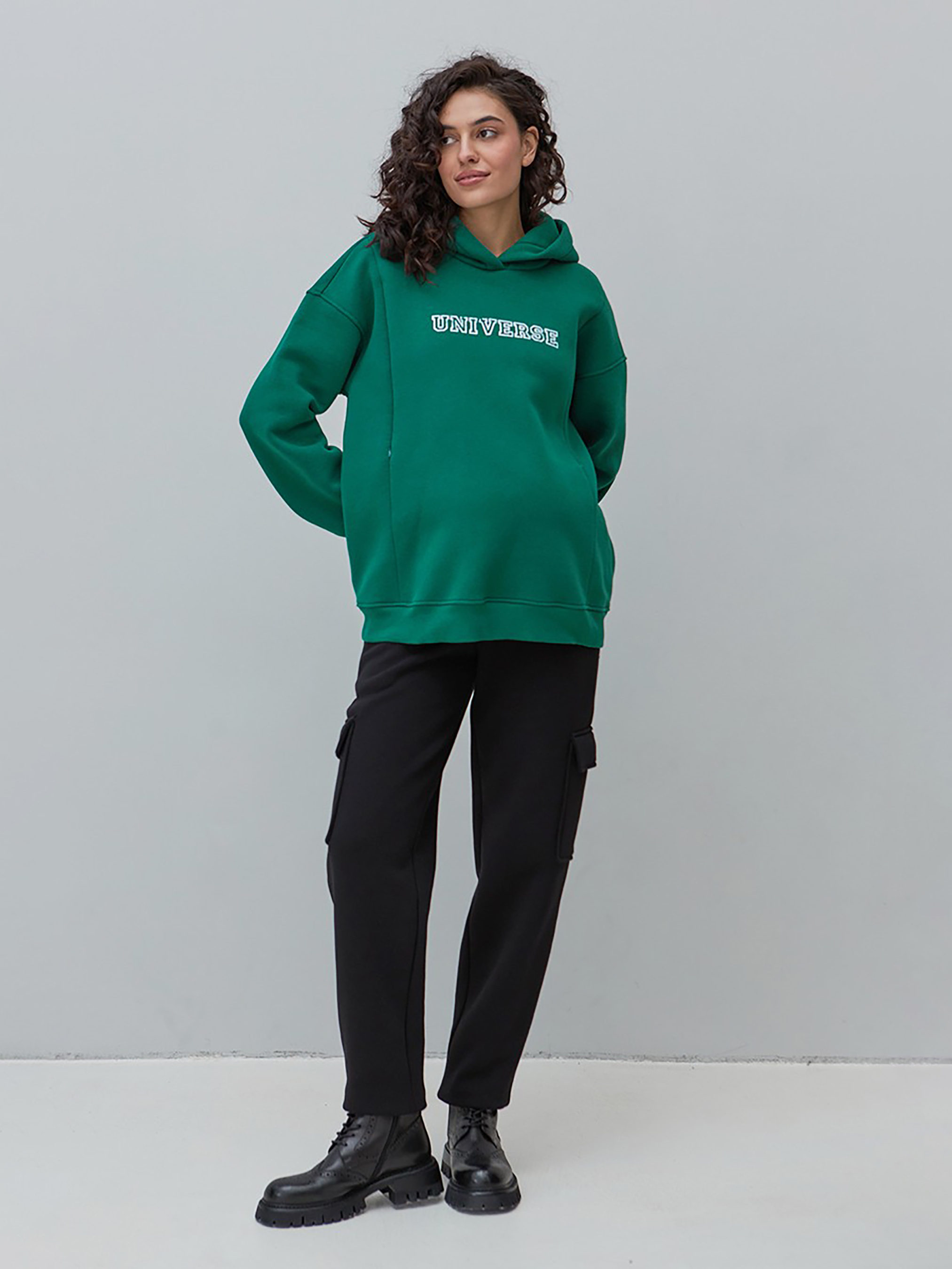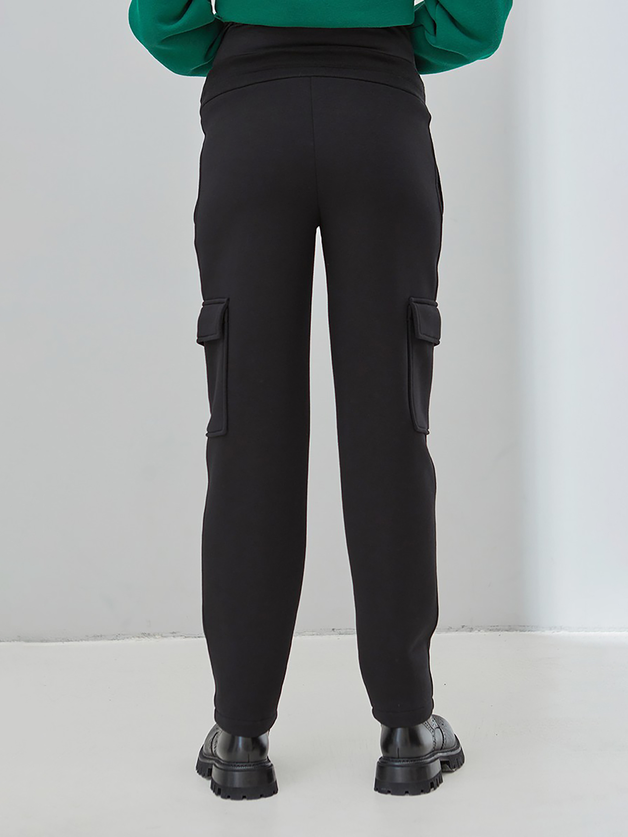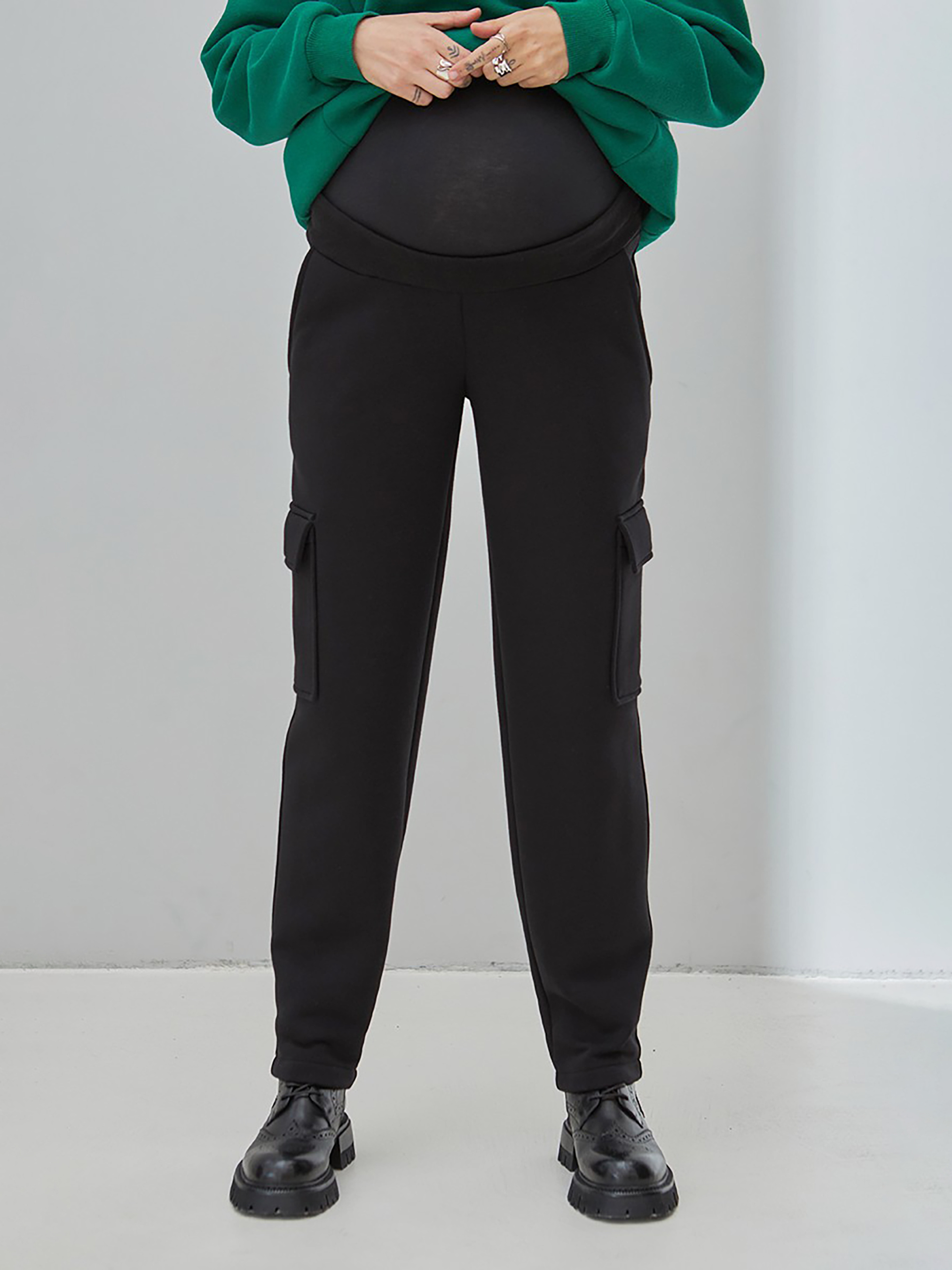 Теплые штаны-карго для беременных из плотного трикотажа с начесом. Силуэт: свободны по бедрам и сужены книзу. Тип пояса - комбинированный: бандажный + высокий хлопковый трикотажный пояс из перфорированной резинкой позволяют носить эту модель во время и после беременности (предварительно убрав высокий пояс). Карманы: впереди карманы с косым входом и накладные карманы на боках брюк. Ткань: хлопчатобумажный трикотаж тринитка с начесом. Растяжимость ткани: примерно 4-8%. Цвет: черный. На фотографии: размер модели S, объем груди 88 см, бедер 93 см, рост 174 см. Ориентировочные измерения готового изделия: S: Длина шагового шва 75,4 см, Талия 75 см, Бедра 94 см. M: Длина шагового шва 75,5 см, Талия 79 см, Бедра 98,4 см. L: Длина шагового шва 75,5 см, Талия 83 см, Бедра 103,2 см. XL: Длина шагового шва 75,6 см. см, Талия 87 см, Бедра 108,6 см. Усадка изделия после первой стирки и утюга –1 см. Состав: 70% Хлопок, 30% Полиэстер