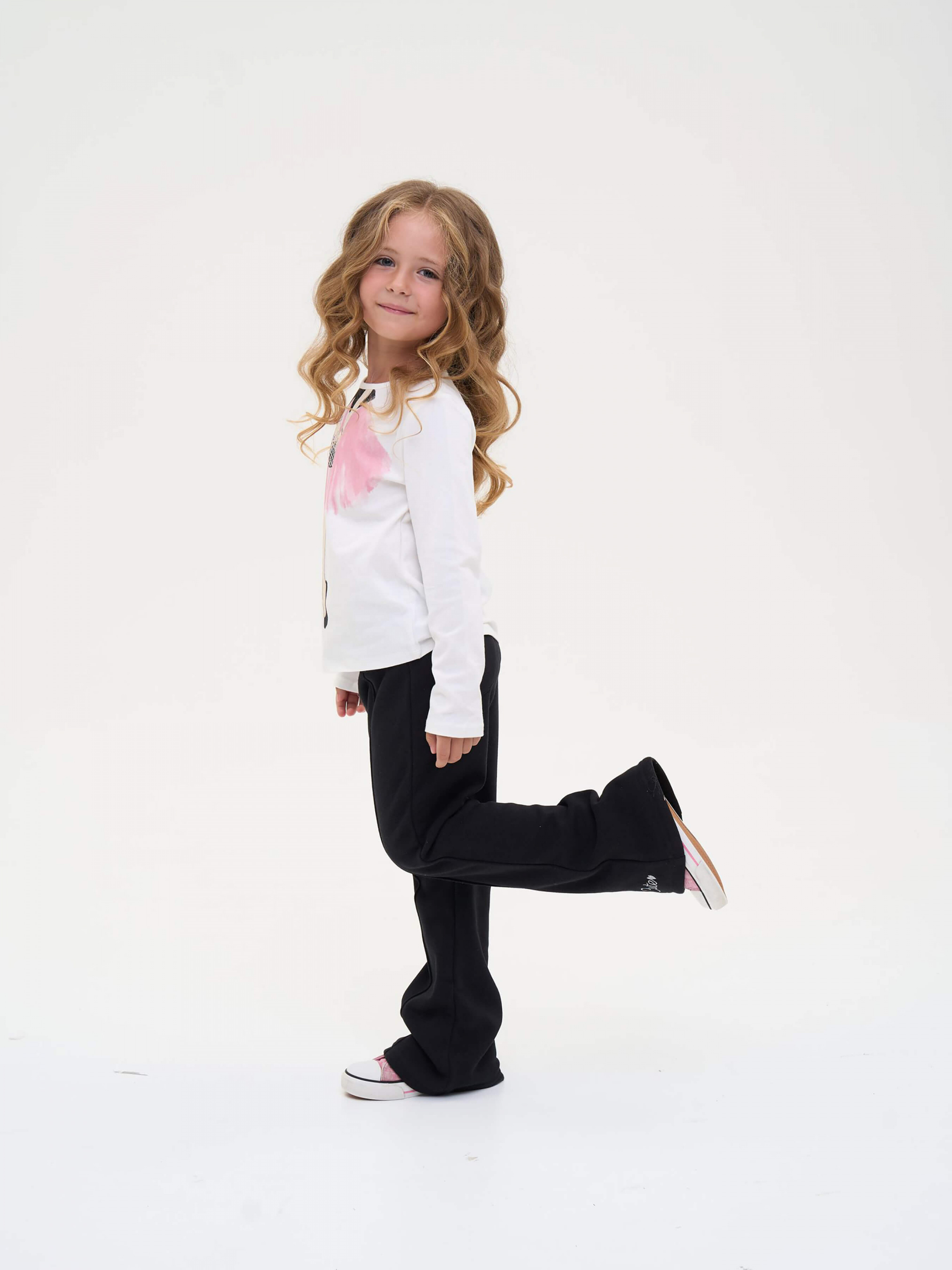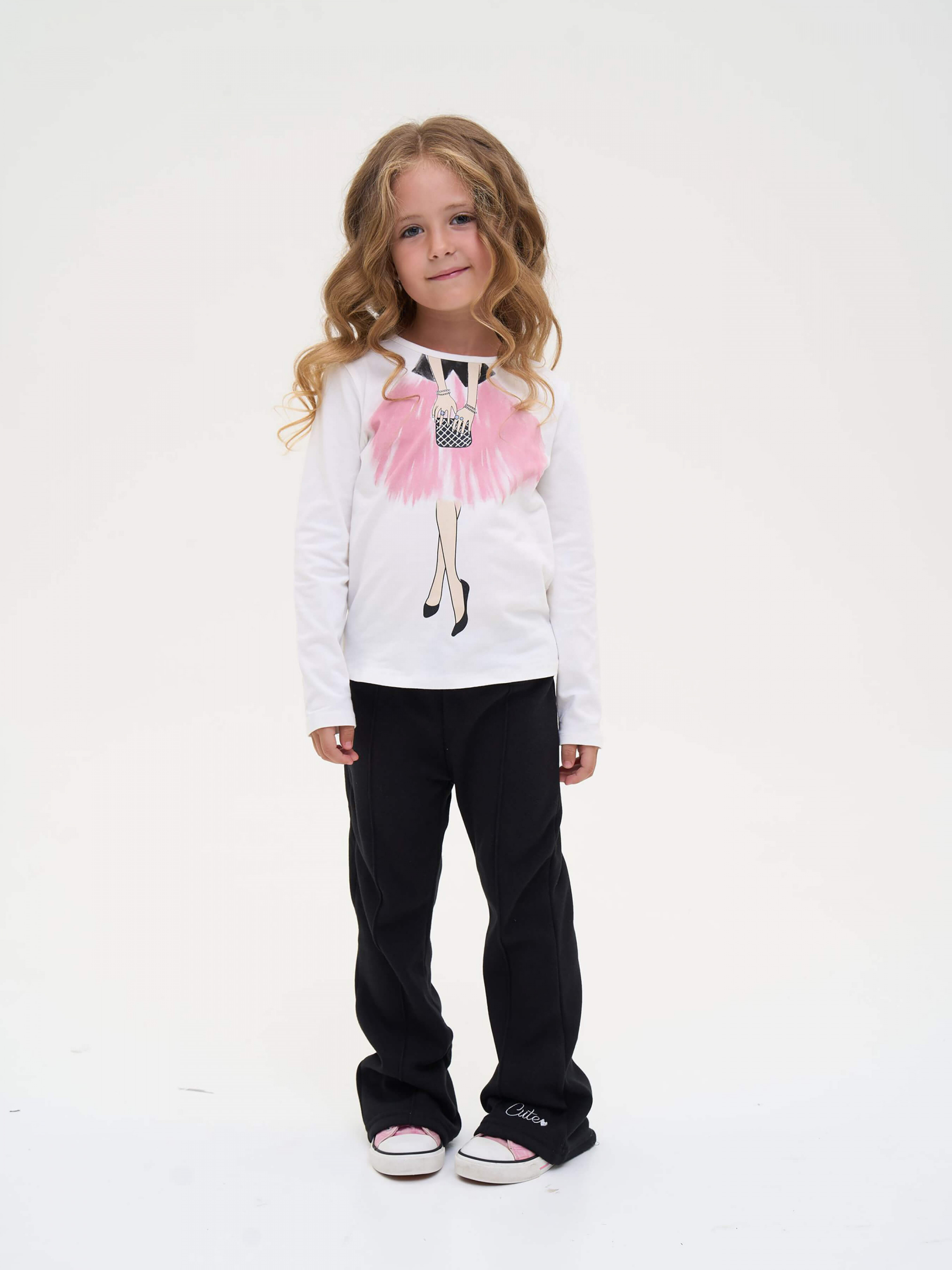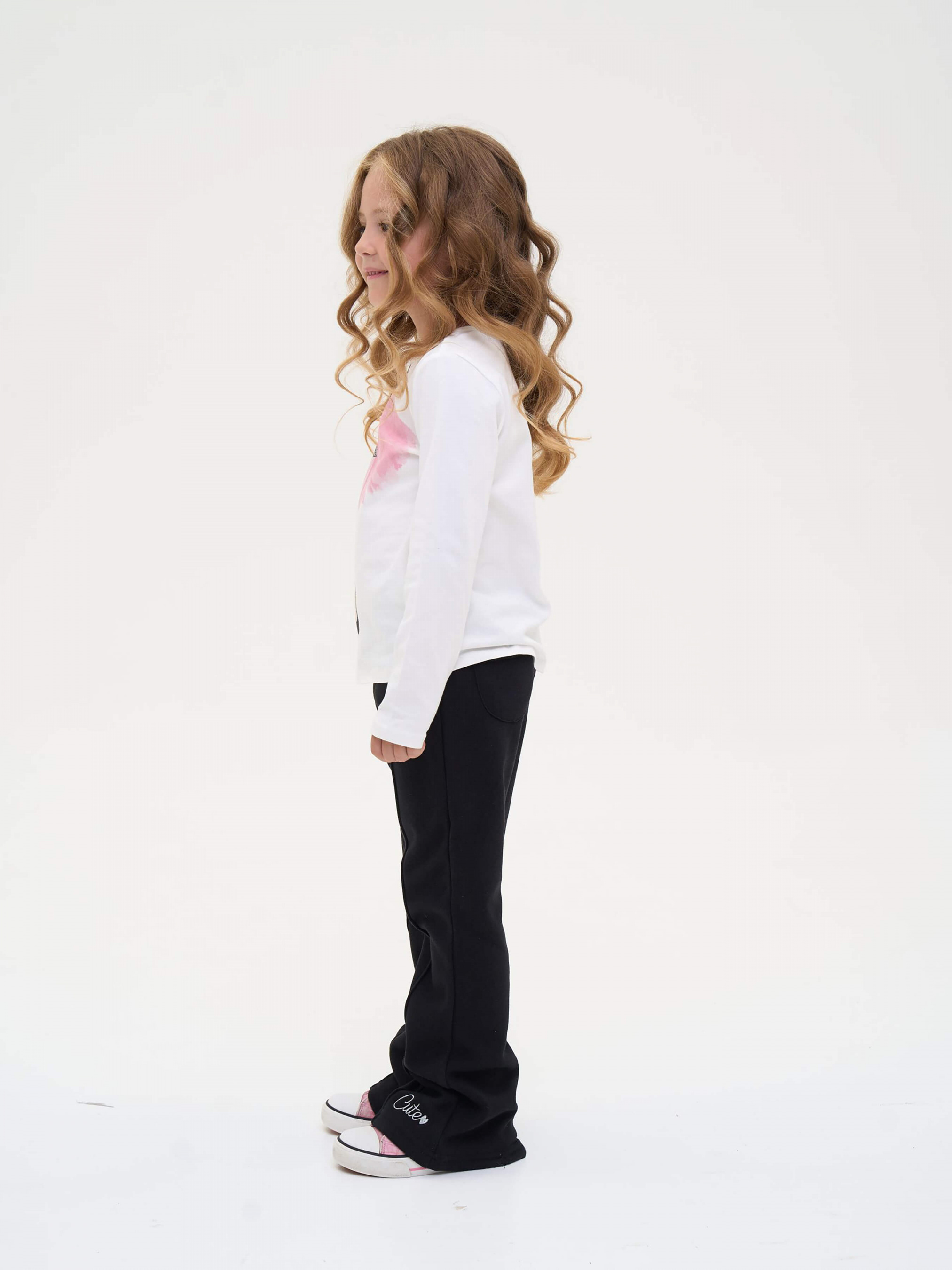 Детали модели: брюки черного цвета. Фасон - клеш. Пояс на резинке. Средняя высота по линии талии. Спереди по длине декоративная строчка. Сзади два накладных кармана. Внизу украшены белым лаконичным принтом.