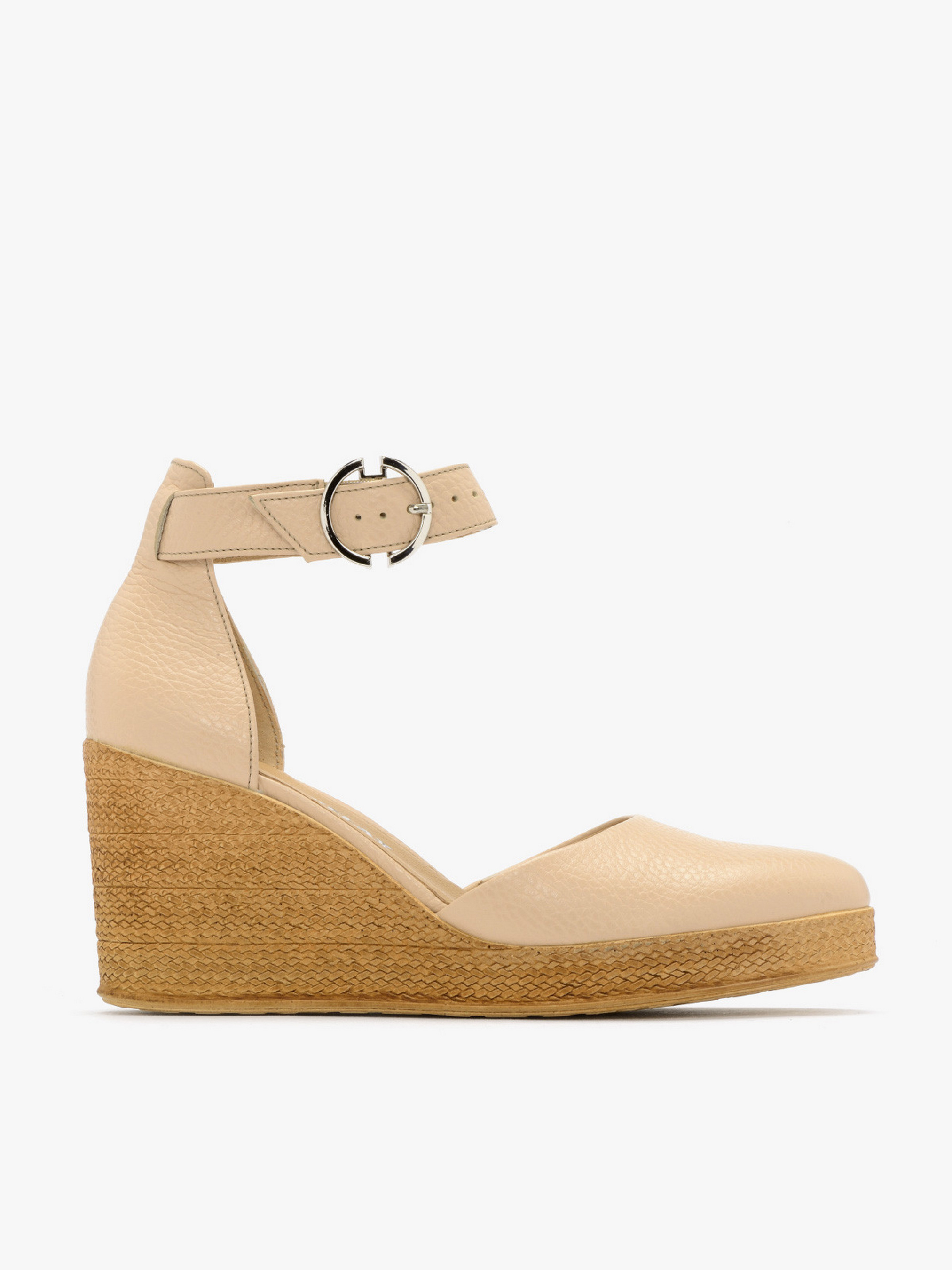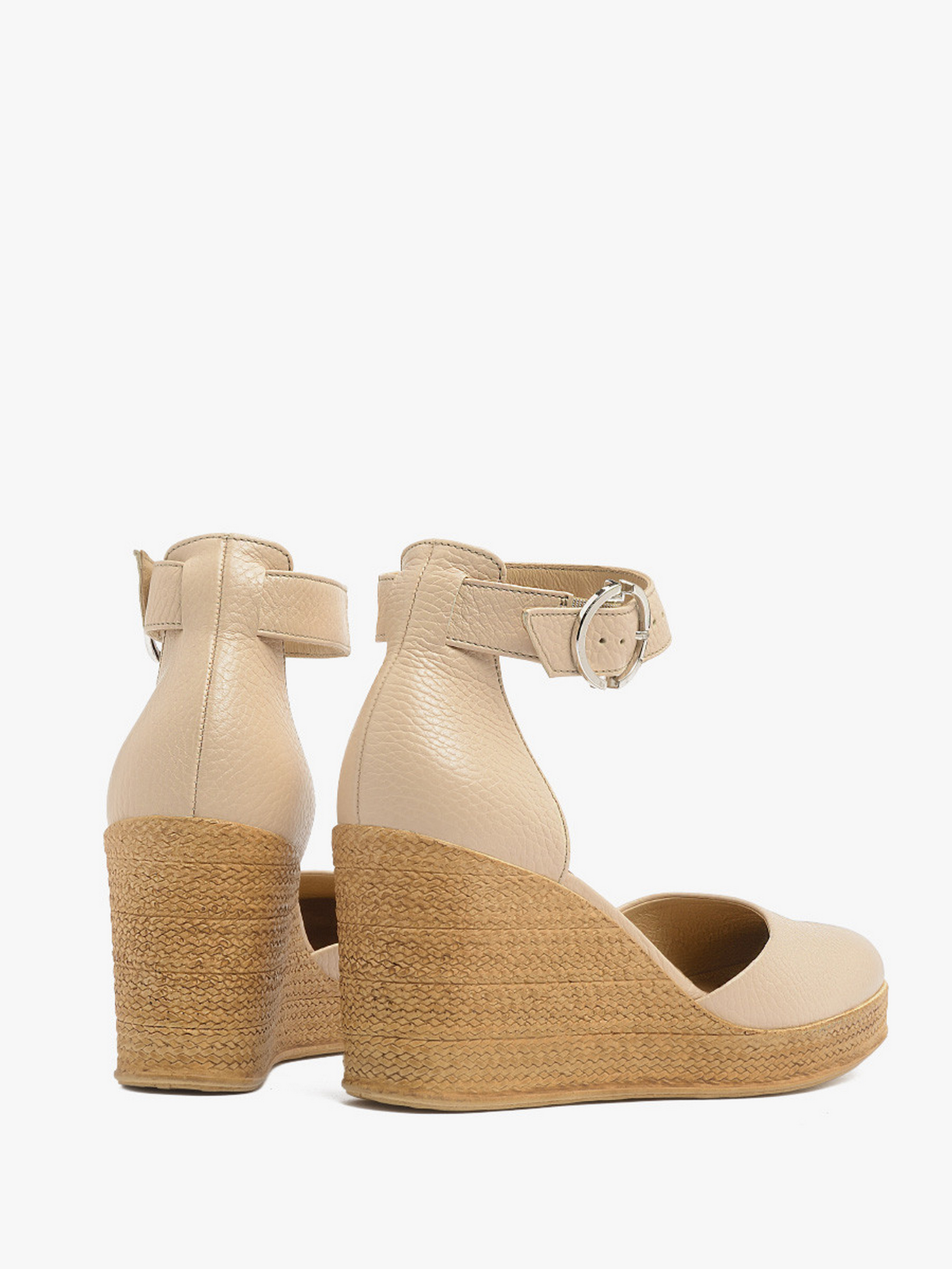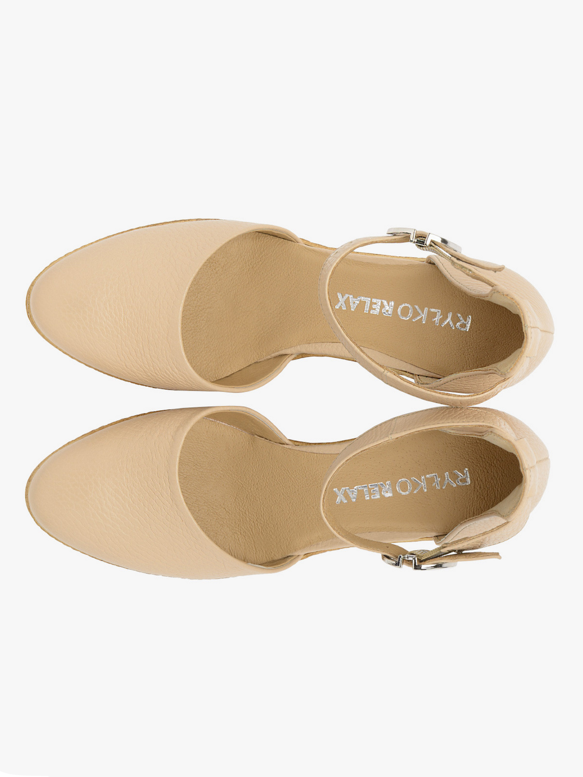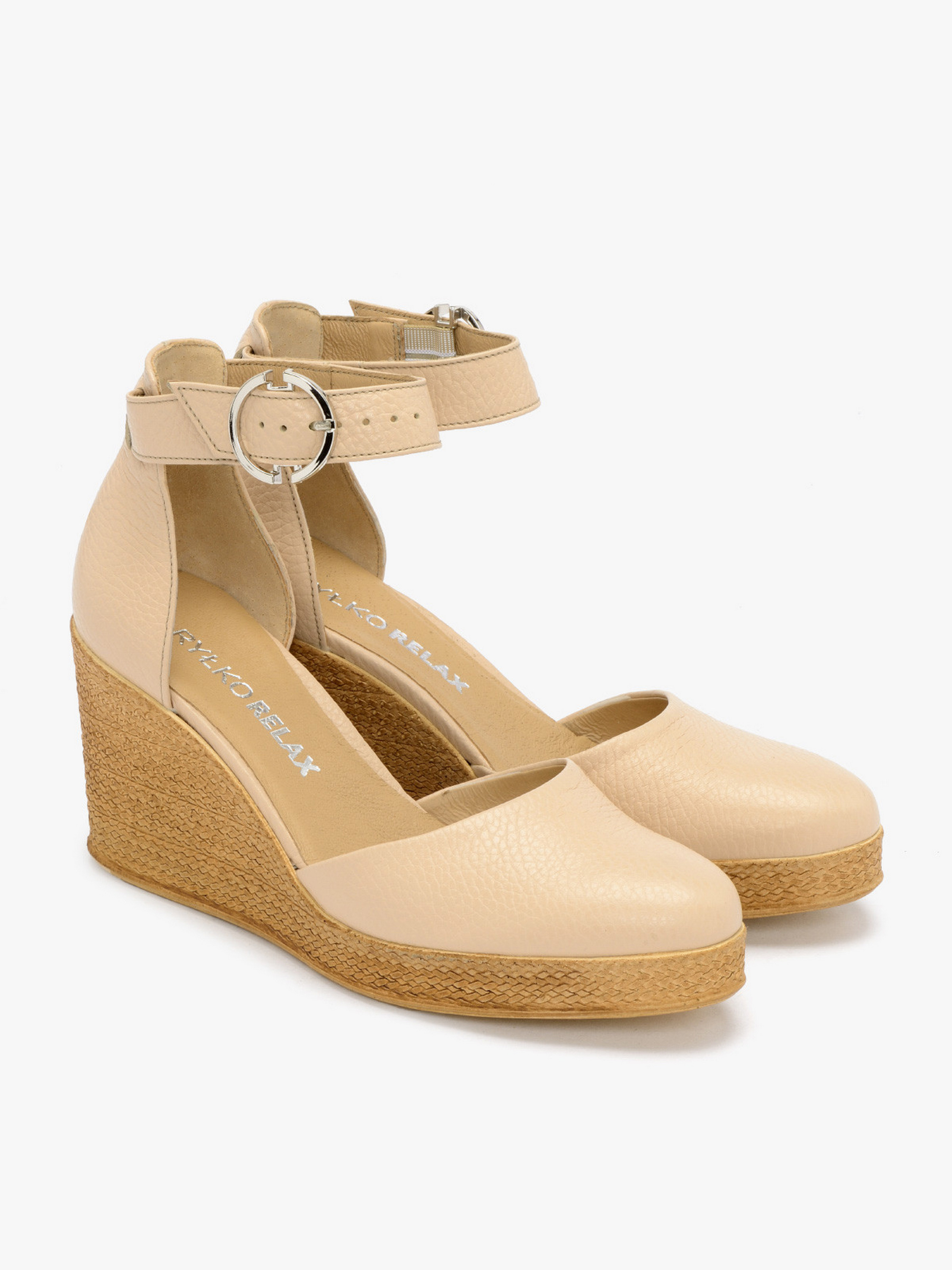 Босоножки на танкетке RYLKO бежевого цвета из серии RELAX с закрытой пяткой и носовой частью, изготовлены из зернистой кожи. Танкетка с тиснением, имитирующая джут - высотой 10 см. Подходят на стандартную (среднюю) полноту стопы. У этой модели обуви, под подкладкой, находится амортизирующая пена с активированным углем. Это придает ему высокие антибактериальные и противогрибковые свойства. Пена перфорирована, благодаря чему обеспечивает циркуляцию воздуха и впитывает лишнюю влагу. Пена мягкая и принимает форму стопы. Эти свойства значительно повышают комфорт использования обуви. Состав модели - Верх: натуральная зернистая кожа/Подкладка: натуральная кожа/Стелька: натуральная кожа/Подошва: термополиуретан (ТПУ) /Застежка: пряжка. Размерная сетка RYLKO EU: 35-23,3 см. 36-24 см. 36,5-24,3 см. 37-24,7 см. 37,5-25 см. 38-25,3 см. 38,5-25,7 см. 39-26 см. 39,5-26,3 см. 40-26,7 см. 40,5-27 см. 41-27,3 см. 42-28 см.