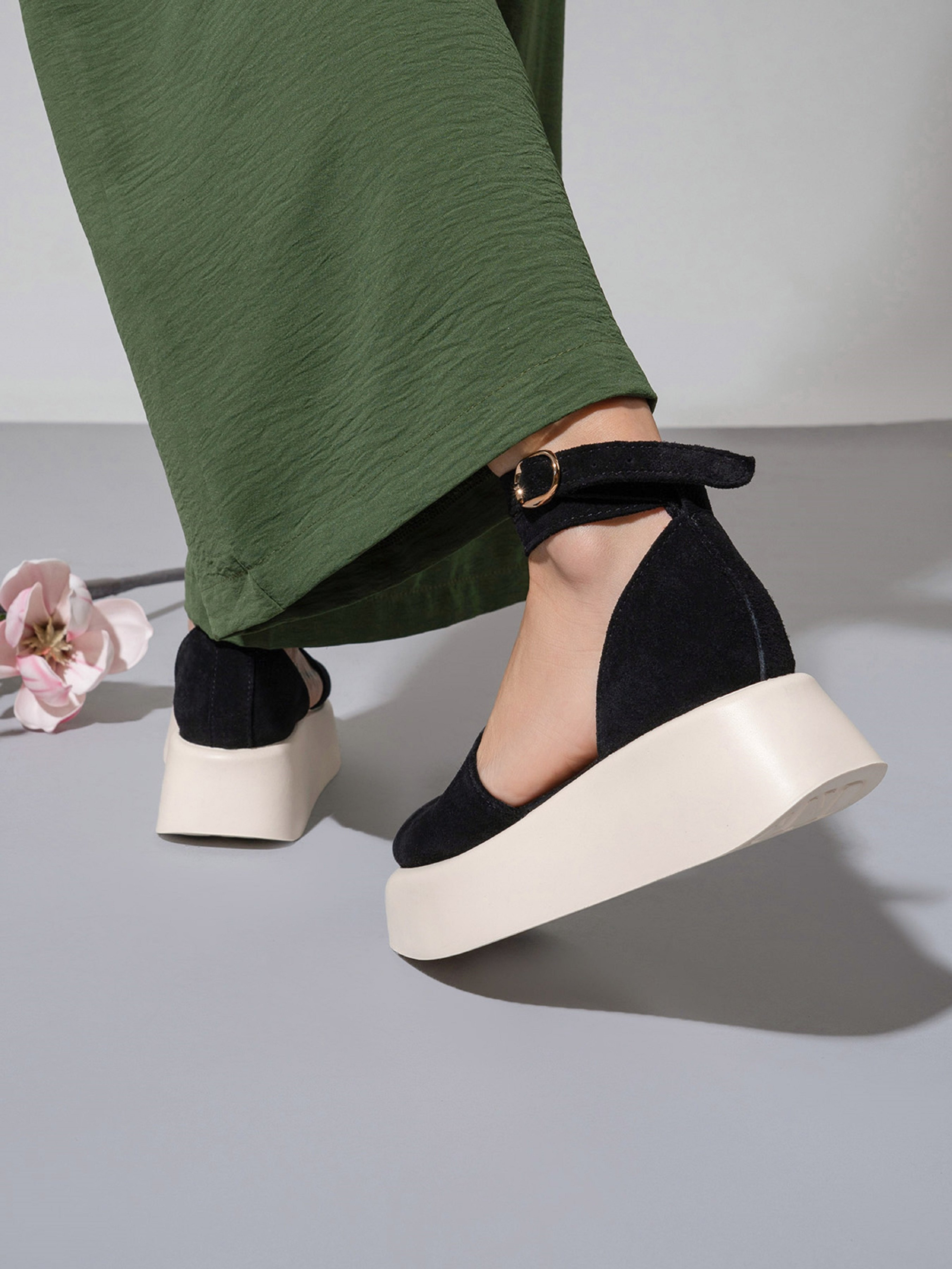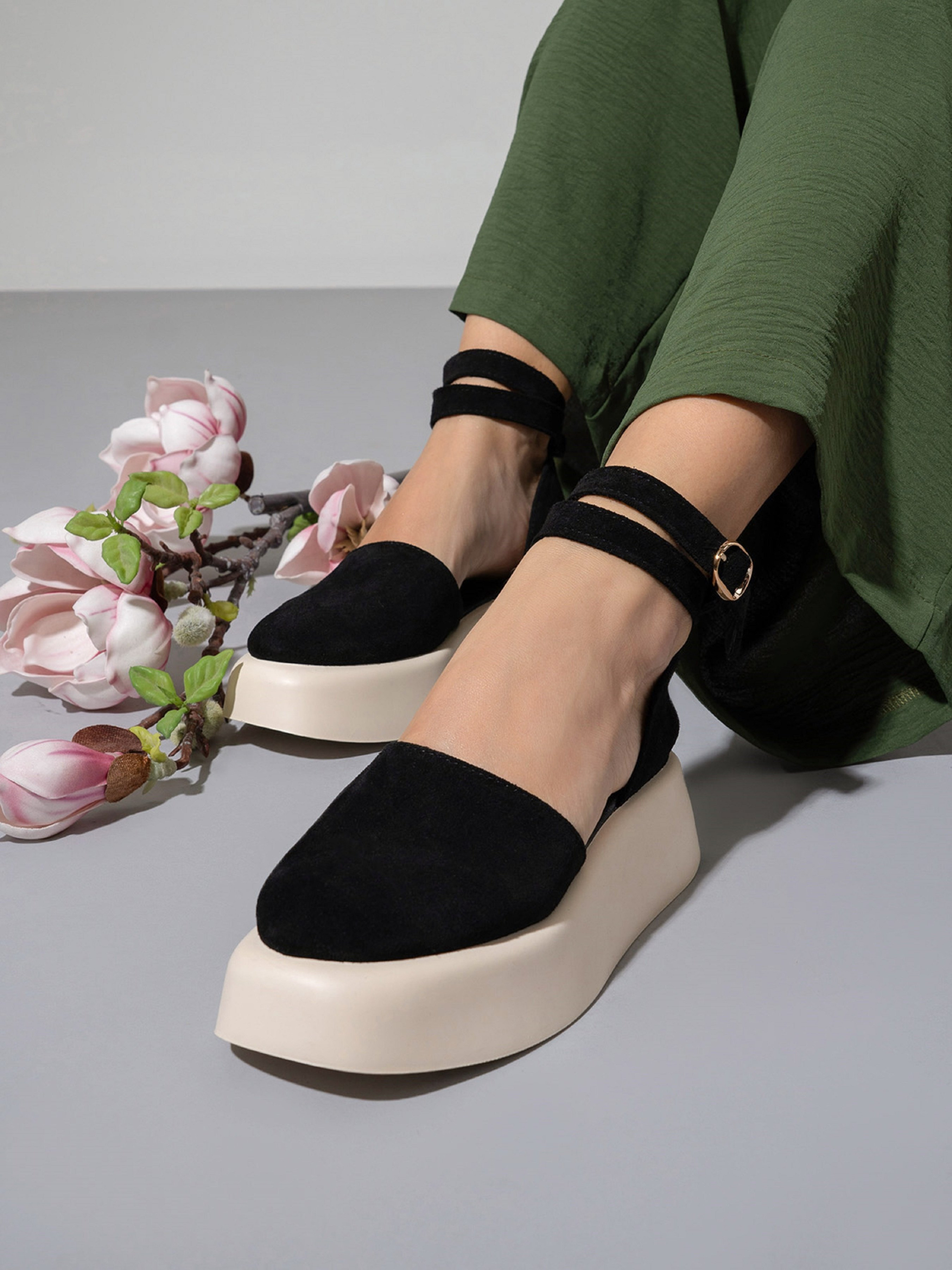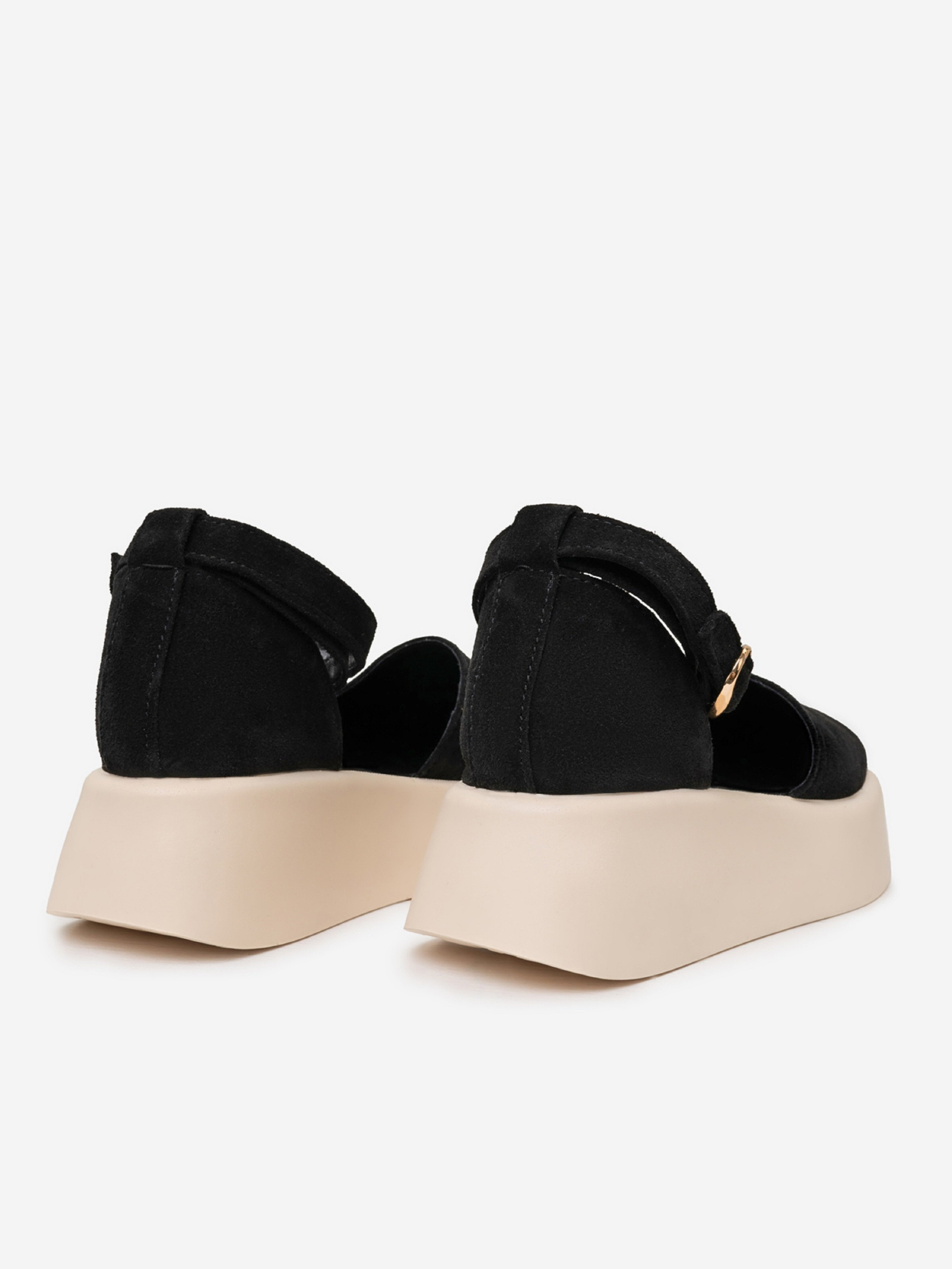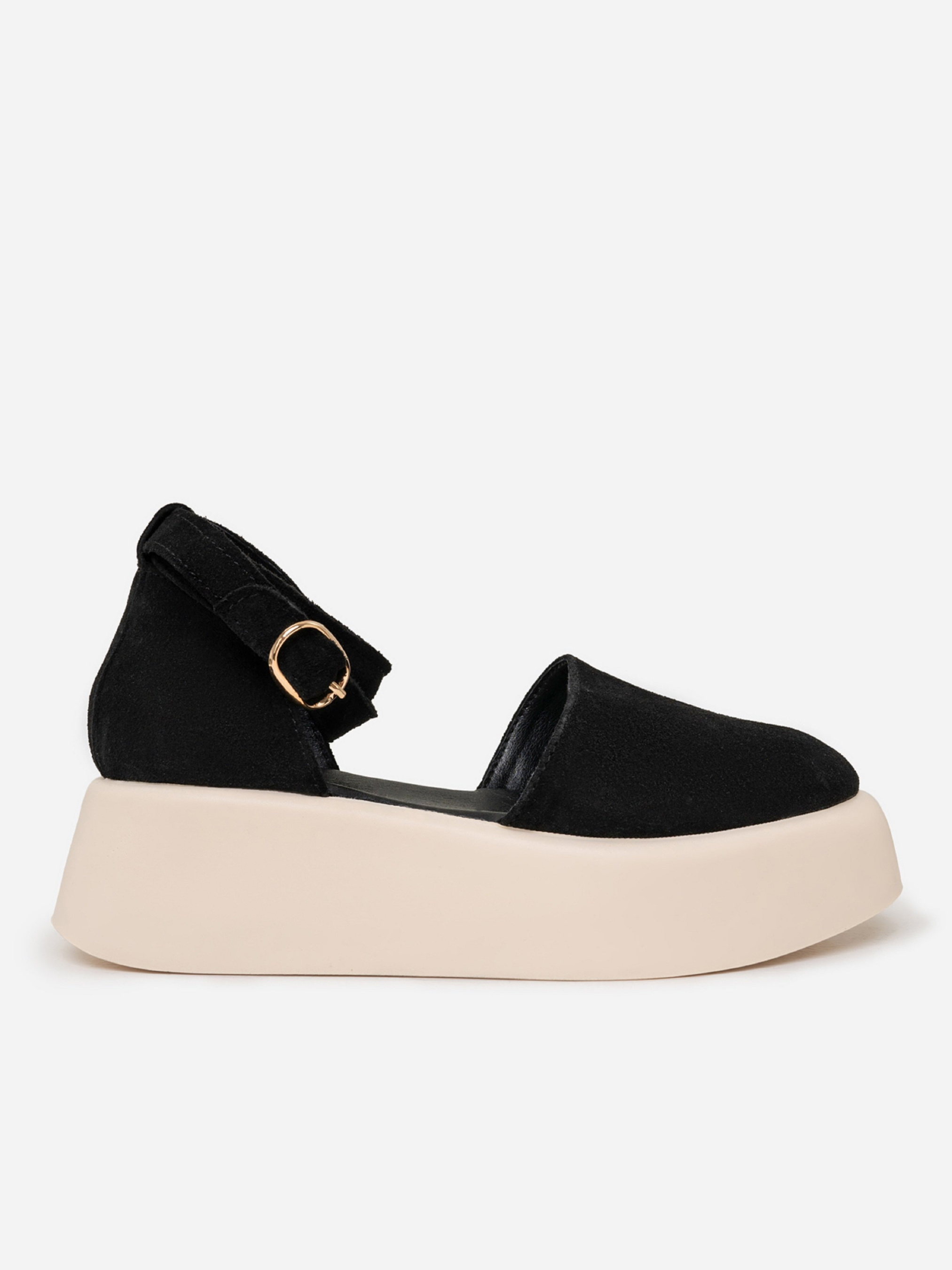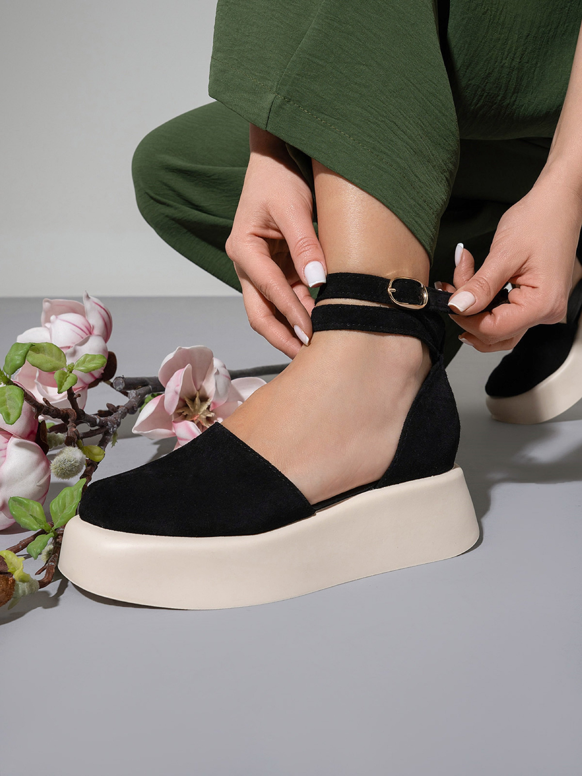 Черно-бежевые закрытые босоножки с высокой объемной подошвой. Модель выполнена из натуральной замши с ремешком у щиколотки и кожаным подкладом. Материал верха: натуральная замша. Подклад: натуральная кожа. Подошва: EVA (Эва). Высота подошвы: 5 см и 3,5 см. Замеры : 36 (23), 37 (23,5), 38 (24), 39 (24,5), 40 (25), 41 (25,5).