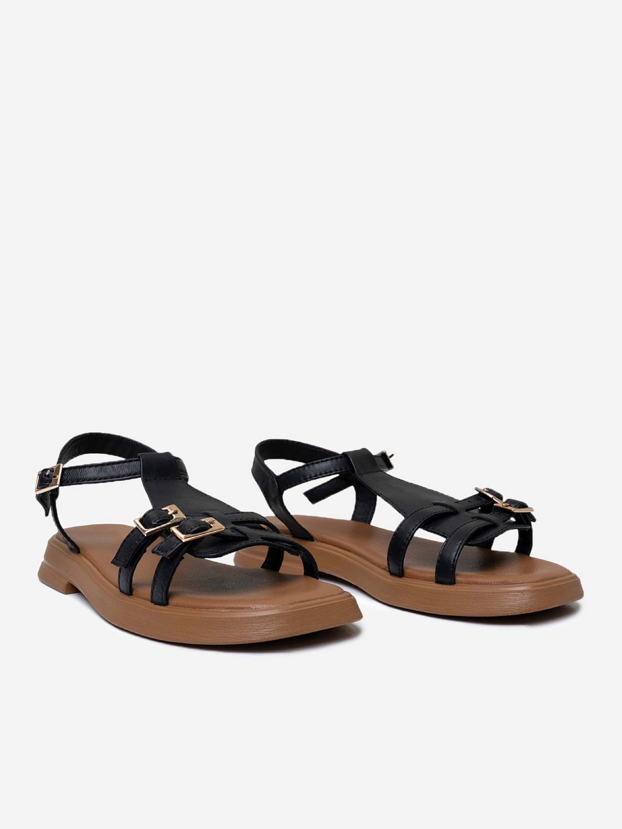 Черные кожаные сандалии на низкой подошве с тонкими ремешками и пряжками. Материал верха: натуральная кожа. Подклад: натуральная кожа. Подошва: TR (терморезина облегченная). Высота подошвы: 2,5 см и 1,5 см. Ширина пучков: 8 см. Замеры: 36 (23,5), 37 (24), 38 (24,5), 39 (25), 40 (25,5), 41 (26)