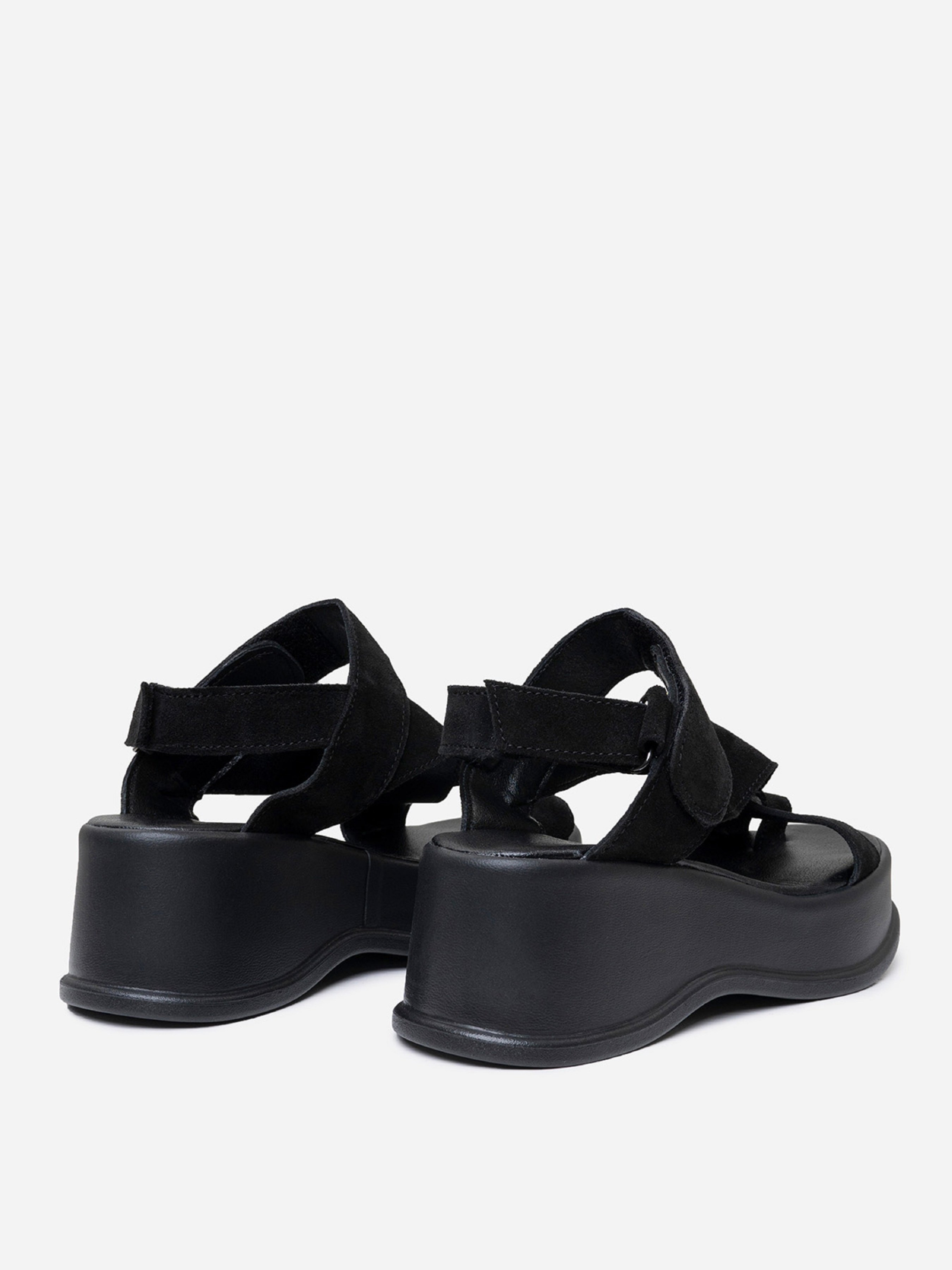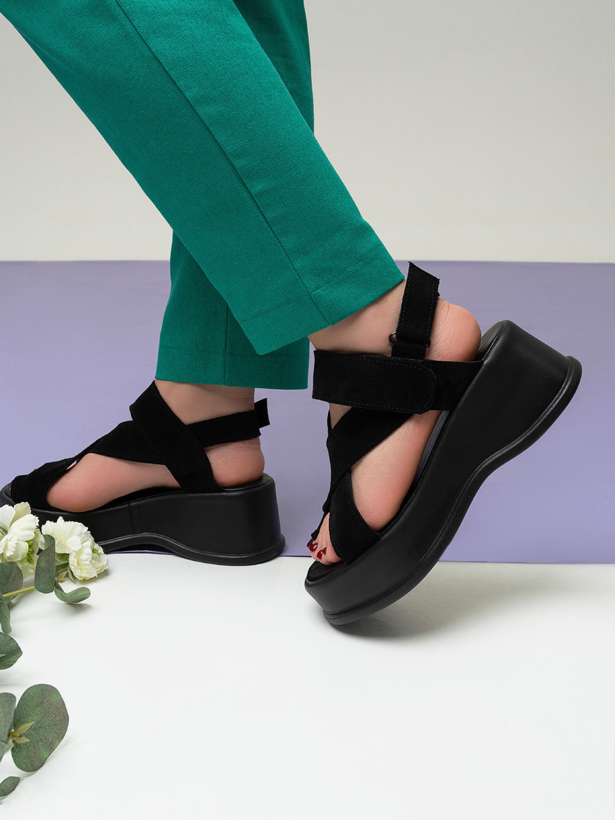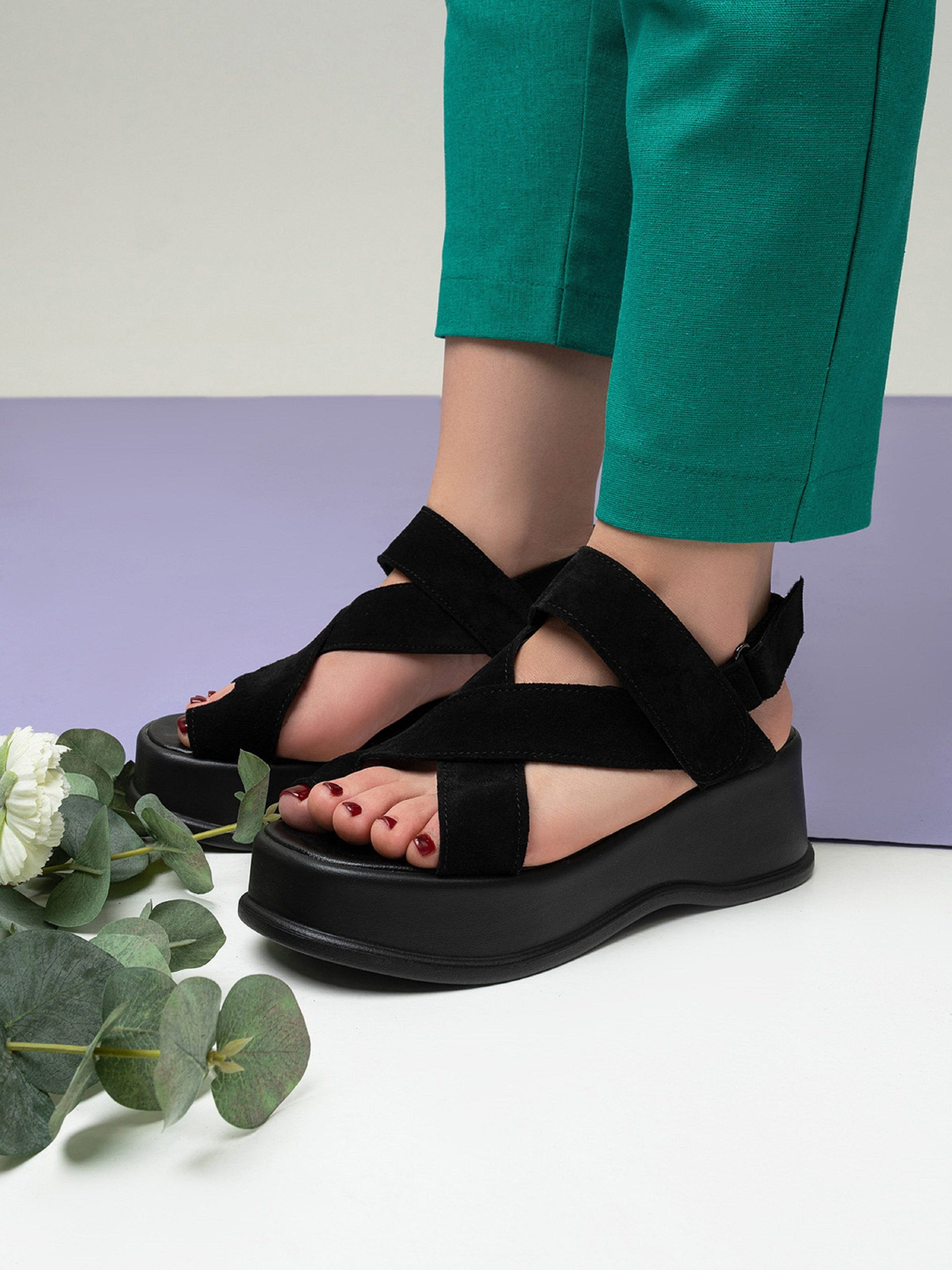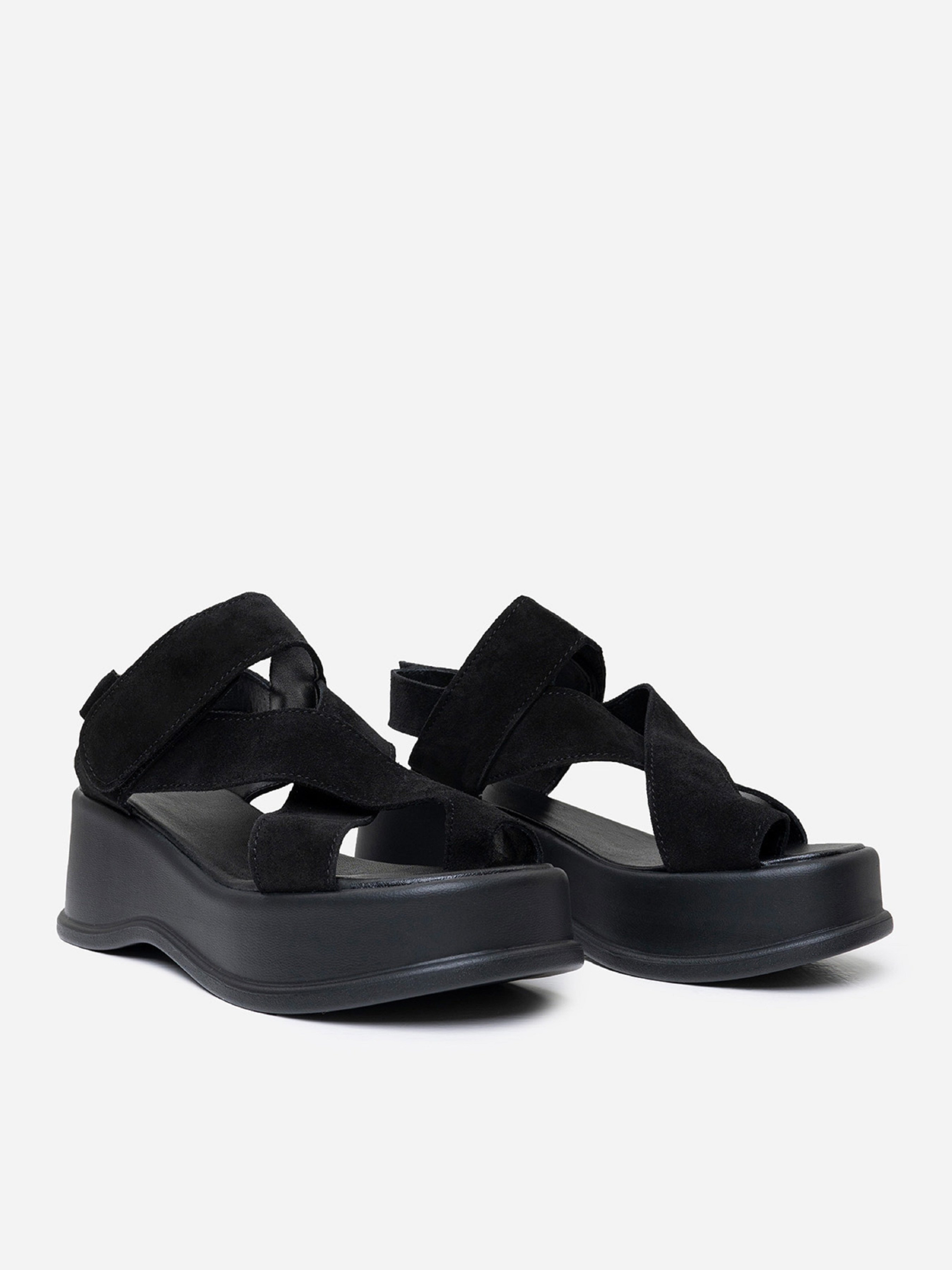 Черные босоножки на высокой облегченной подошве, выполненные из натуральной замши. Модель на липучках с оригинальным фиксатором больших пальцев. Материал верха: натуральная замша. Подклад: натуральная кожа. Подошва: TR (терморезина облегченная). Высота подошвы: 6 см и 4 см. Ширина пучков: 8 см. Замеры: 36 (23), 37 (23,5), 38 (24), 39 (24,5), 40 (25), 41 (25,5)