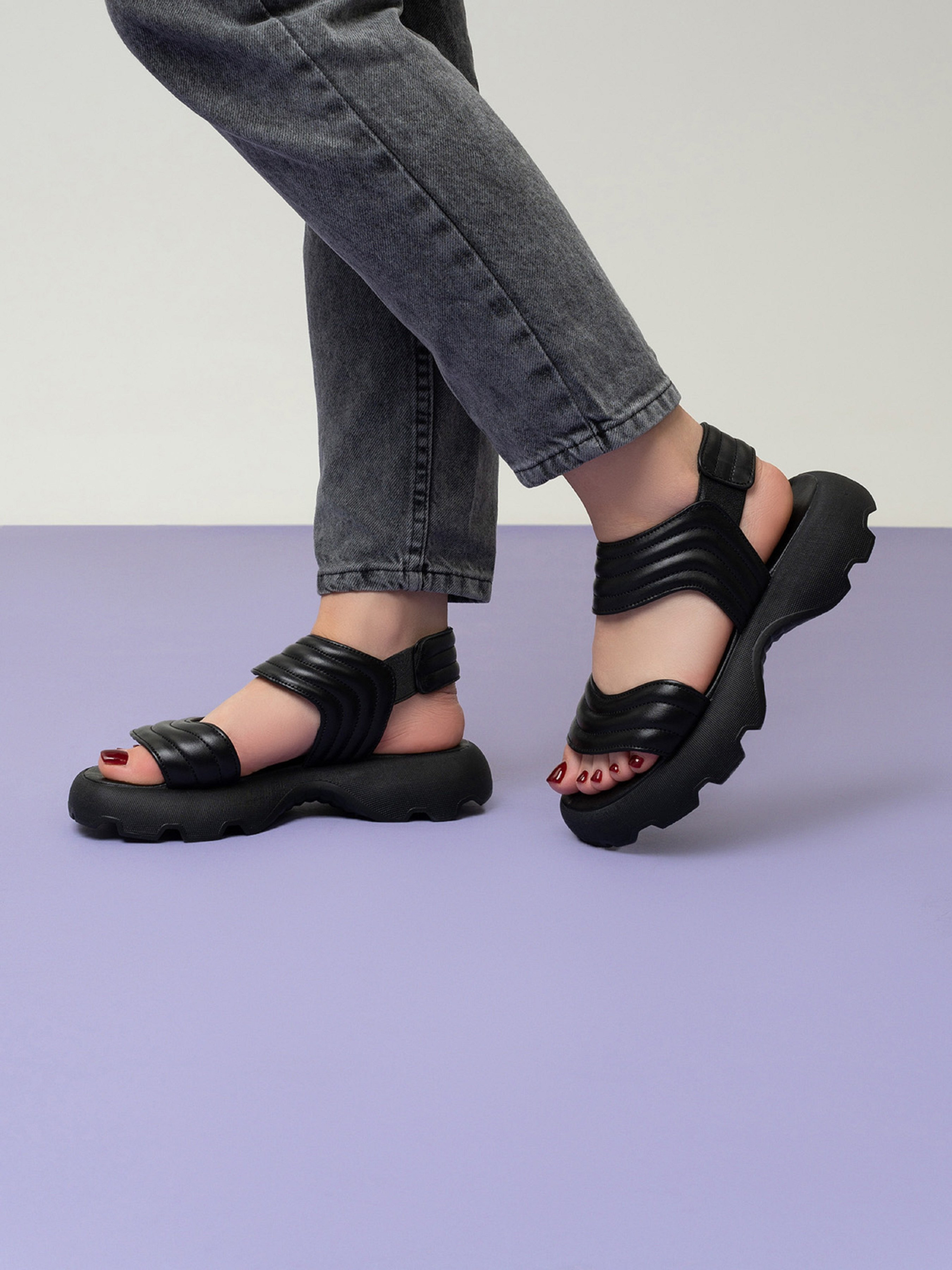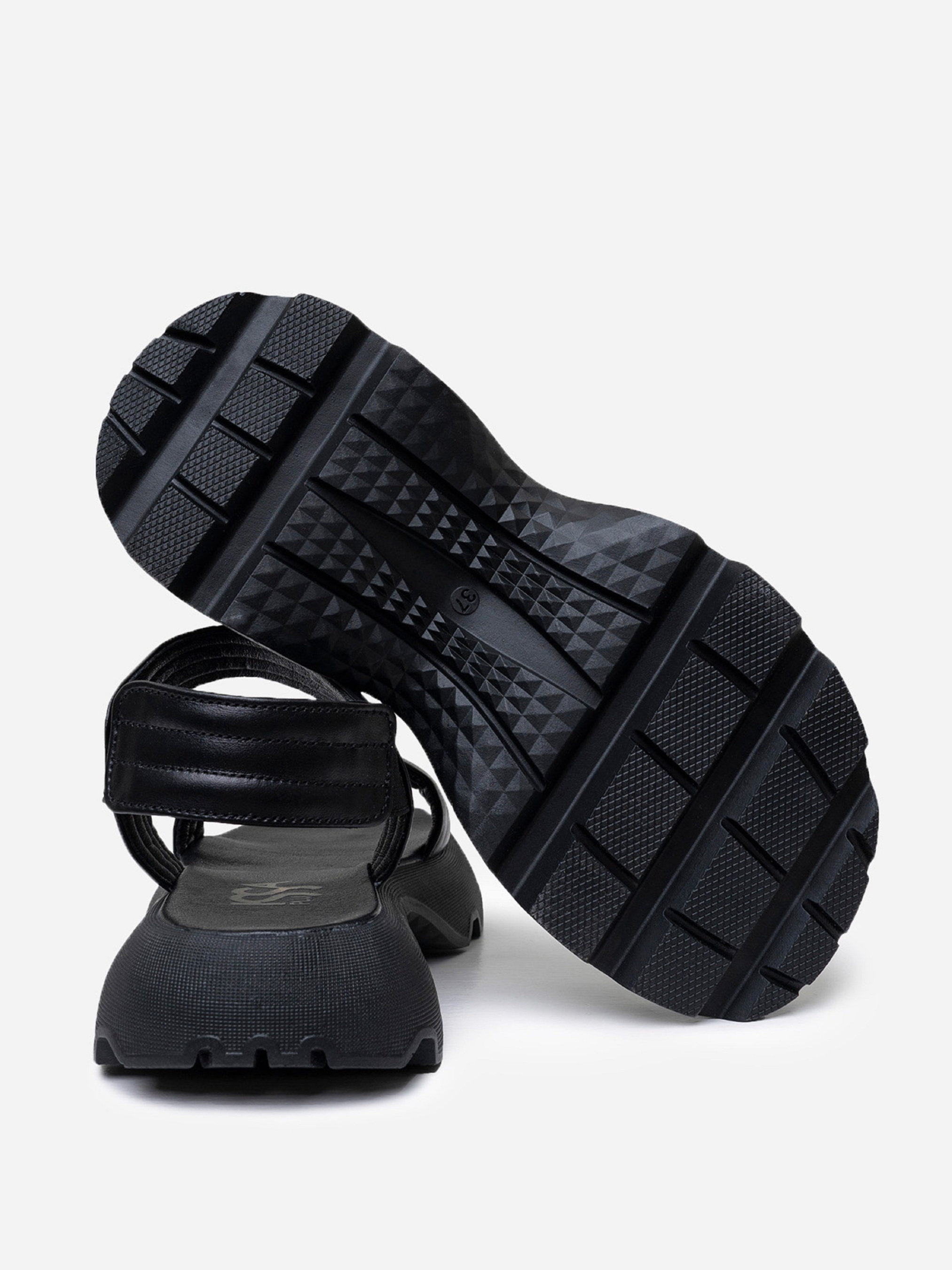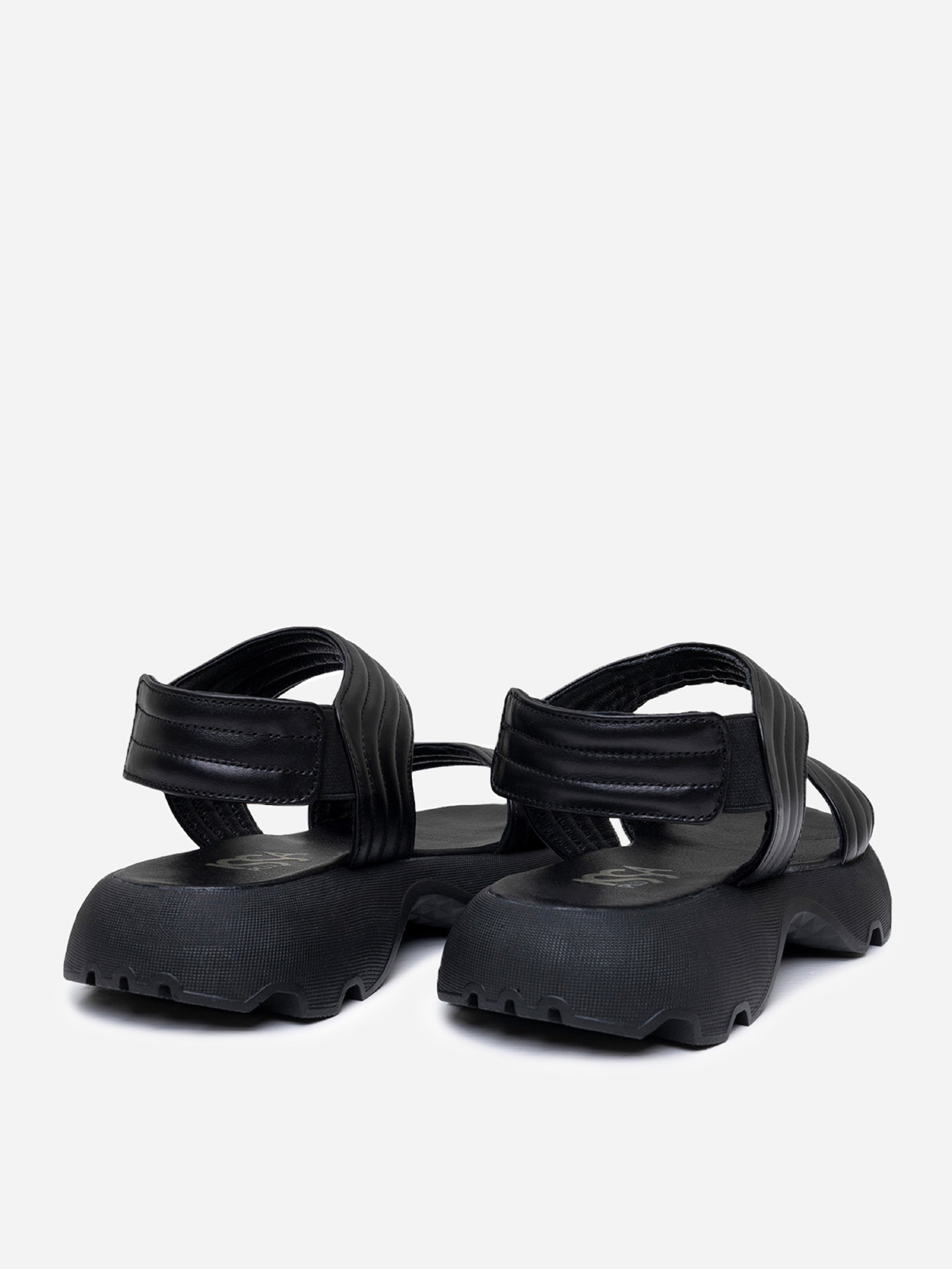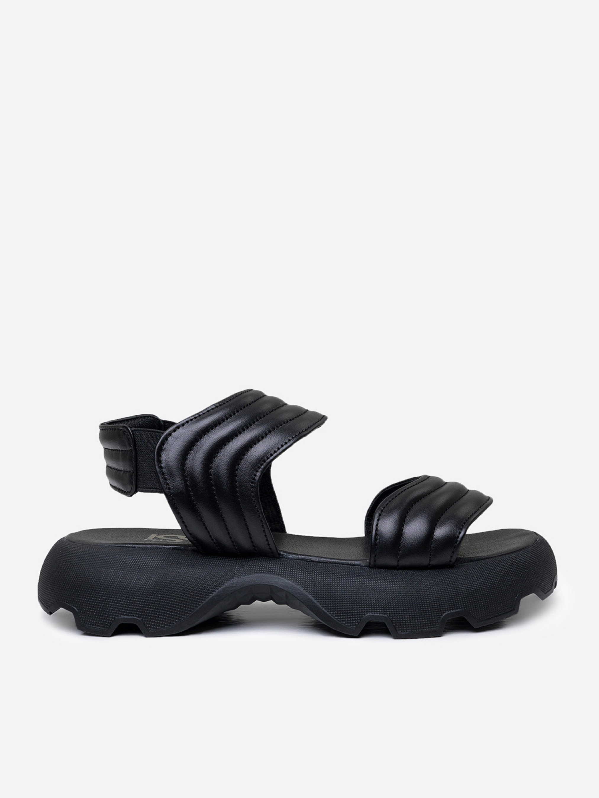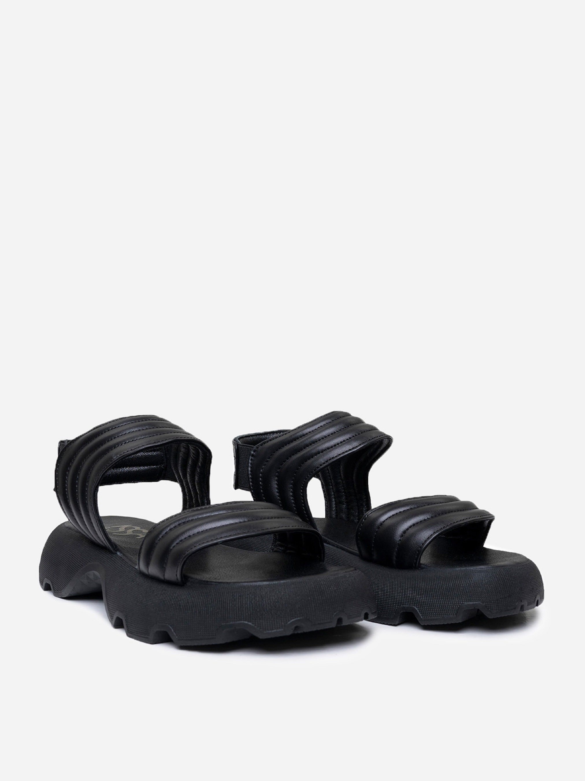Черные молодежные босоножки на высокой грубой подошве. Модель выполнена из натуральной стеганой кожи с удобными резинками. Материал верха: натуральная кожа. Подклад: натуральная кожа. Подошва: EVA (Эва). Высота подошвы: 4,5 см и 3 см. Ширина пучков: 8 см. Замеры: 36 (23), 37 (23,5), 38 (24), 39 (24,5), 40 (25), 41 (25,5)