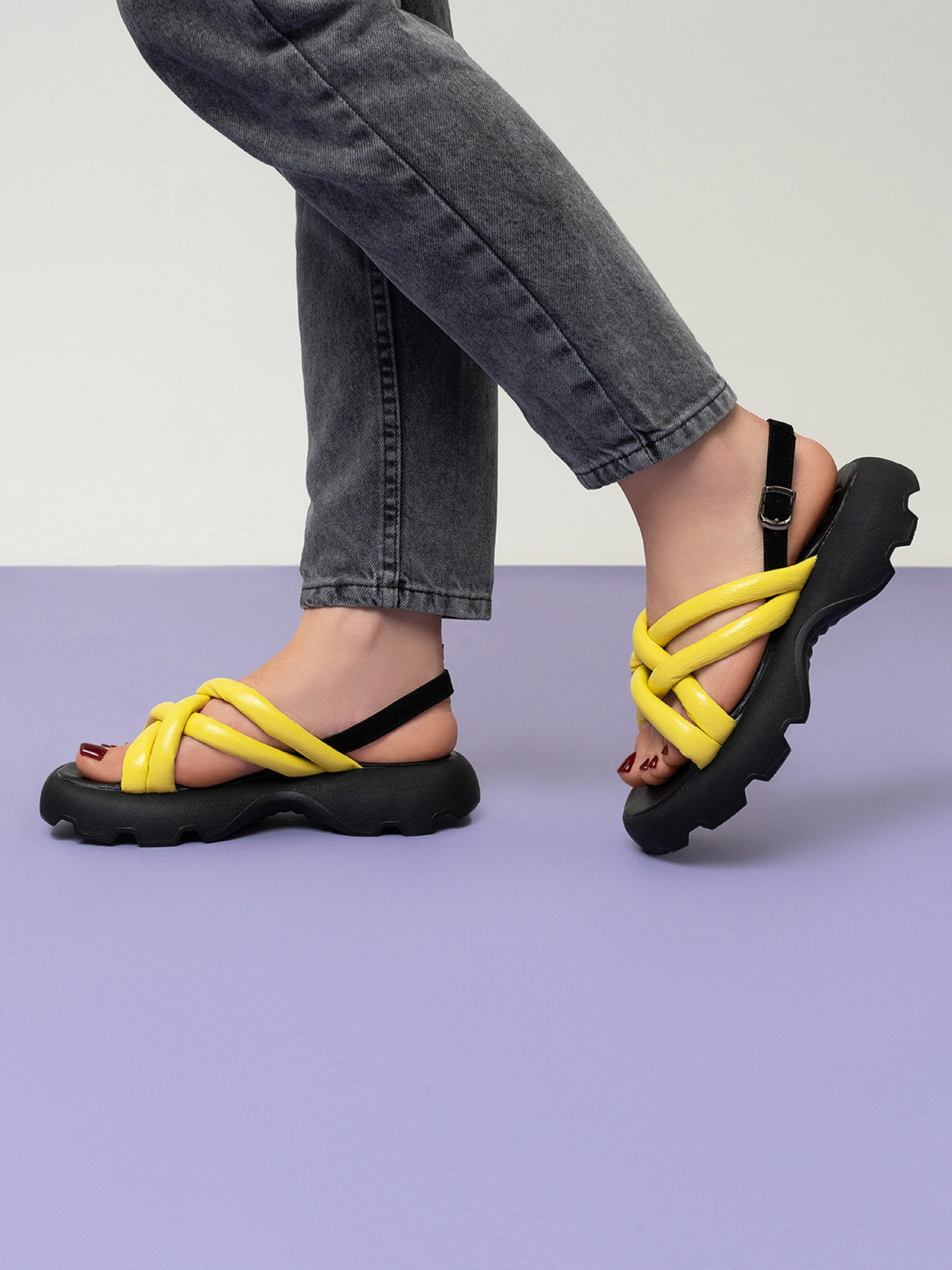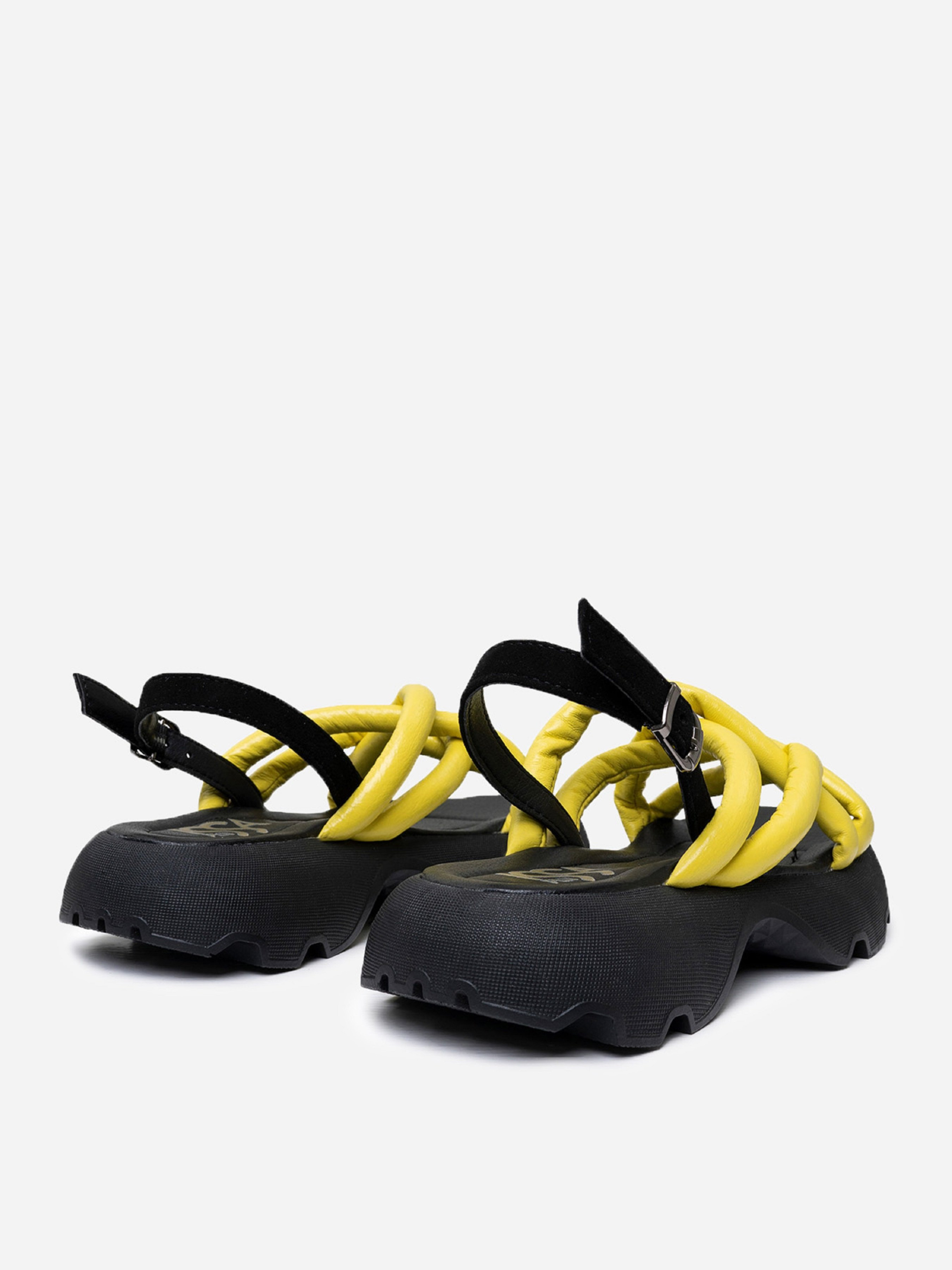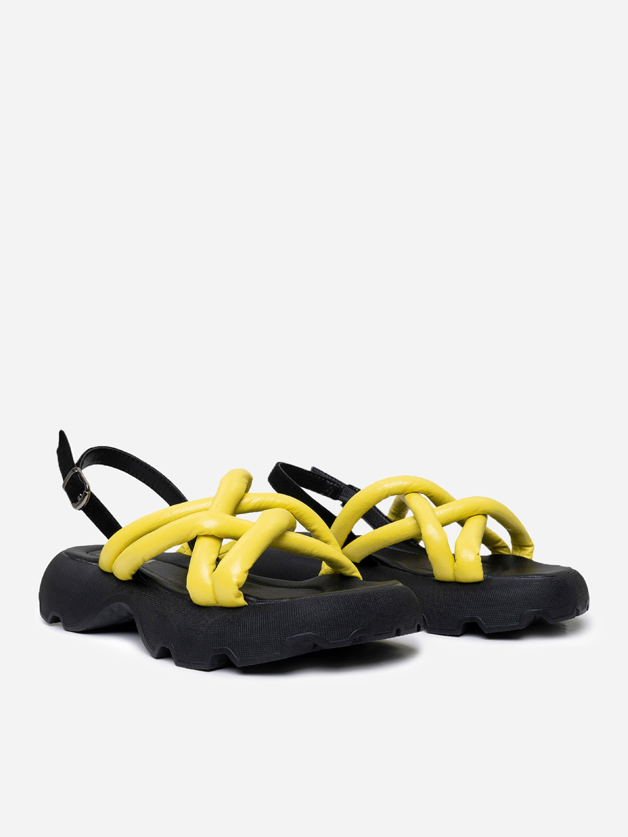 Открытые босоножки желто-черного цвета из натуральной кожи с переплетенными дутыми ремешками. Модель с фактурной высокой подошвой и застежкой-пряжкой на щиколотке. Материал верха: натуральная кожа. Подклад: натуральная кожа. Подошва: EVA (Эва). Высота подошвы: 4,5 см и 3 см. Ширина пучков: 8,5 см. Замеры: 36 (23), 37 (23,5), 38 (24), 39 (24,5), 40 (25), 41 (25,5)