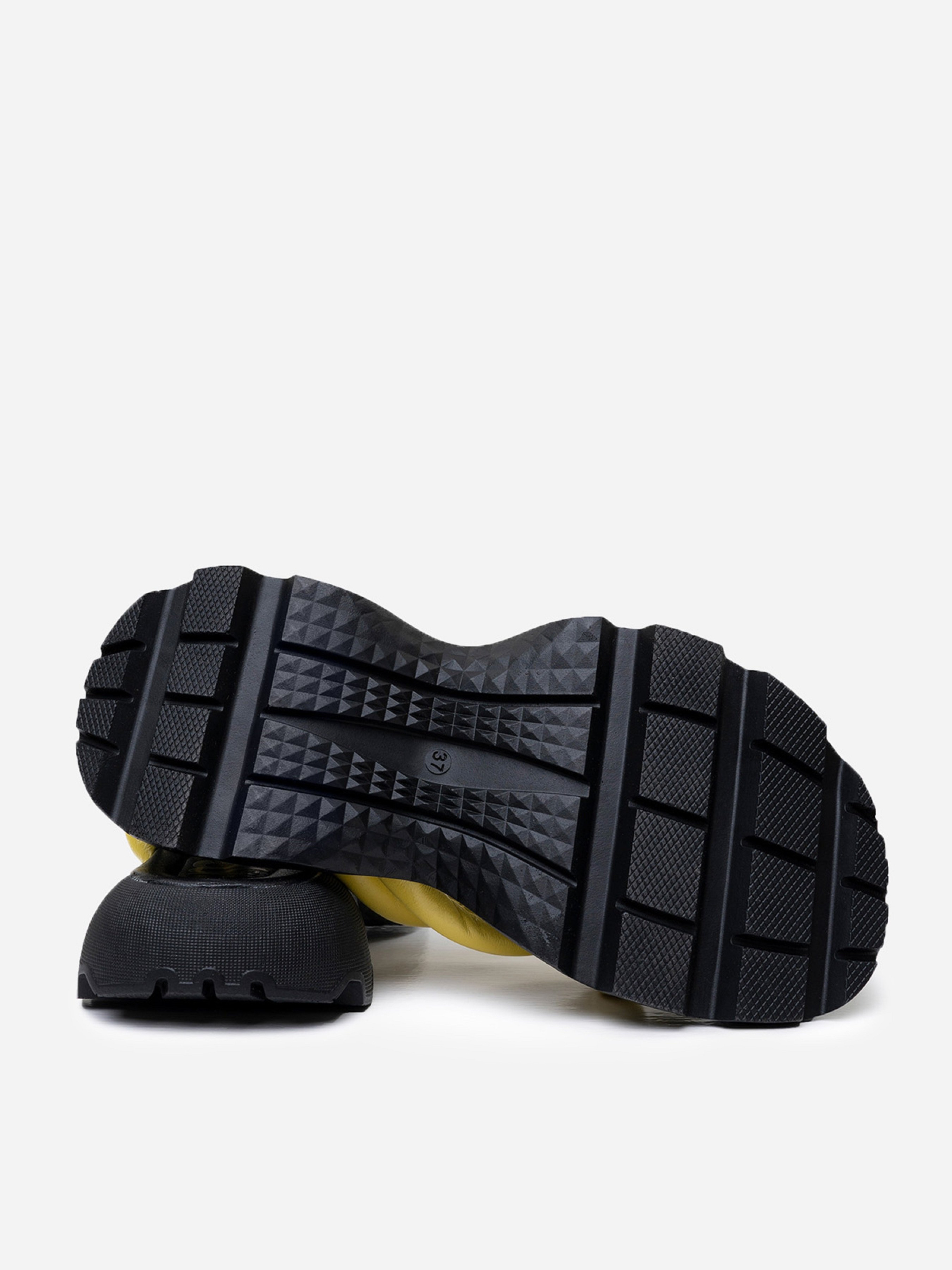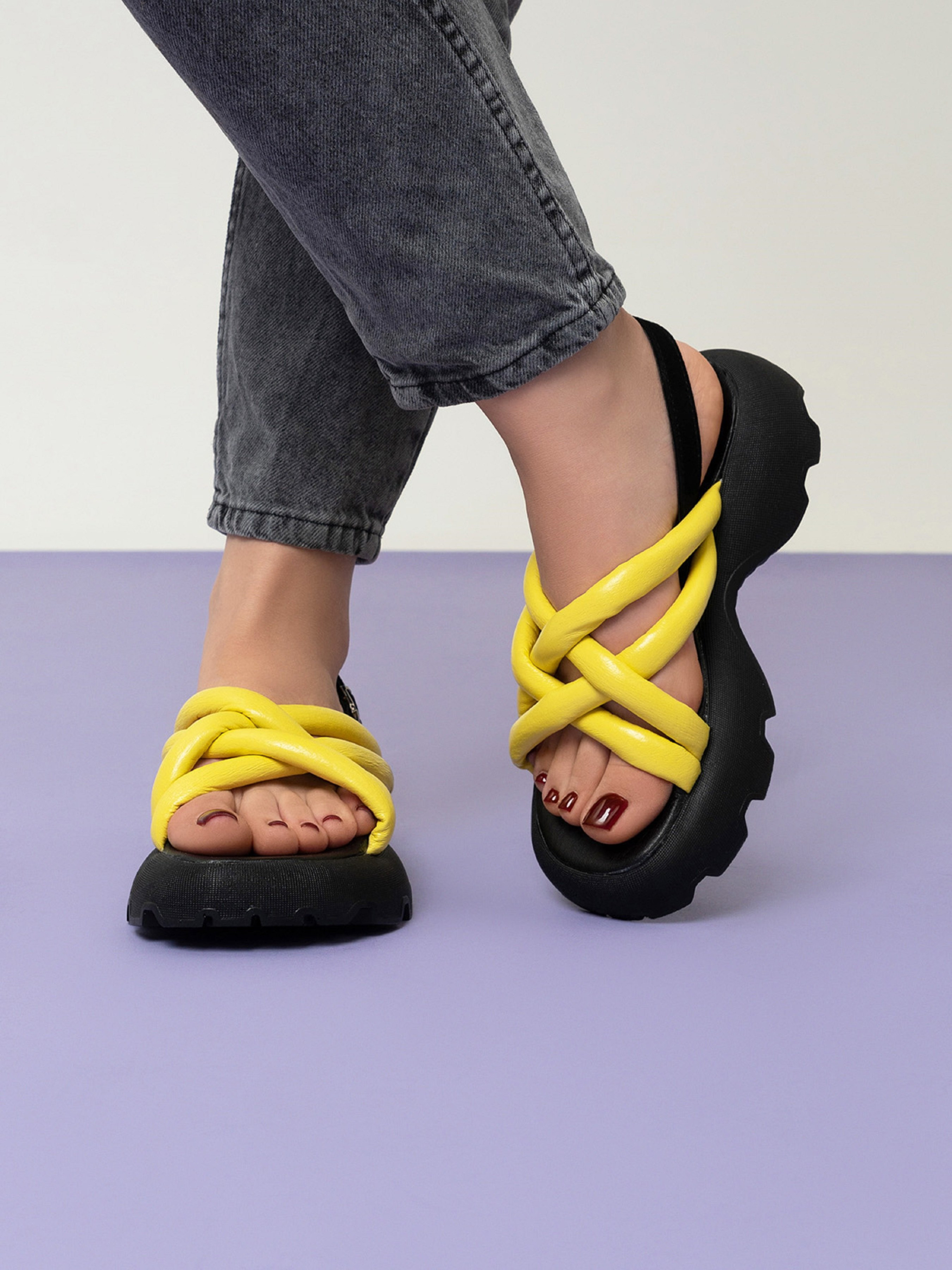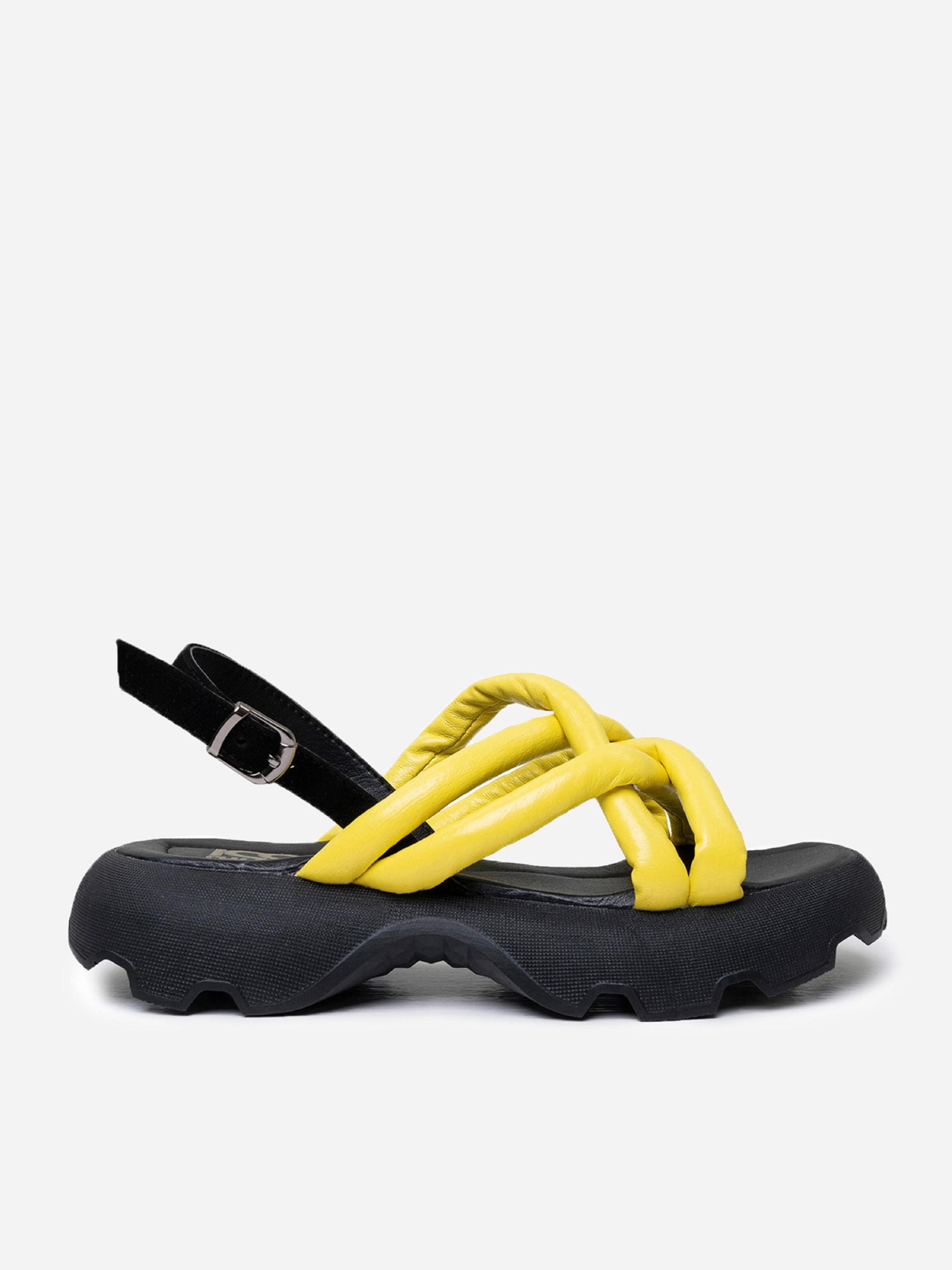 Открытые босоножки желто-черного цвета из натуральной кожи с переплетенными дутыми ремешками. Модель с фактурной высокой подошвой и застежкой-пряжкой на щиколотке. Материал верха: натуральная кожа. Подклад: натуральная кожа. Подошва: EVA (Эва). Высота подошвы: 4,5 см и 3 см. Ширина пучков: 8,5 см. Замеры: 36 (23), 37 (23,5), 38 (24), 39 (24,5), 40 (25), 41 (25,5)