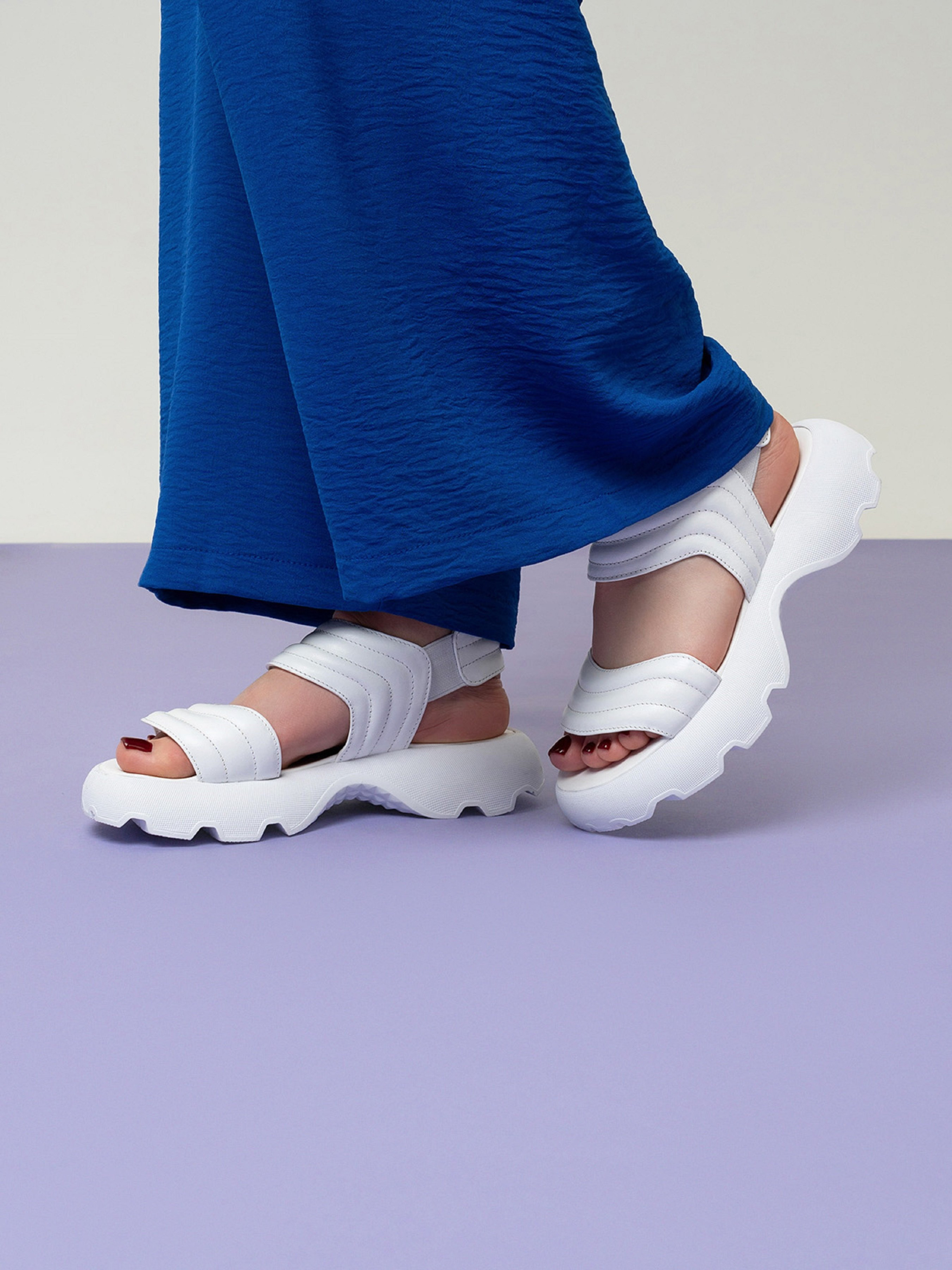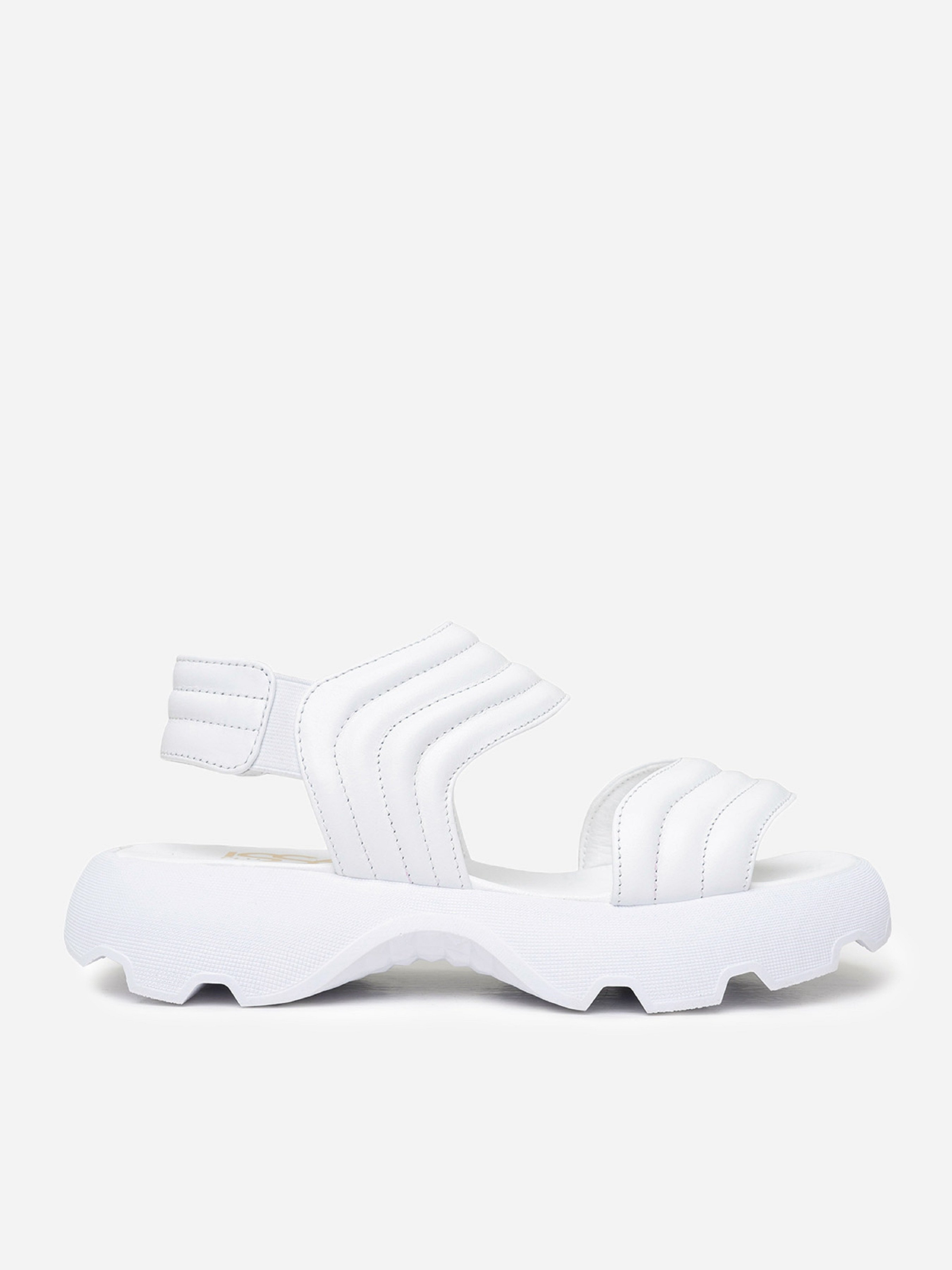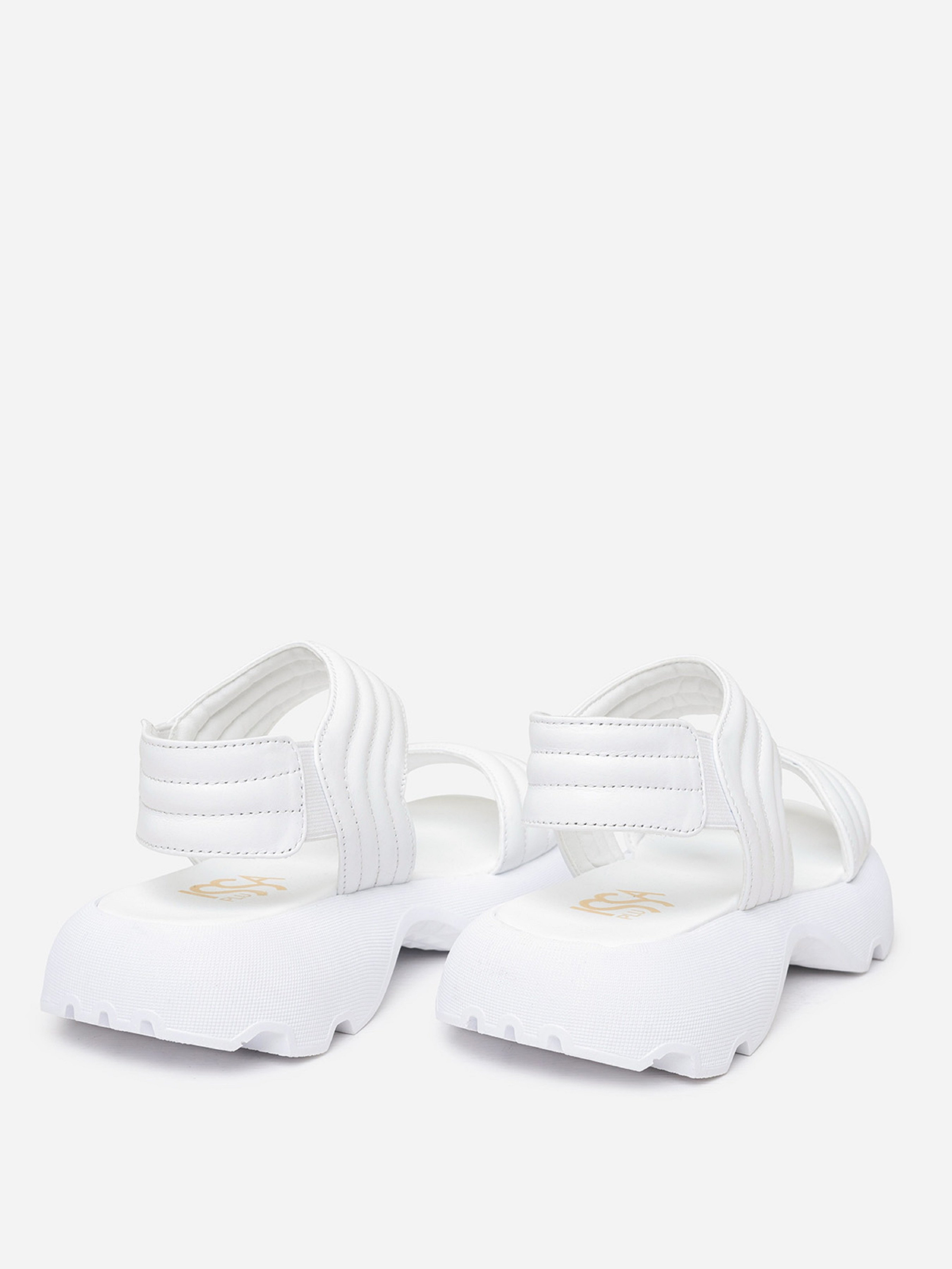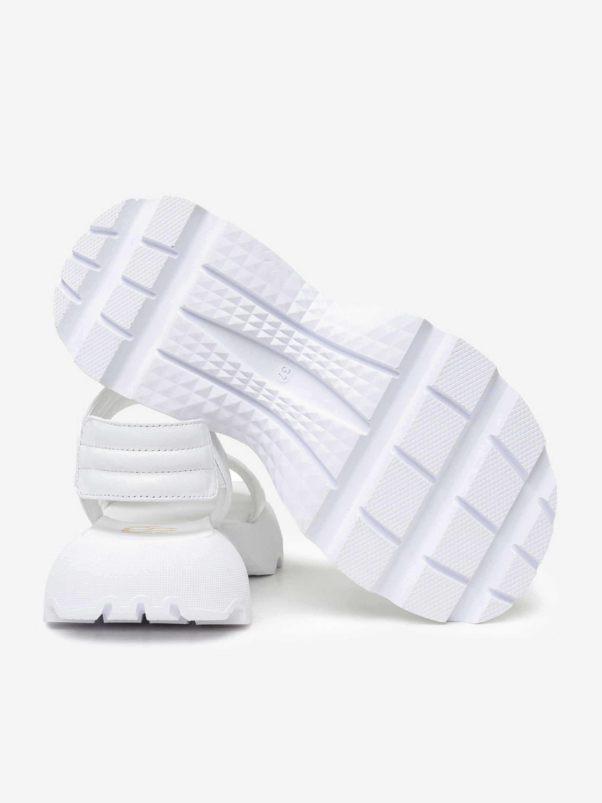 Белые молодежные босоножки на высокой грубой подошве. Модель выполнена из натуральной стеганой кожи с удобными резинками. Материал верха: натуральная кожа. Подклад: натуральная кожа. Подошва: EVA (Эва). Высота подошвы: 4,5 см и 3 см. Ширина пучков: 8 см. Замеры: 36 (23), 37 (23,5), 38 (24), 39 (24,5), 40 (25), 41 (25,5)