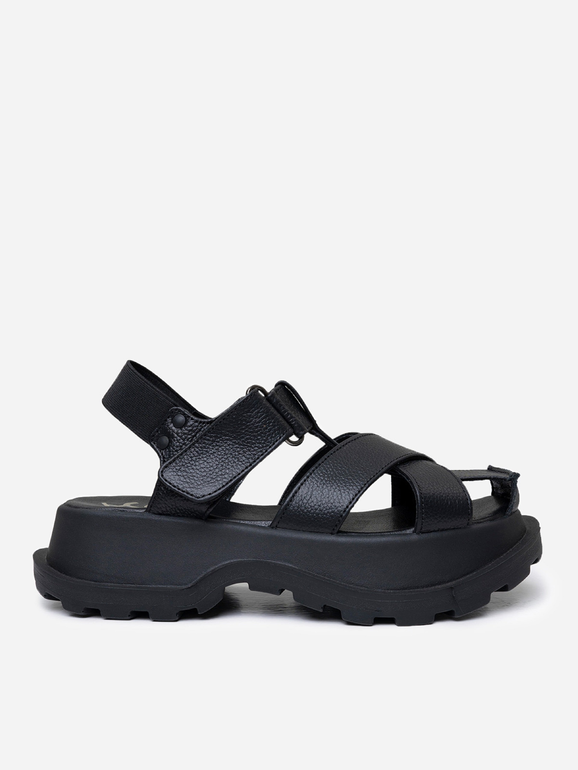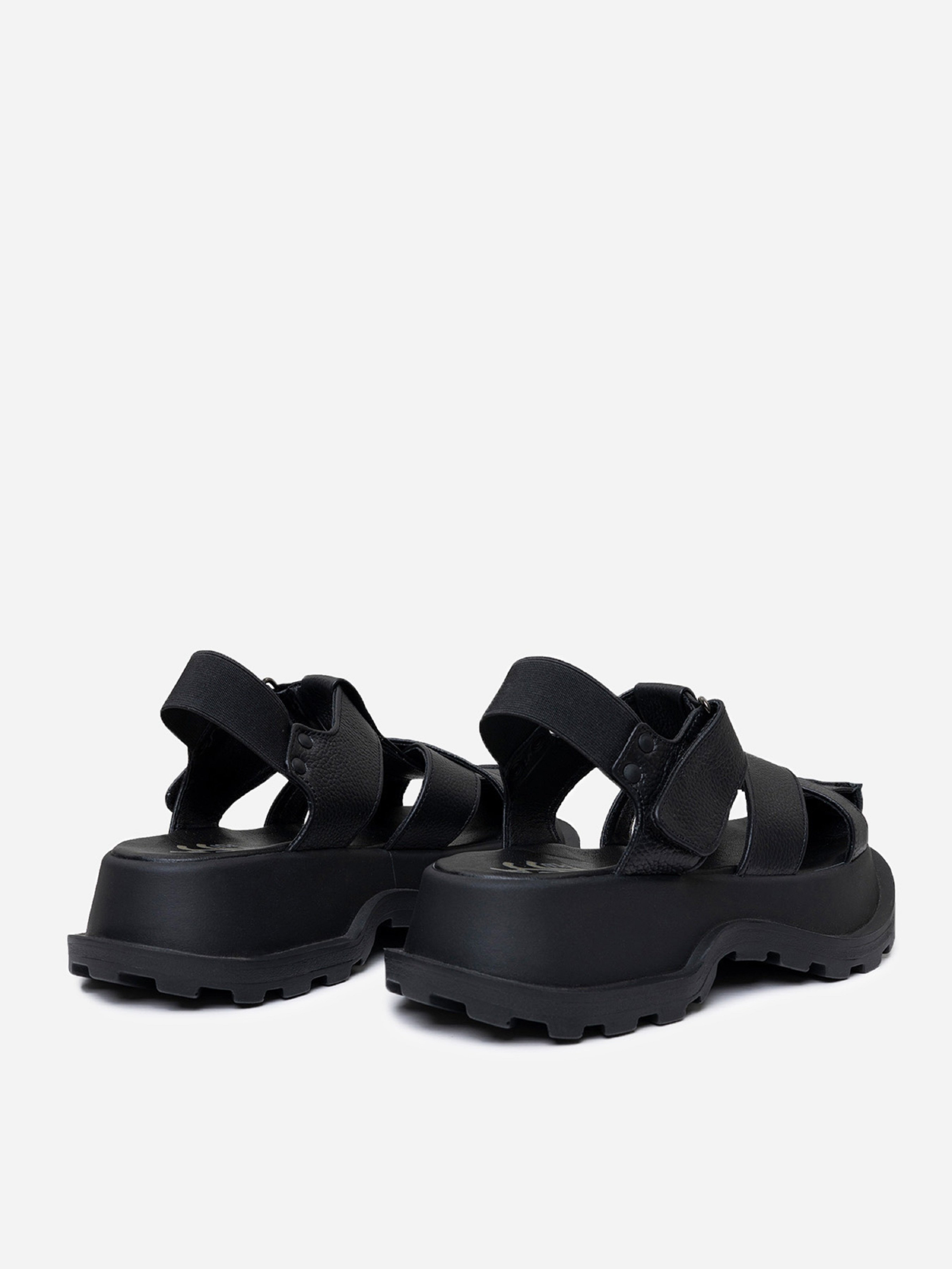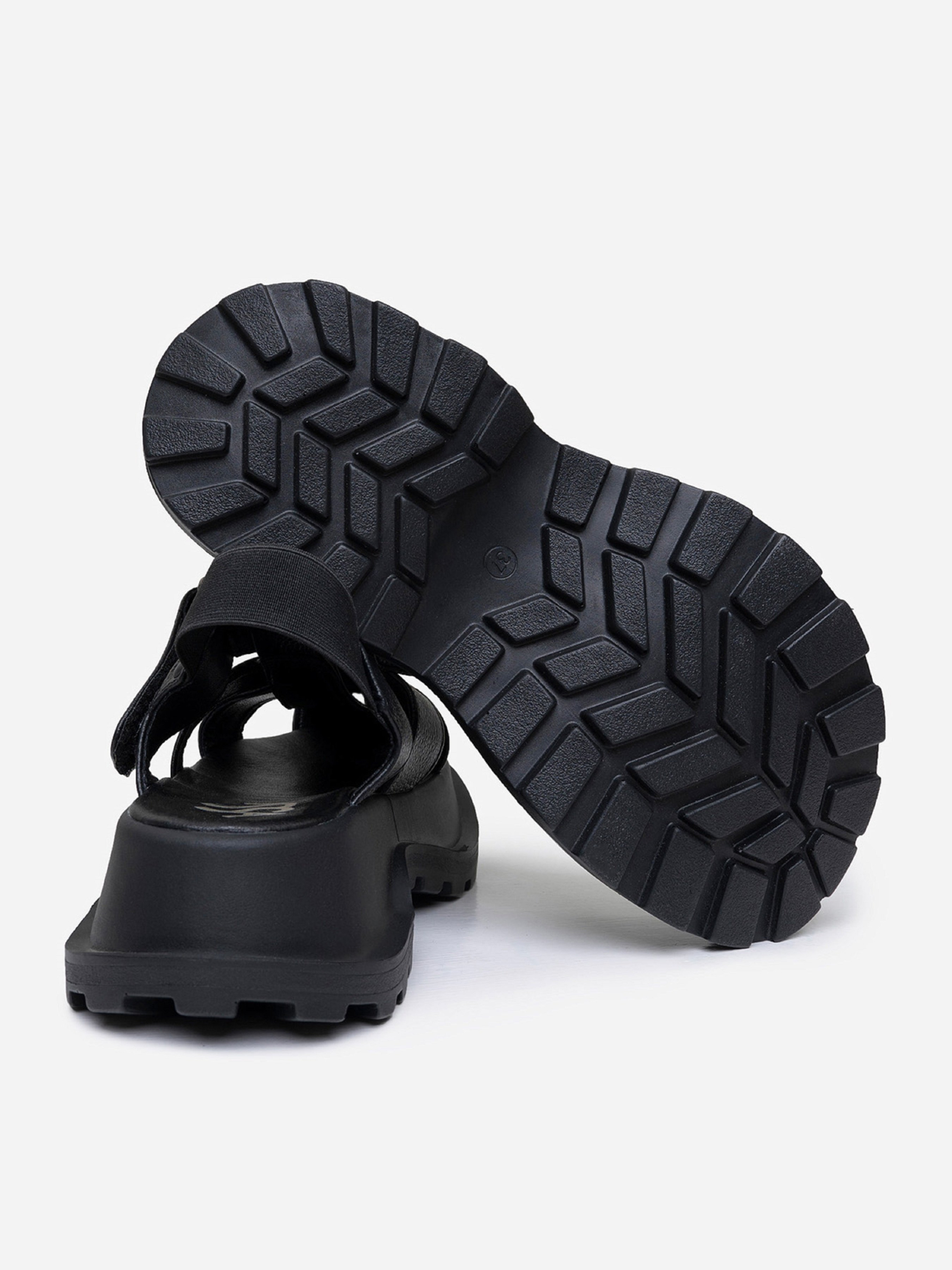 Черные босоножки на высокой подошве с протектором. Модель из натуральной замши с резинкой на заднике и липучкой. Материал верха: натуральная кожа. Подклад: натуральная кожа. Подошва: EVA (Эва). Высота подошвы: 5 см и 4,5 см. Ширина пучков: 8,5 см. Замеры: 36 (23), 37 (23,5), 38 (24), 39 (24,5), 40 (25), 41 (25,5)