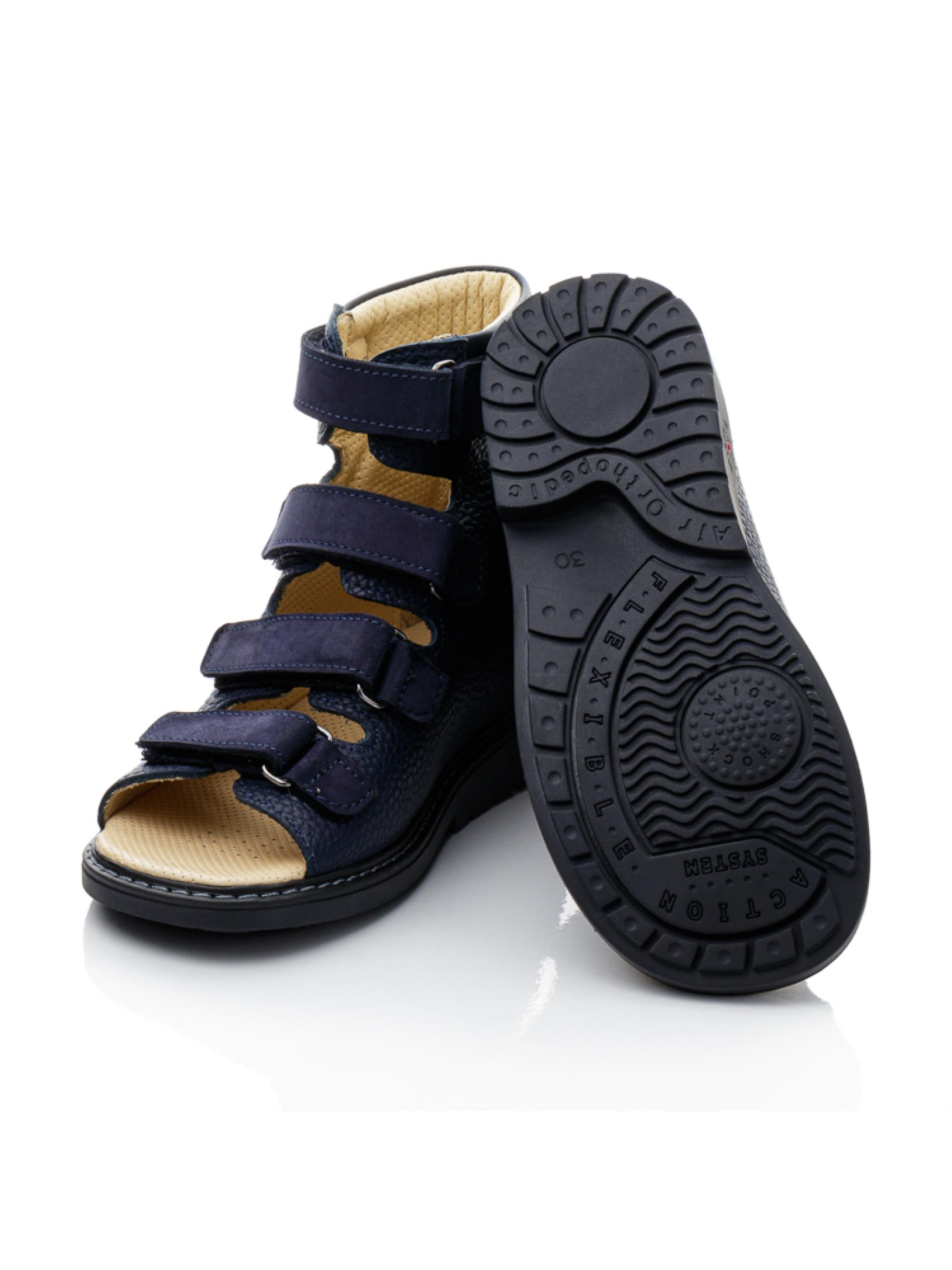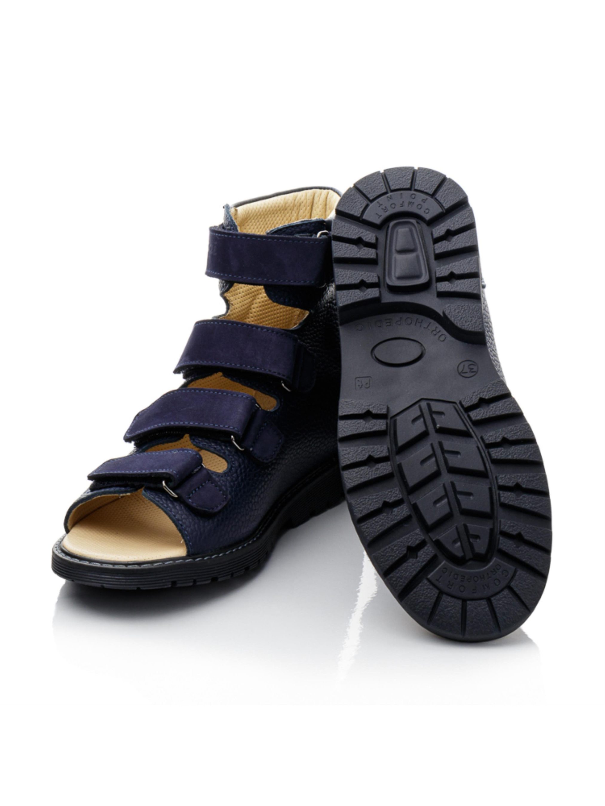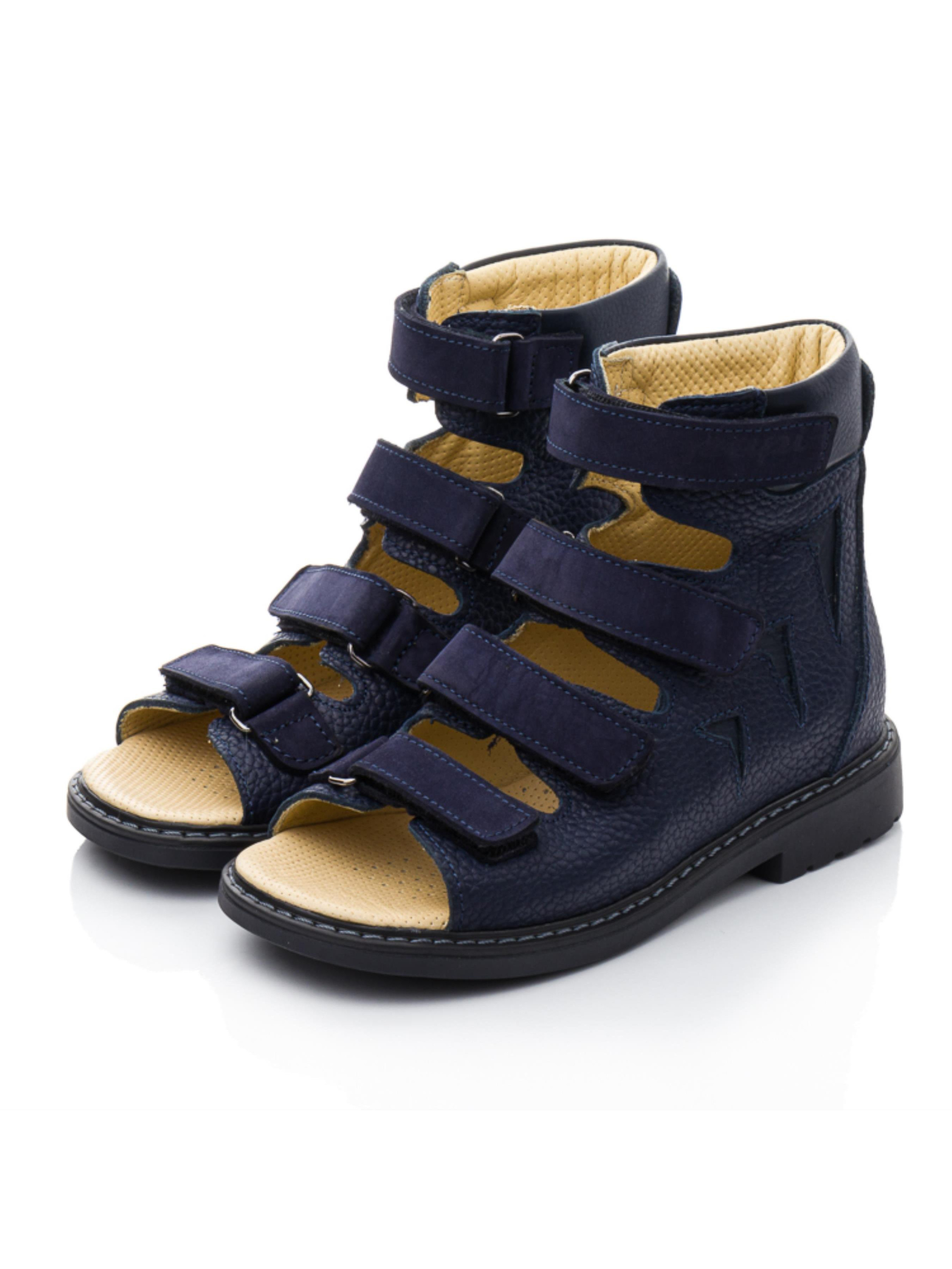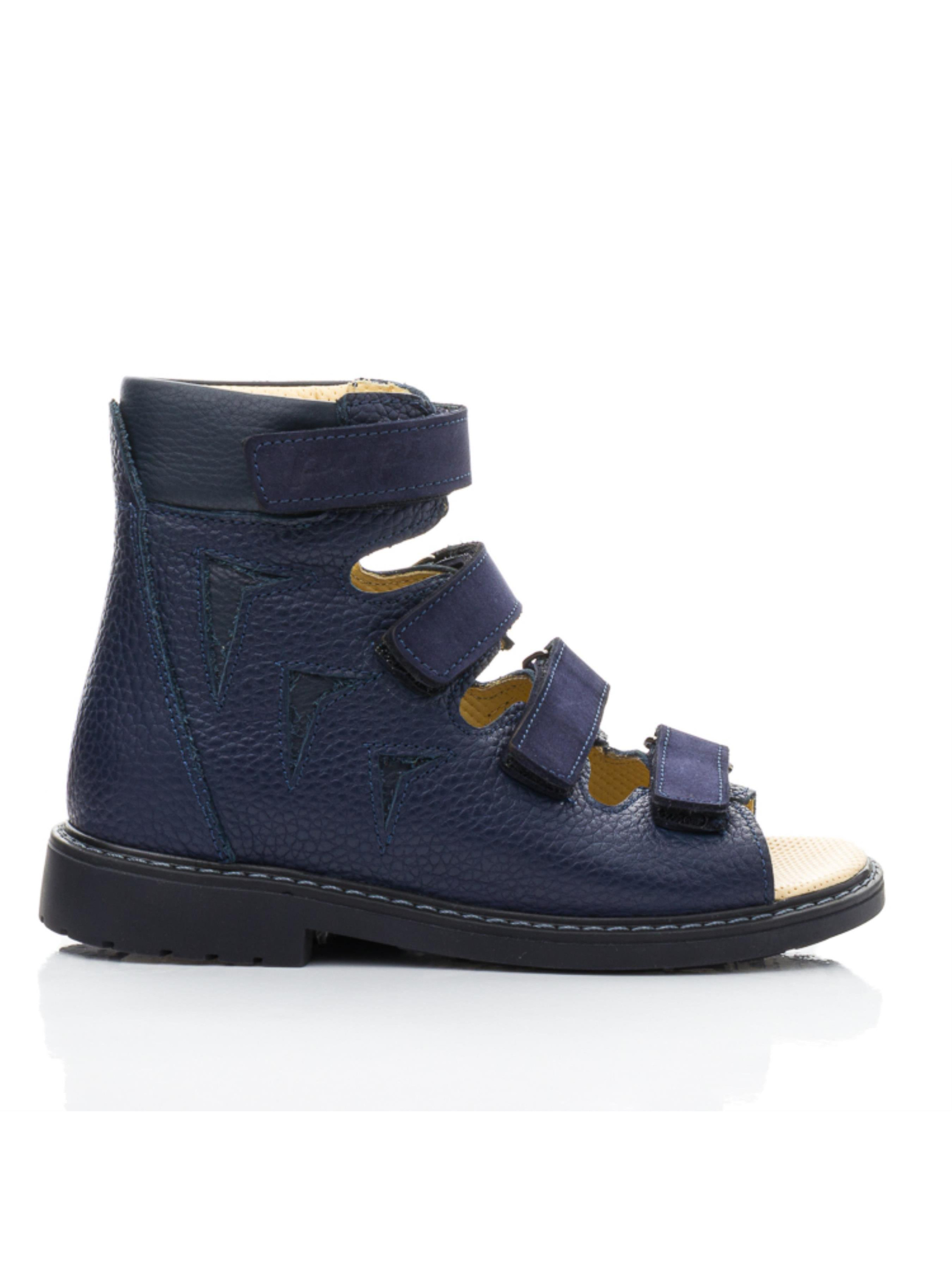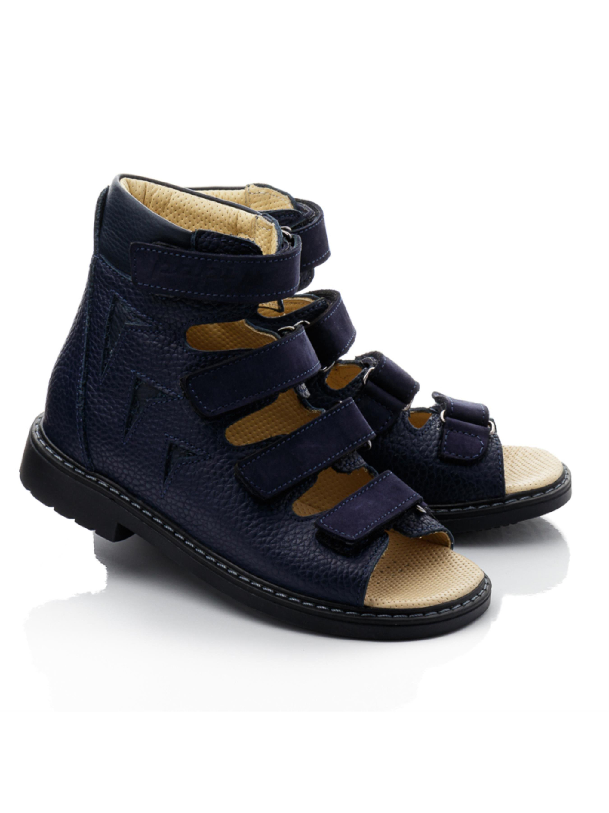 Ортопедические босоножки для мальчика – поддержка и комфорт на каждый день Эта модель разработана с учетом правильного формирования стопы и максимального удобства. Высокий верх из натуральной кожи обеспечивает надежную фиксацию, поддерживая голеностоп, а четыре регулируемые липучки позволяют идеально подогнать обувь по ножке. Открытый носок способствует вентиляции, что особенно важно в теплую погоду. Глубокий синий цвет придает босоножкам стильный и универсальный вид. Уплотненная подошва снижает нагрузку на стопу и способствует правильному распределению веса при ходьбе. Отличный выбор для повседневного использования, активных прогулок и коррекции стоп.