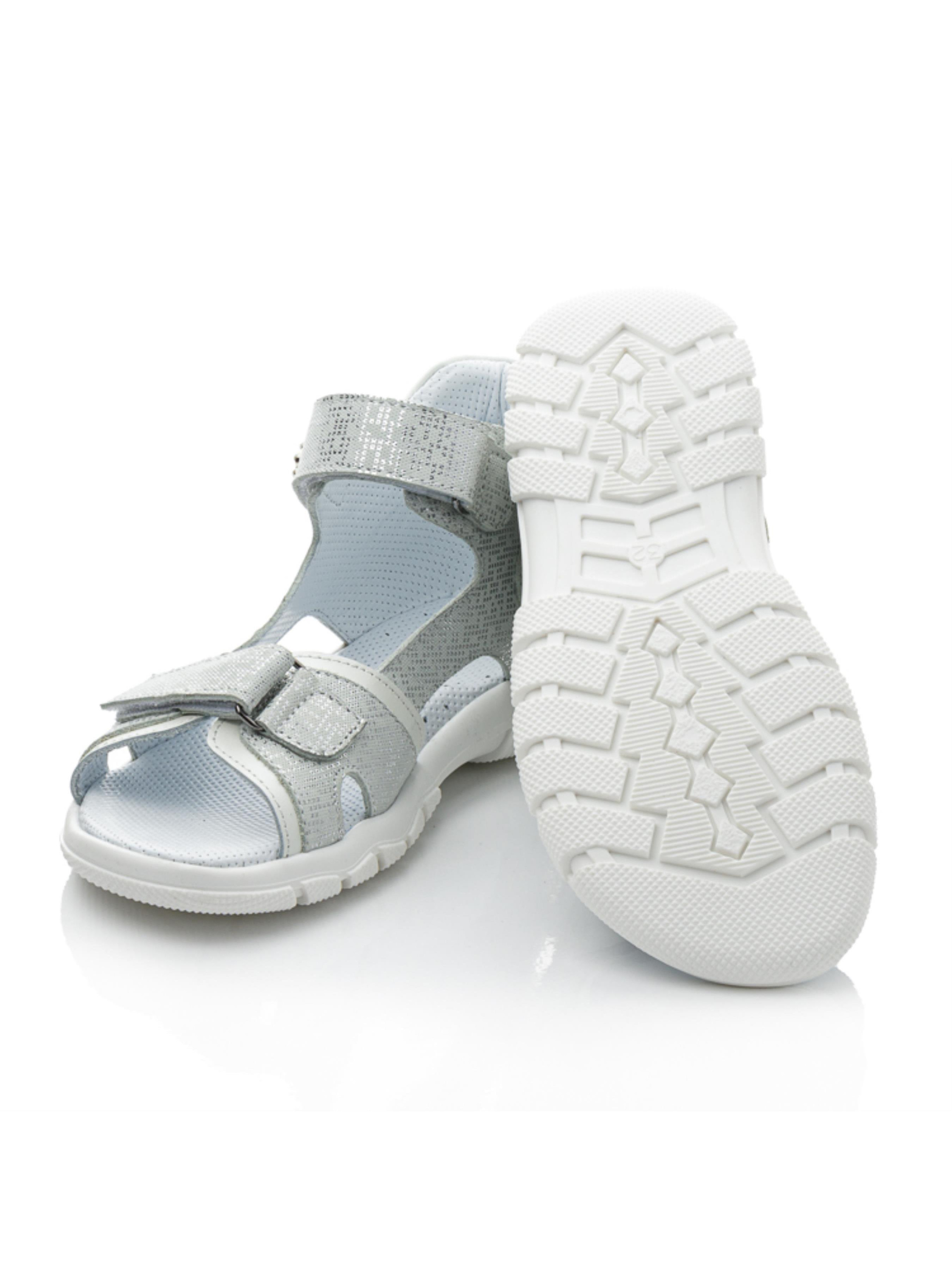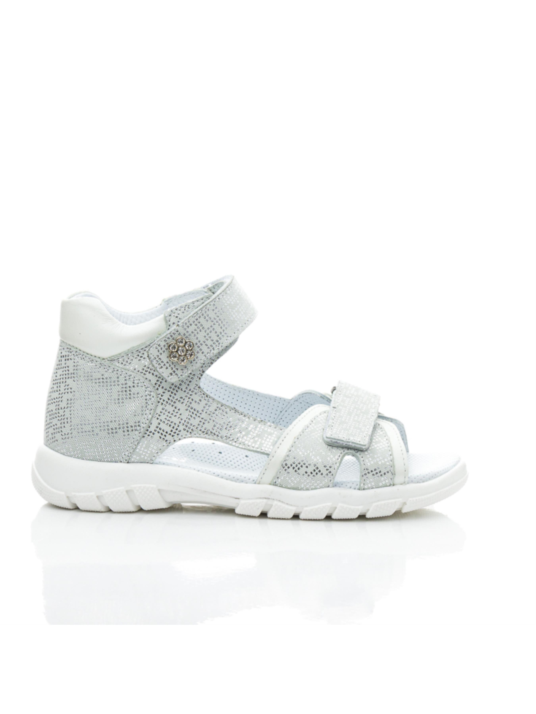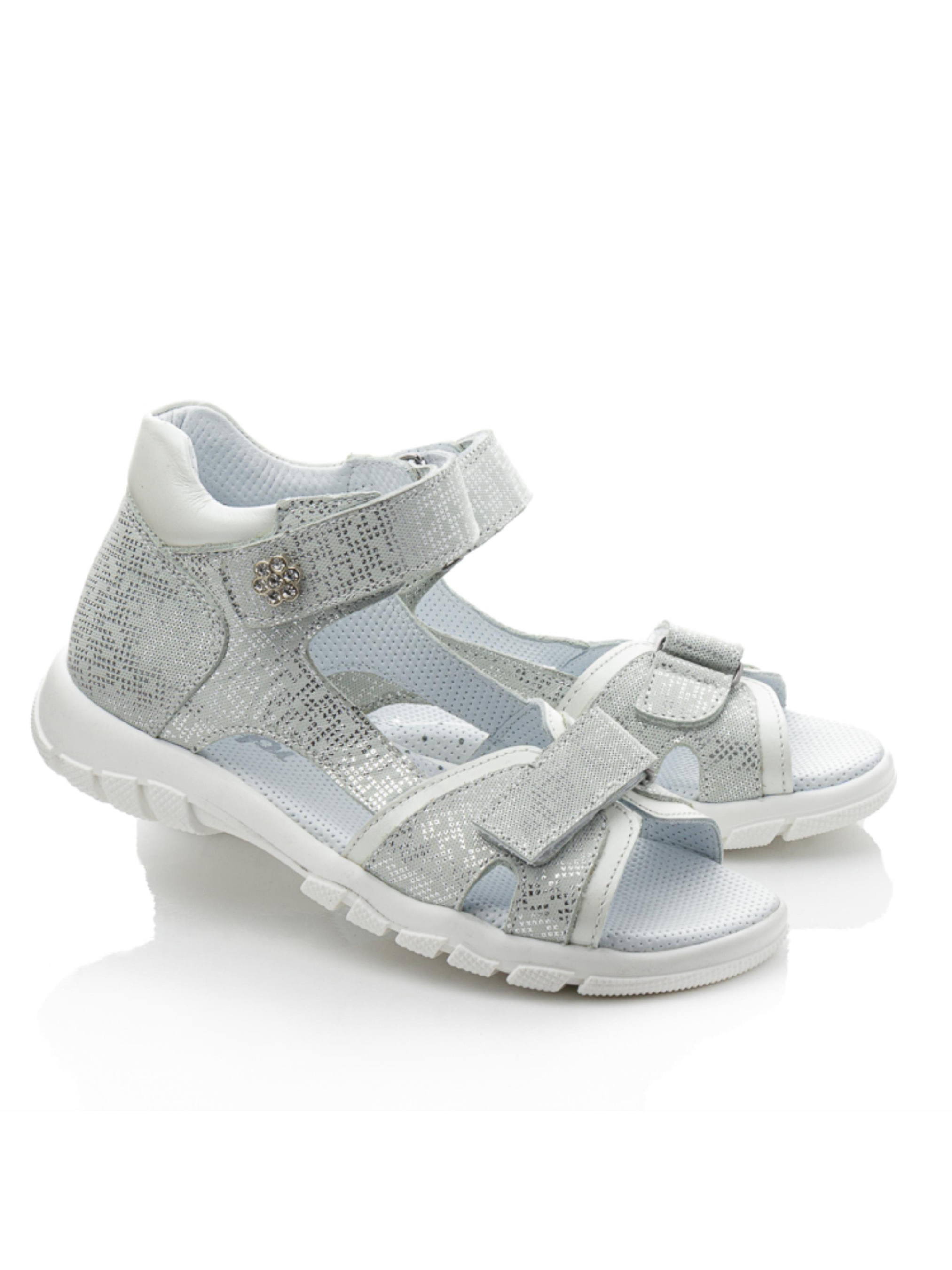 Элегантные серебряные босоножки для девочек с изысканным акцентом Эта модель сочетает в себе удобство и изысканный блеск. Босоножки выполнены из натуральной кожи с эффектным серебристым покрытием, которое придает обуви праздничный вид. Легкая и гибкая подошва делает их идеальными для долгих прогулок и активного отдыха. Дополнительный штрих – декоративный камешек на липучке, который добавляет нотку элегантности. Надежная фиксация и мягкая кожаная подкладка обеспечивают максимальный комфорт. Прекрасный выбор для маленьких модниц, которые хотят выглядеть стильно каждый день.