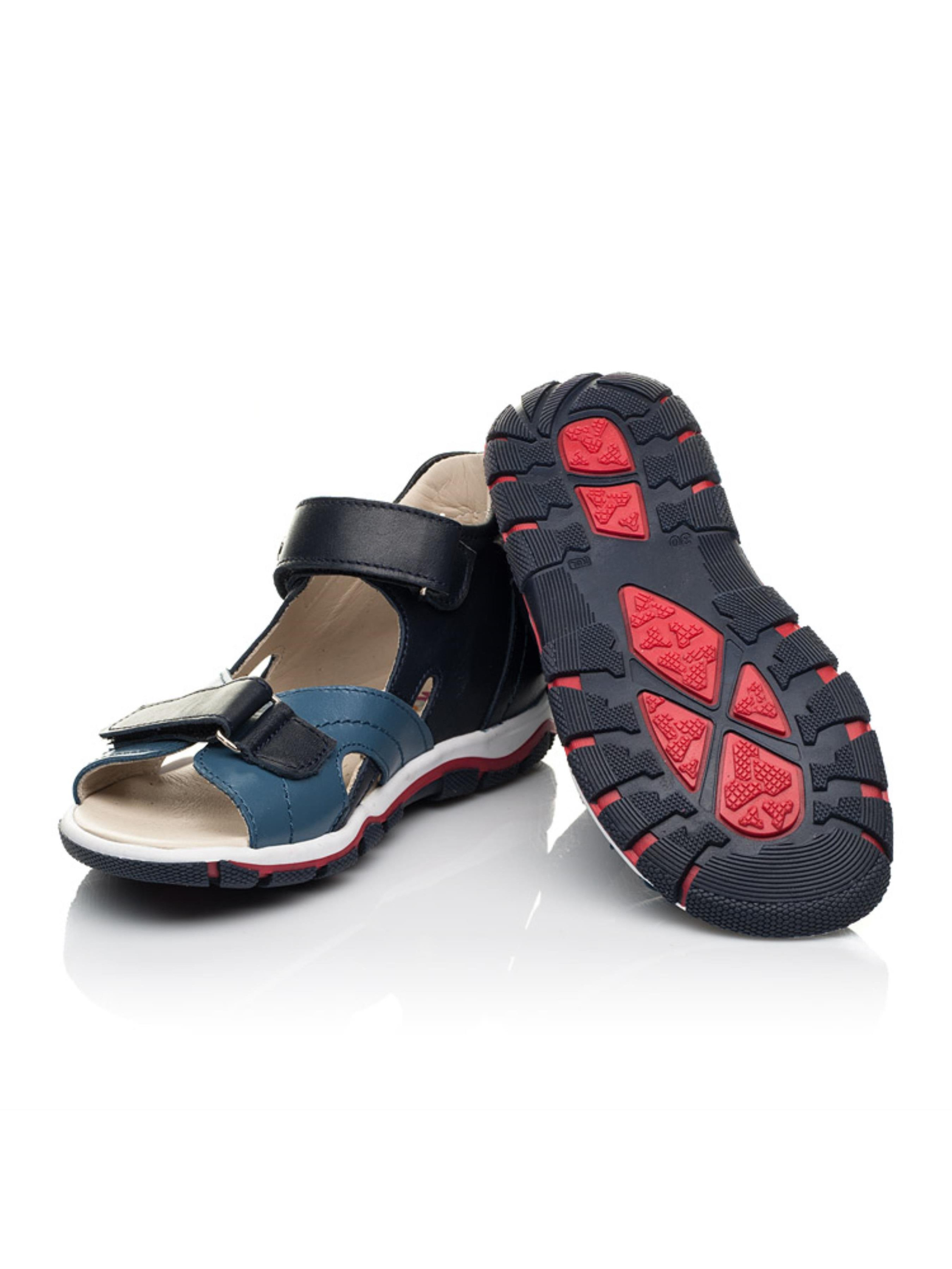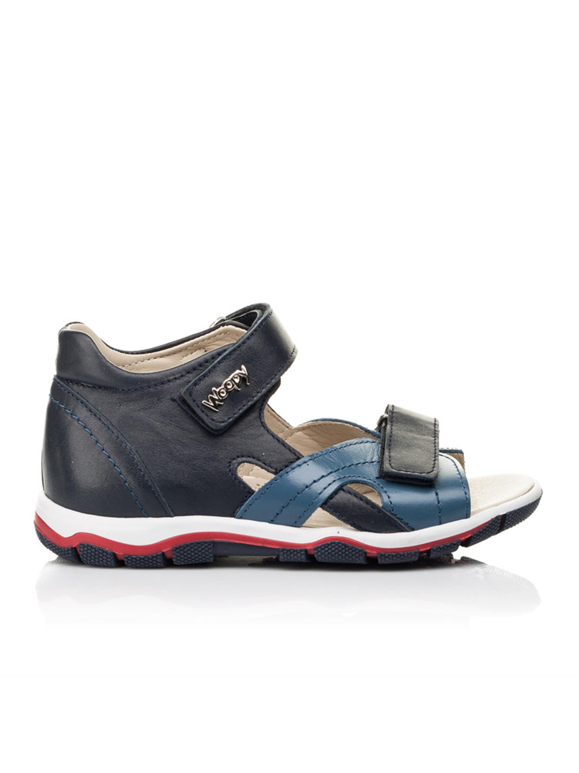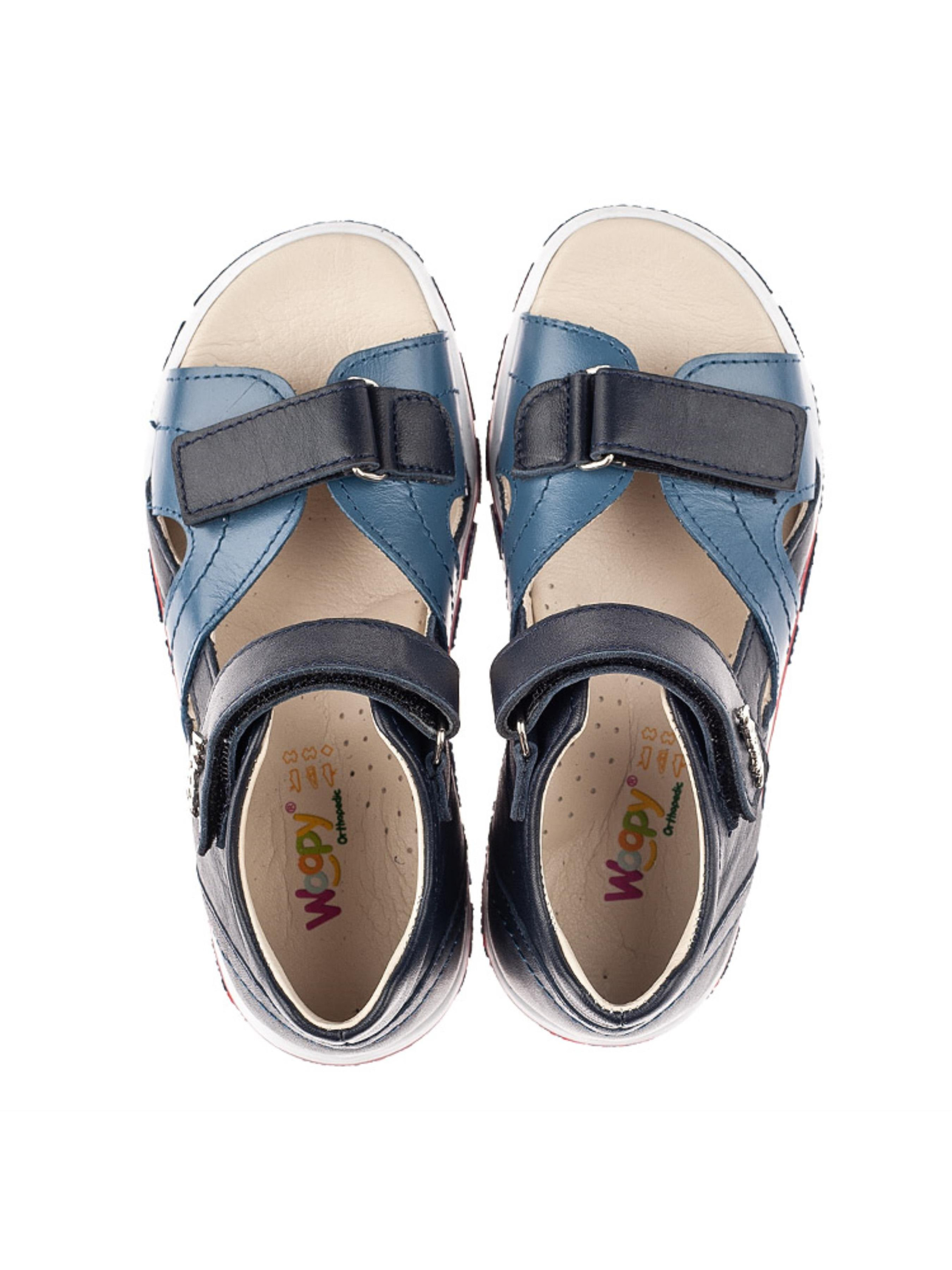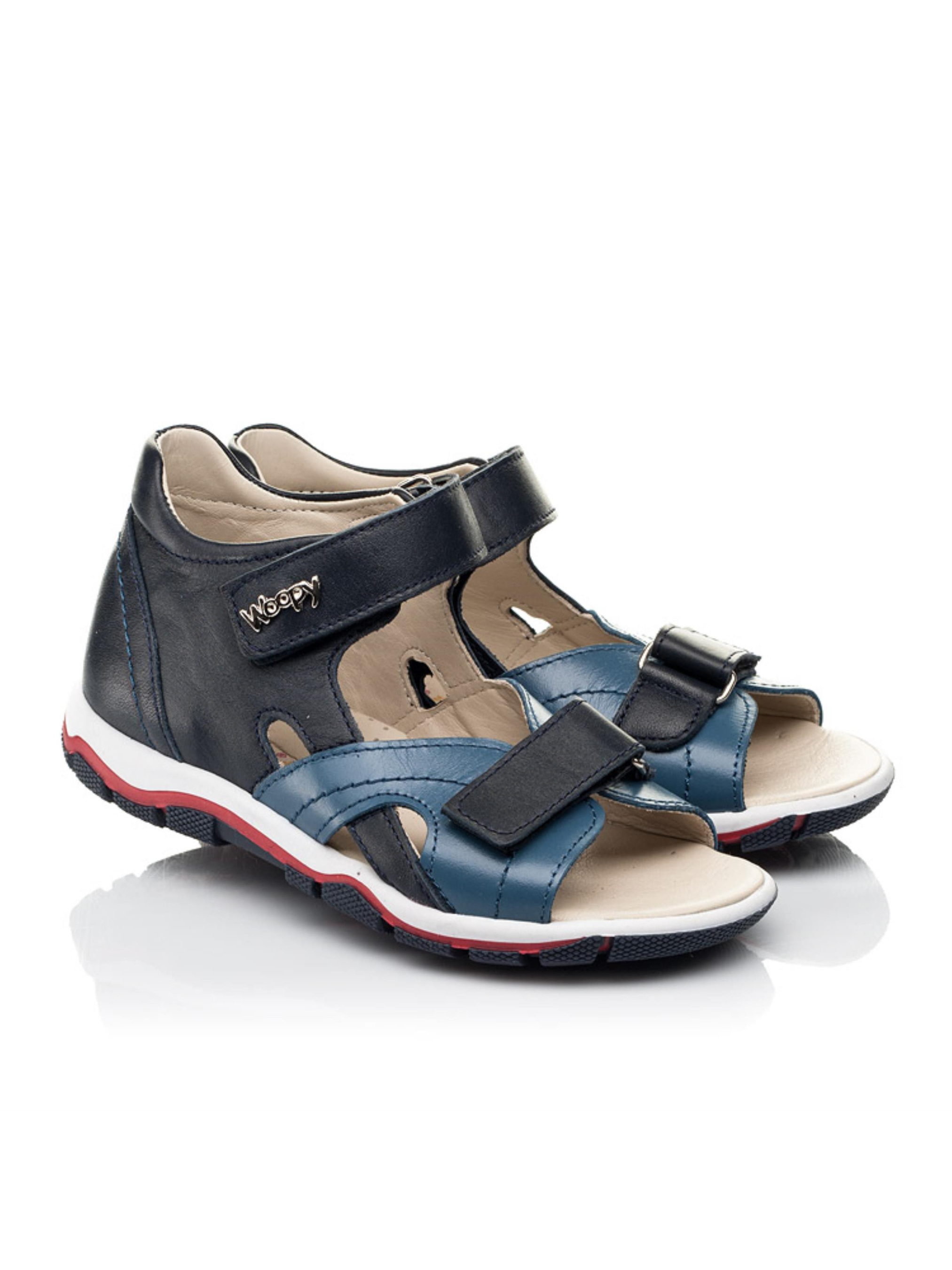Качественные, легкие и практичные детские босоножки для мальчика от бренда Woopy пошиты из натуральной кожи синего цвета двух оттенков. Материал подкладки и стельки - натуральная гладкая кожа. Дизайн дополнено изысканной и аккуратной прошивкой по поверхности обуви. Удобство и скорость обувания обеспечат две застежки-липучки (нижняя липучка позволит отрегулировать полноту ножки). Подростковые босоножки для мальчика имеют такие важные ортопедические элементы детской обуви: жесткий задник, супинатор и анатомическую стельку. Все эти элементы важны для правильного положения ножки в обуви. Подошва в босоножках легкая и гибкая, отлитая из качественной термопластичной резины.