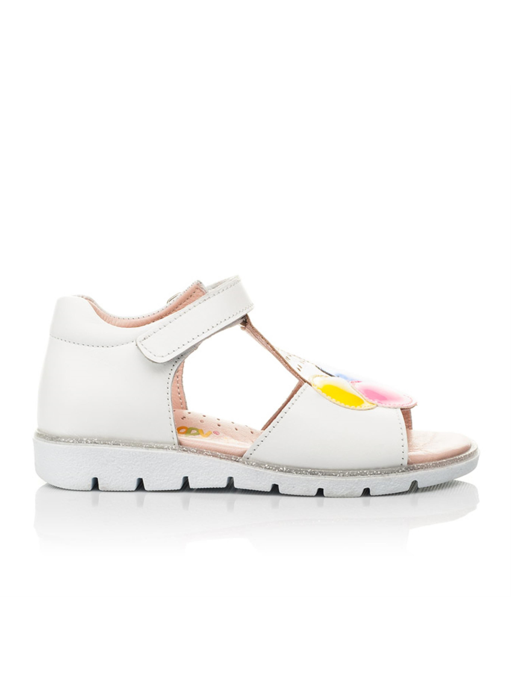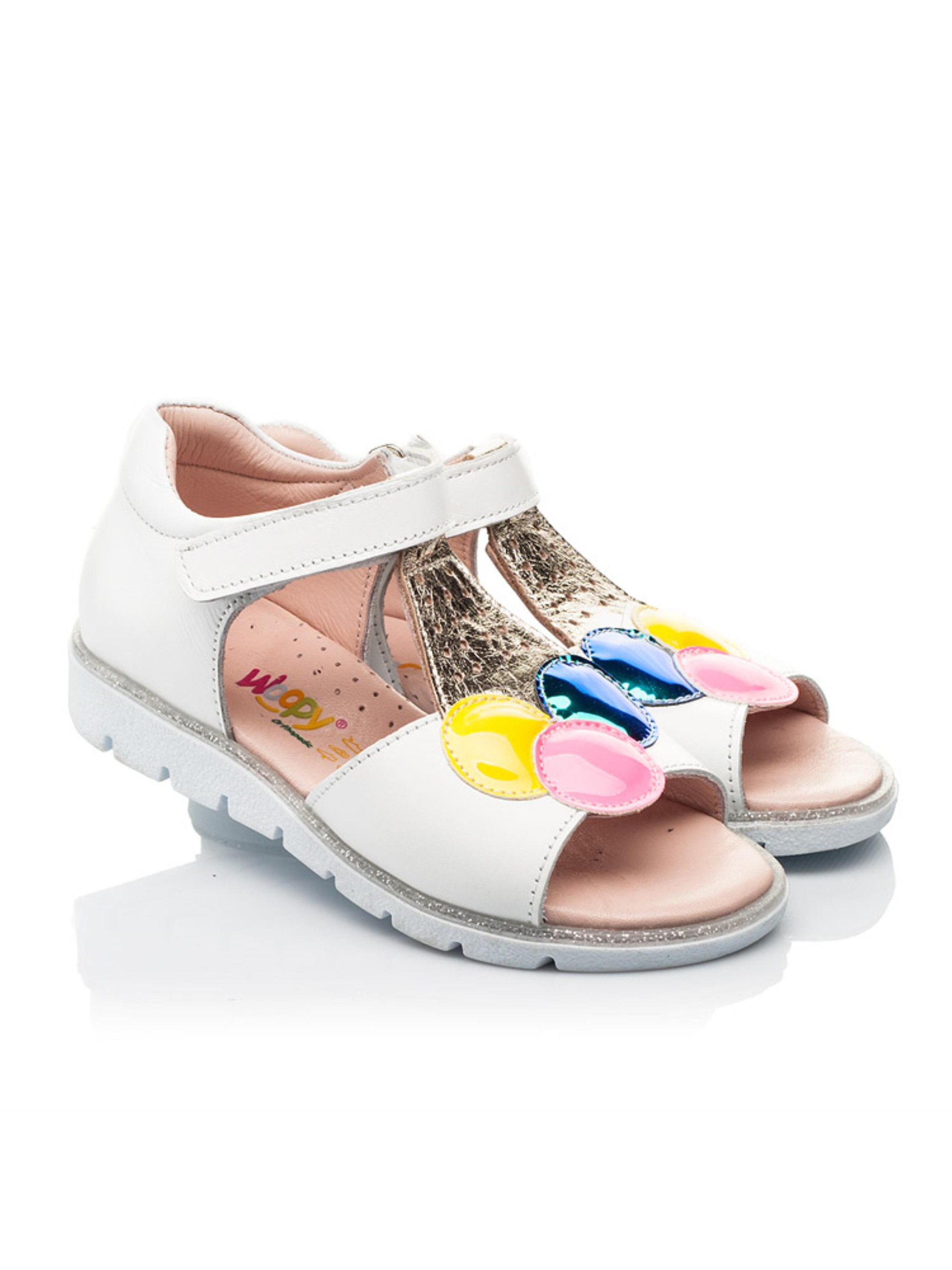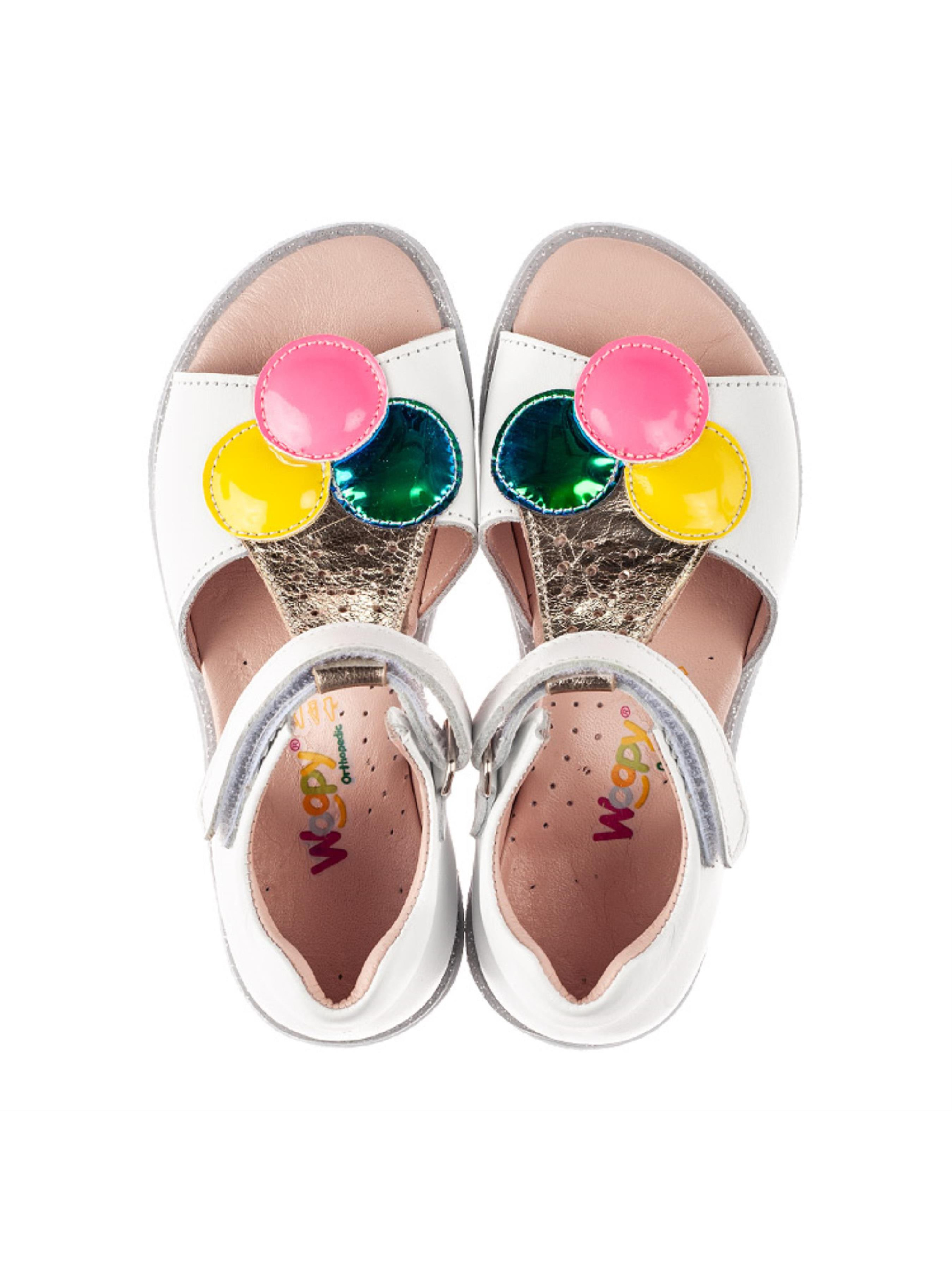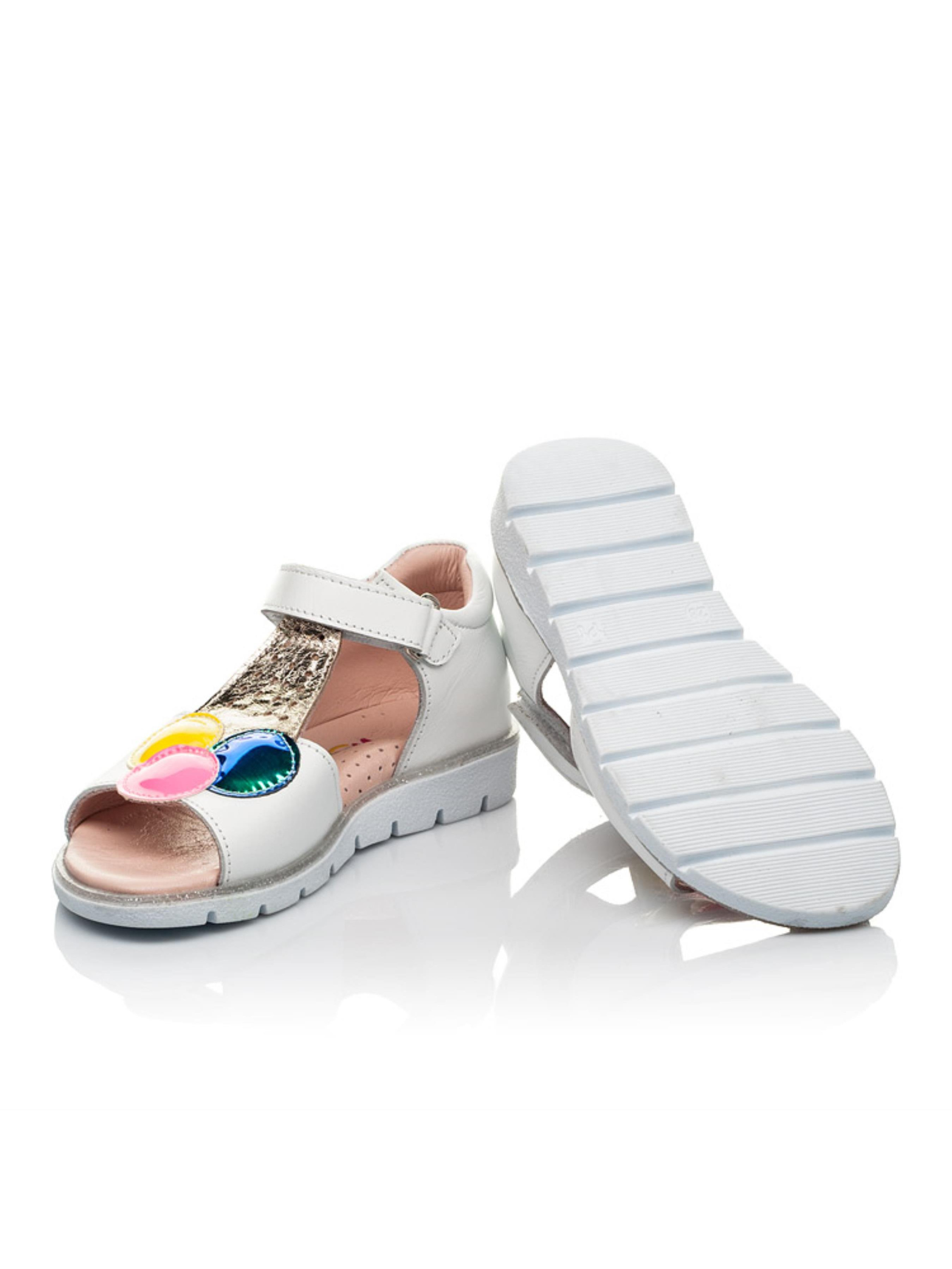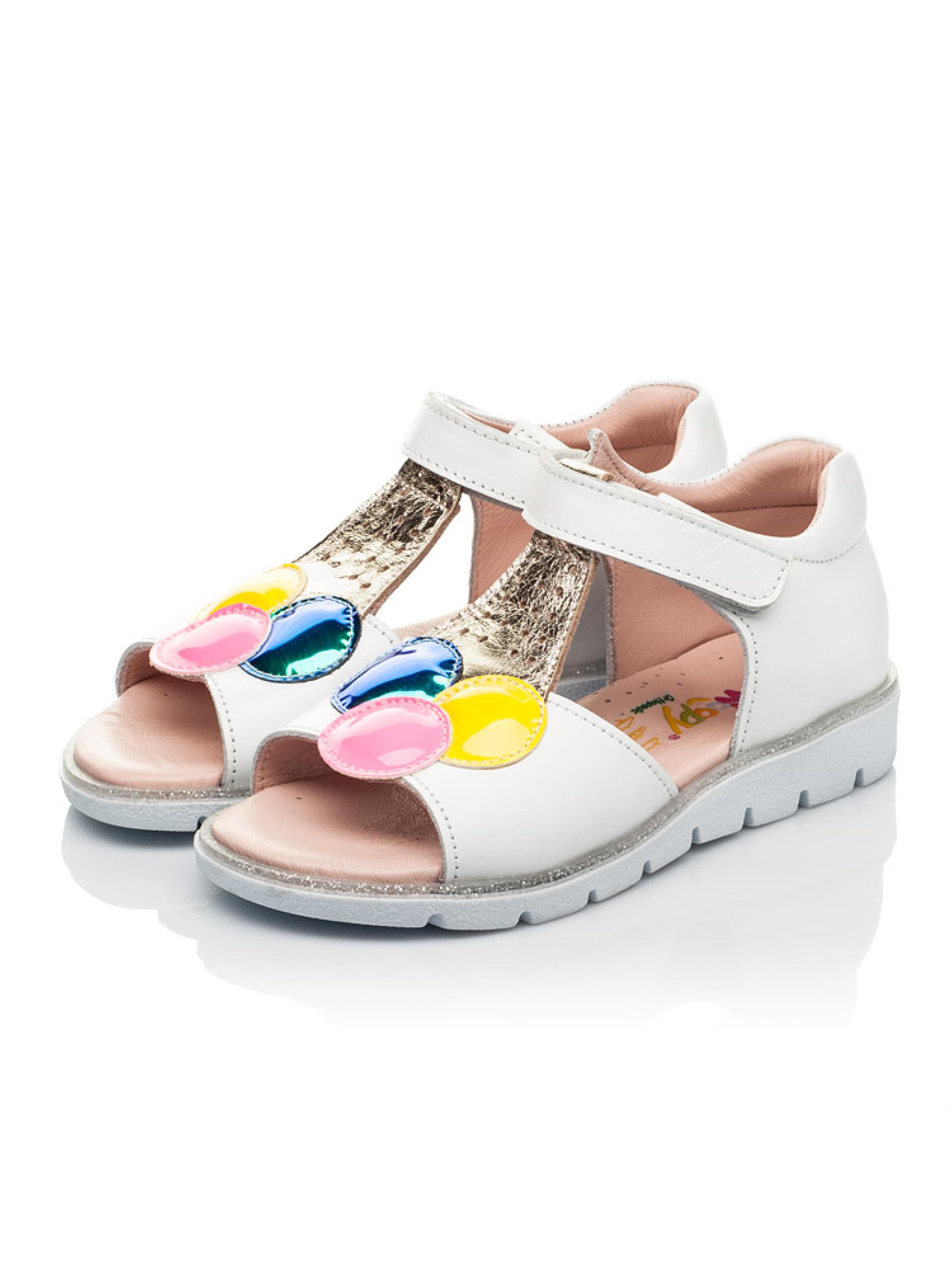 Это не просто босоножки, а настоящее ощущение лета уже сейчас. Такой модели детских босоножек Вы точно не встречали ни в одном магазине. Модель чрезвычайно популярна и не удивительно, ведь поражает дизайном и качественными характеристиками. Детские босоножки для девочки пошиты из натуральной кожи сдержанного белого цвета. Материал подкладки и стельки - натуральная кожа. Нотку летнего настроения вносит сочное мороженое желтого, розового и зелено-синего цвета. Изысканные шарики мороженого созданные из высококачественного современного искусственного материала. Вафельный стаканчик пошито из натуральной кожи золотистого цвета. Комфорт детским стопам гарантируют такие элементы детской обуви: жесткий задник, анатомическая стелька с подушечкой под свод стопы. Максимальную легкость обеспечит легкая и гибкая подошва, которая оснащена декоративным кантом с серебряными блестками. Способ застегивания - надежная липучка.