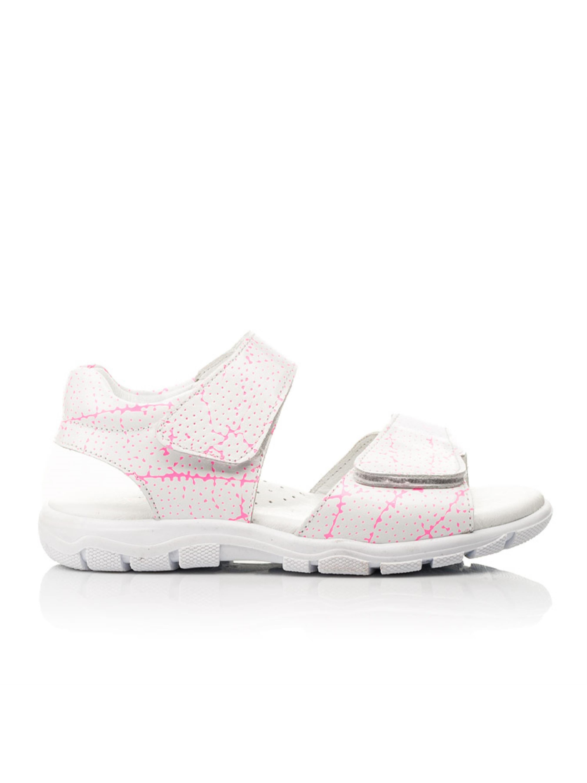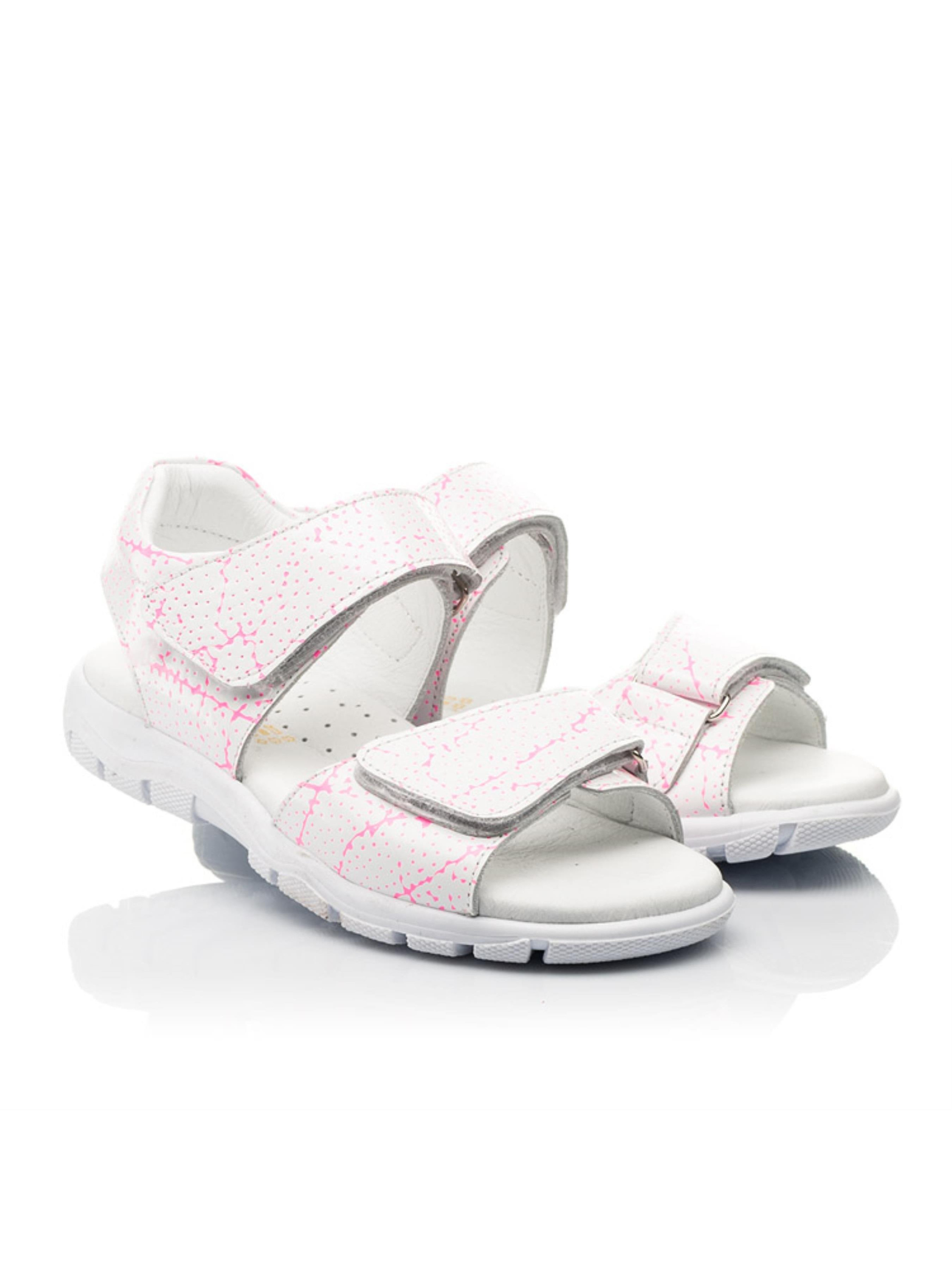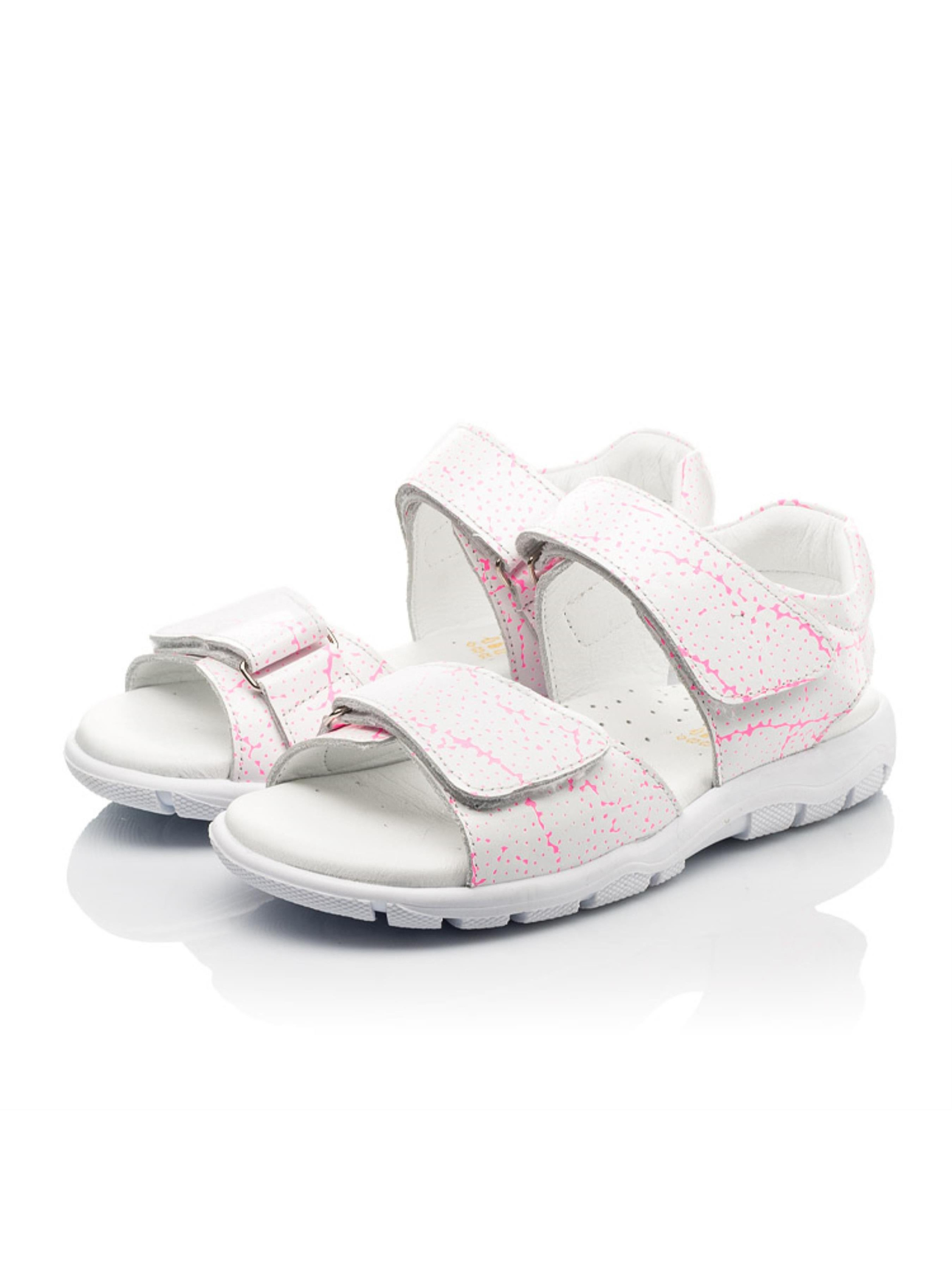 Открытые детские босоножки для девочки пошиты из натуральной лакированной кожи белого цвета. Стелька и подкладка в модели пошиты из натуральной гладкой кожи. Чтобы детским ножкам было максимально комфортно в активных прогулках, босоножки для девочки имеют анатомически правильную стельку с подушечкой под возведение стопы, легкую и гибкую подошву. В качестве застежки для ускорения обувания используется надежная липучка. Нижняя липучка-застежка позволит отрегулировать полноту ножки и обеспечит надежную фиксацию ножки в босоножках. Особенностью модели выступает уникальный принт в виде вкраплений и линий розового цвета.