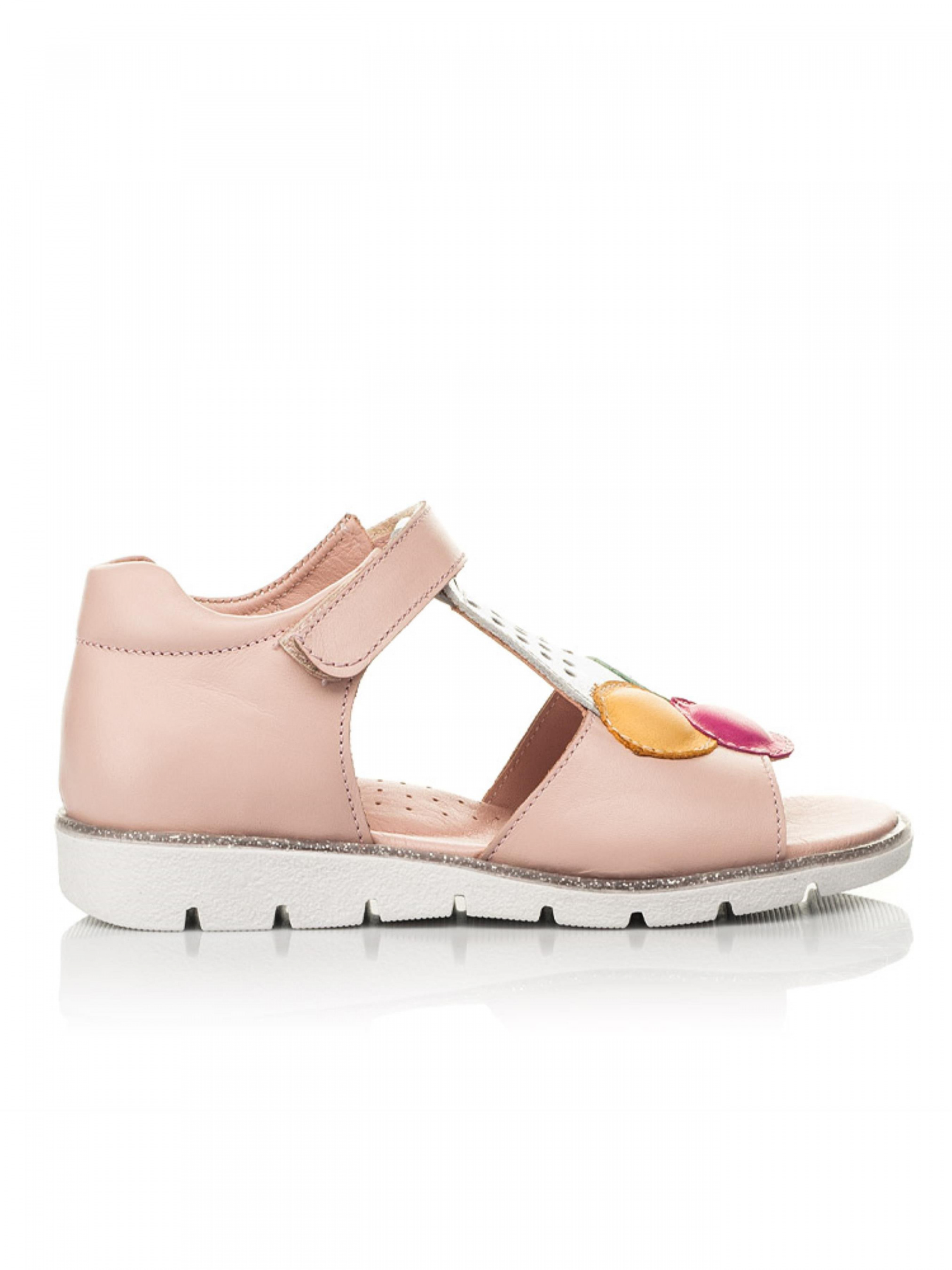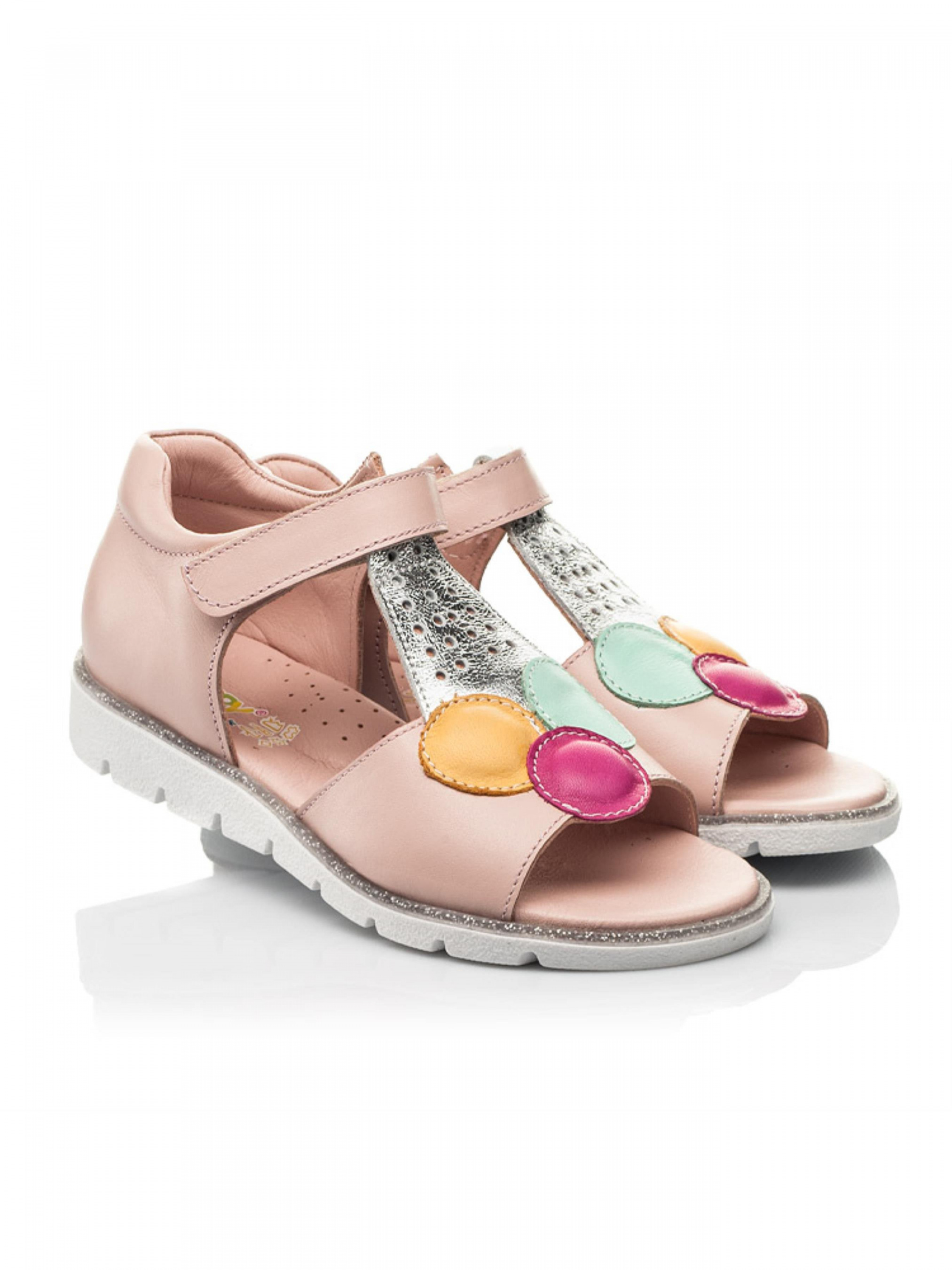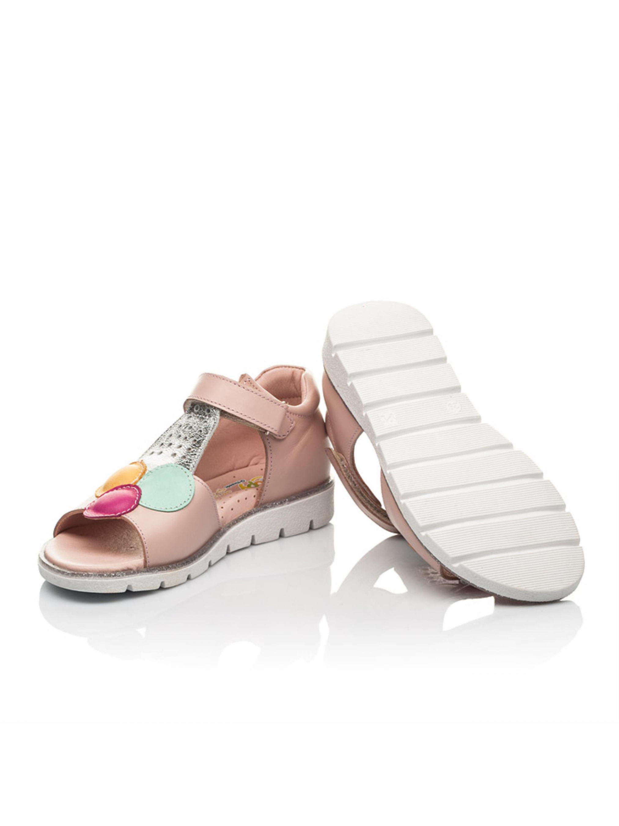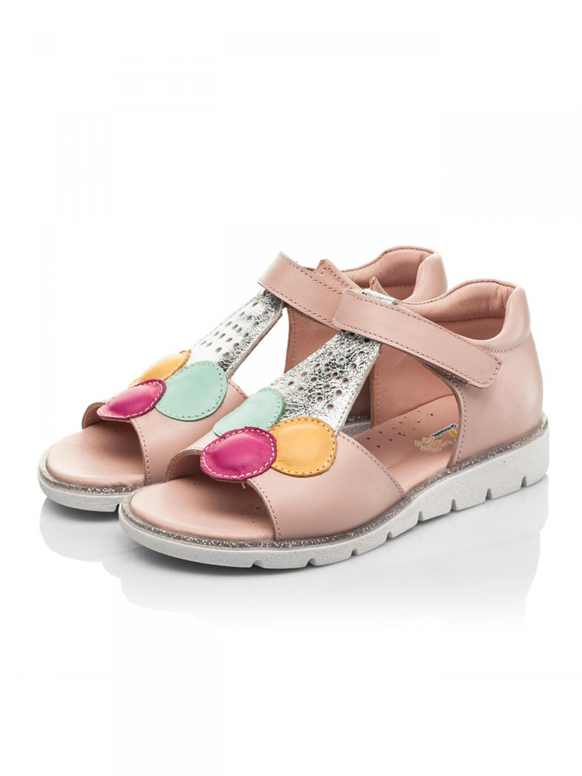 Перед Вами модель босоножек, которая не потеряет свою актуальность – неповторимые босоножки с изображением мороженого. Детские босоножки для девочки пошиты из натуральной кожи пудрового цвета, материал подкладки и стельки - натуральная кожа. Босоножки для девочки имеют максимально комфортную для детской ножки подошву (она легкая и гибкая), жесткий задник, супинатор и анатомически правильную стельку. Подошва в босоножках по периметру украшена декоративным кантом с блестками. Безусловным украшением модели выступает изображение шаров мороженого голубого, розового и желтого цветов в изысканном стаканчике серебряного цвета из натуральной кожи. Босоножки для девочки в качестве застежки имеют надежную липучку, которая ускорит процесс обувания.